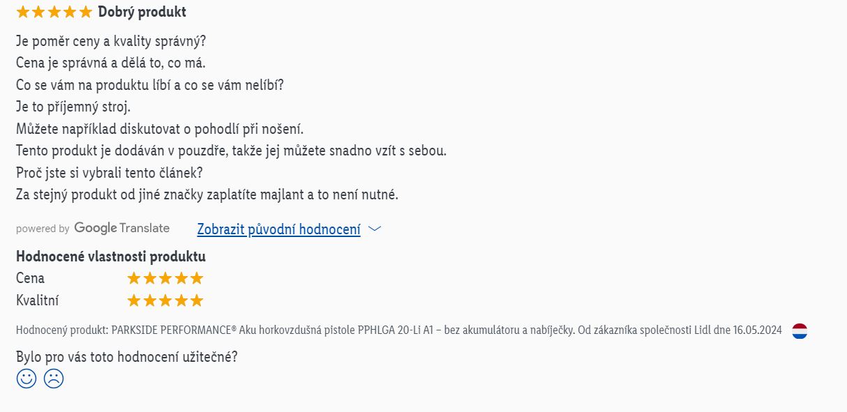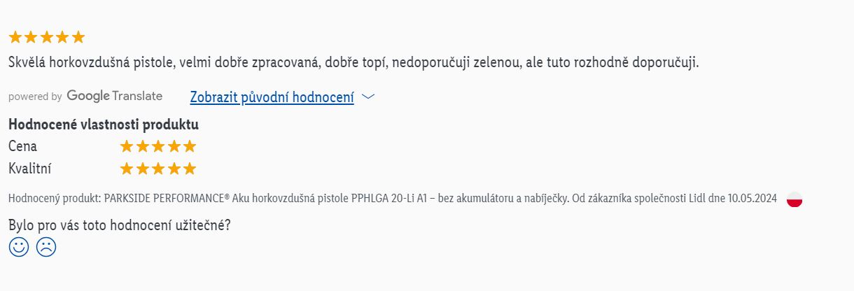 Z prvních uživatelských hodnocení na Lidl-shopu se dozvídáme, že aku horkovzdušná pistole Parkside Performance PHLGA 20-Li A1 je povedený produkt. Podle uživatelů je velmi dobře zpracovaná, výborně hřeje a její výkon je výrazně vyšší než u základního zeleného modelu Parkside PHLGA 20-Li B1.