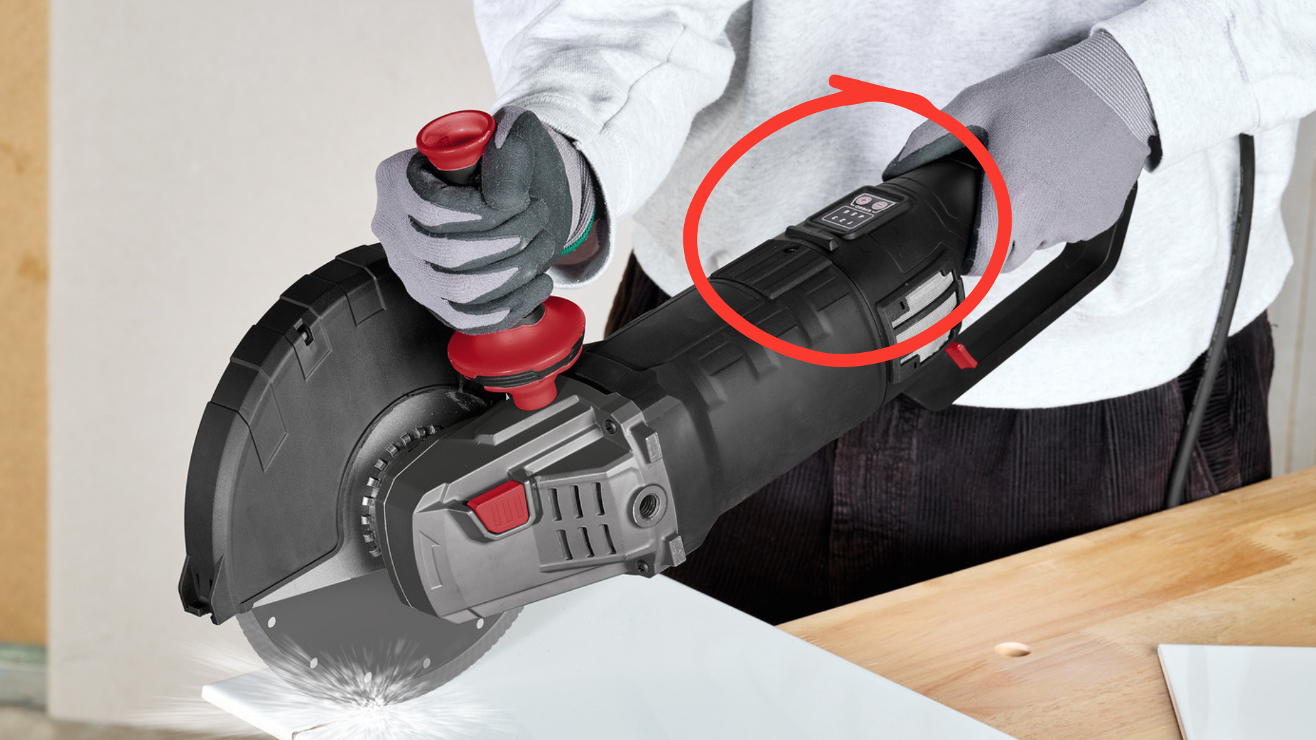 Úhlový bruska PPWS 230 A1 – ovládací panel s regulací otáček. (Parkside v poslední době rád používá malá a tuhá spínací tlačítka. V pracovních rukavicích je těžké je nahmatat a časem se mohou vymačkat. Tuto zkušenost mám například u laseru Parkside Performance z naší dílny, který se kvůli tomu po 3 letech používání obtížně vypíná.) Zdroj obrázku: Lidl