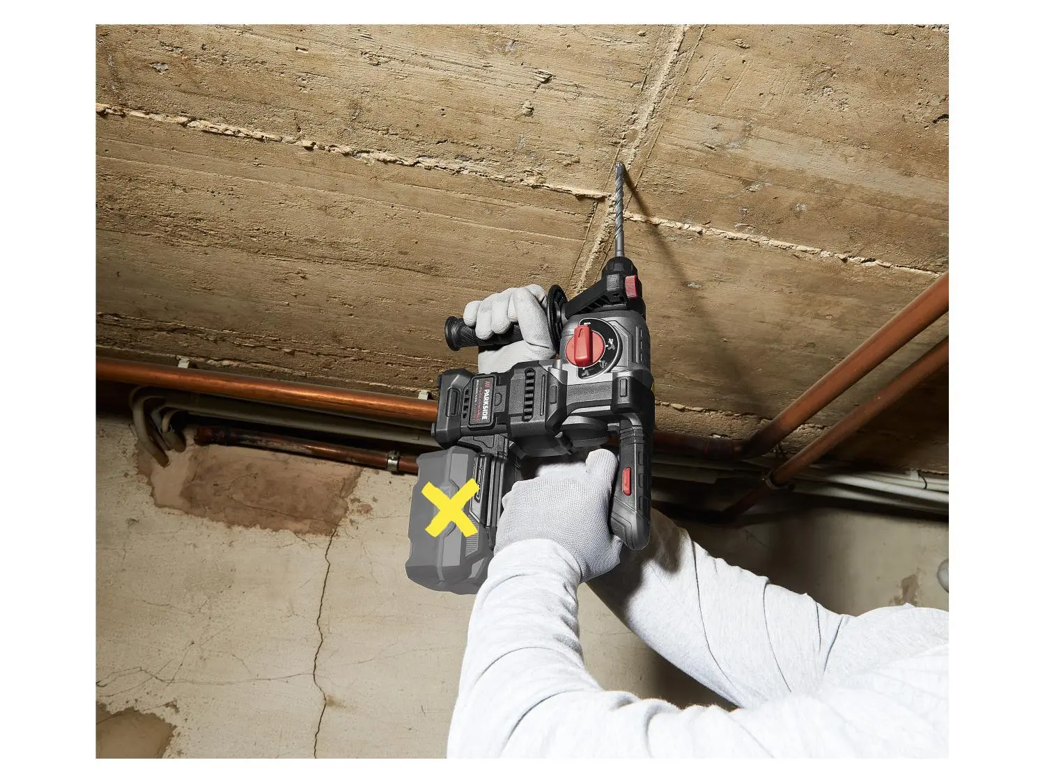 Stroj je vybaven upínacím systémem SDS Plus. Součástí balení jsou čtyři vrtáky, úložný kufr, přídavné držadlo, hloubkový doraz a tuba s mazivem. Kladivo je kompatibilní se všemi akumulátory série X 20 V Team.