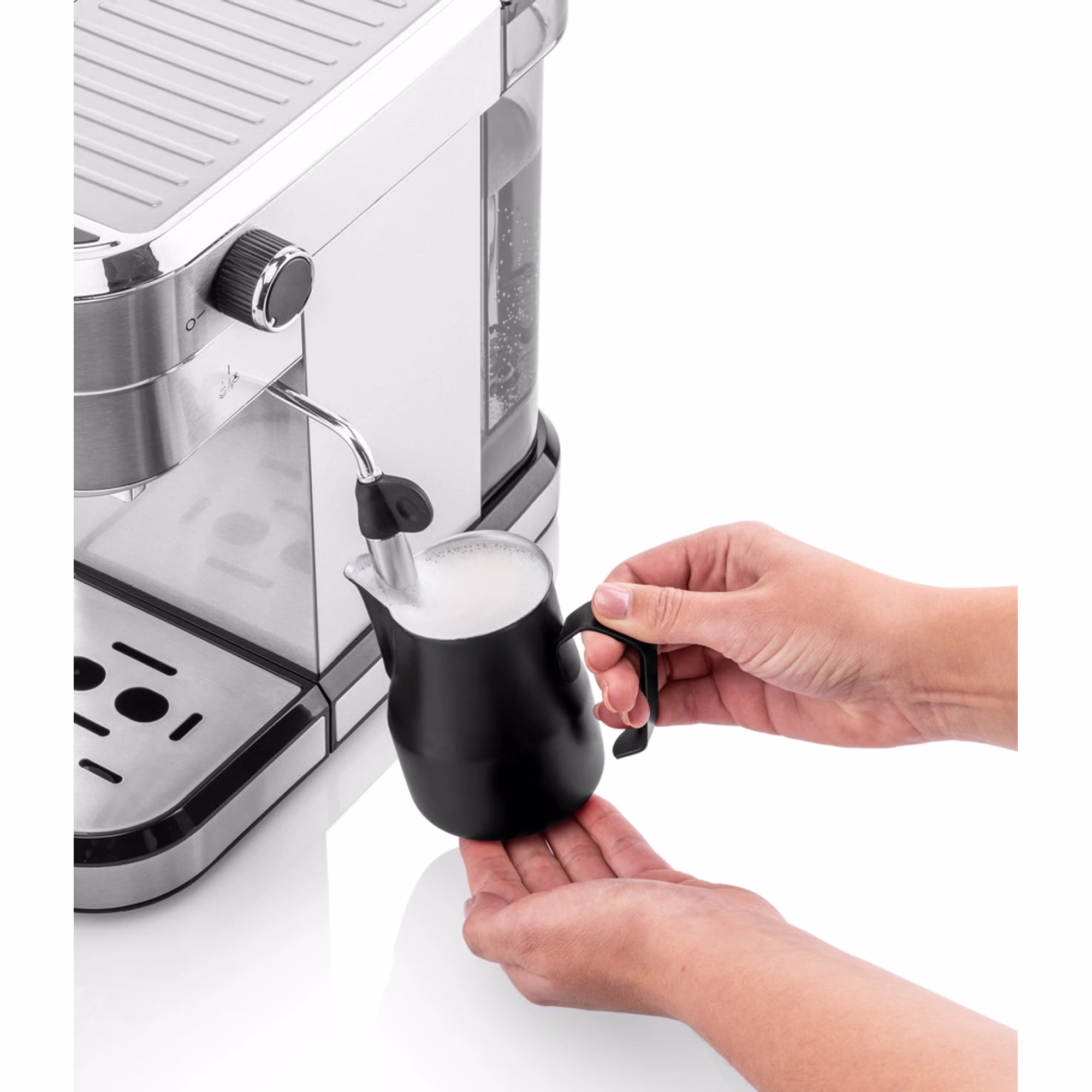 - Praktické vlastnosti – Kávovar se může pochlubit kompaktním slim designem se základnou o šířce 14,5 cm, díky kterému se vejde do každé kuchyně. Bezpečný provoz pak zajistí přetlaková tepelná pojistka.