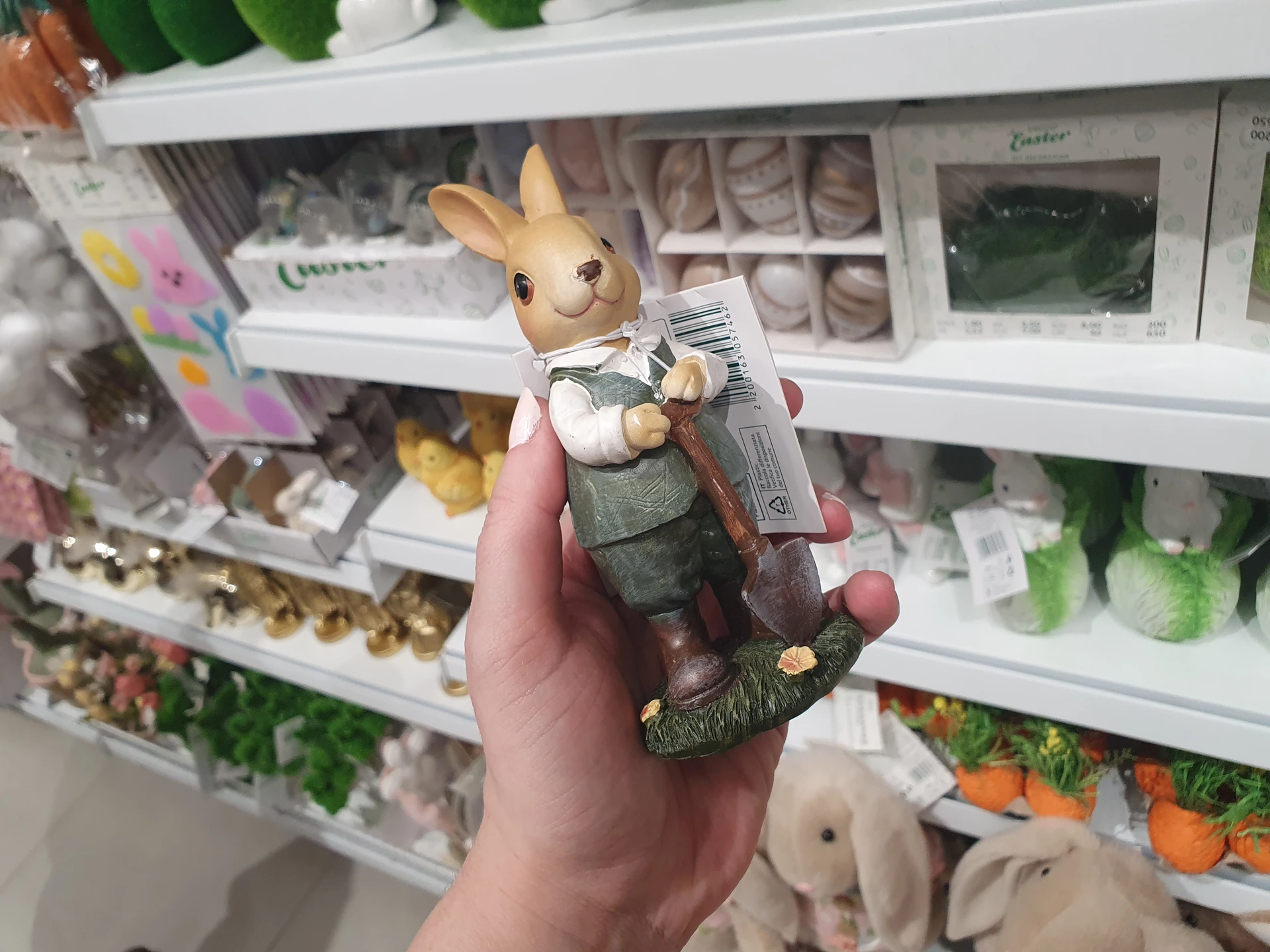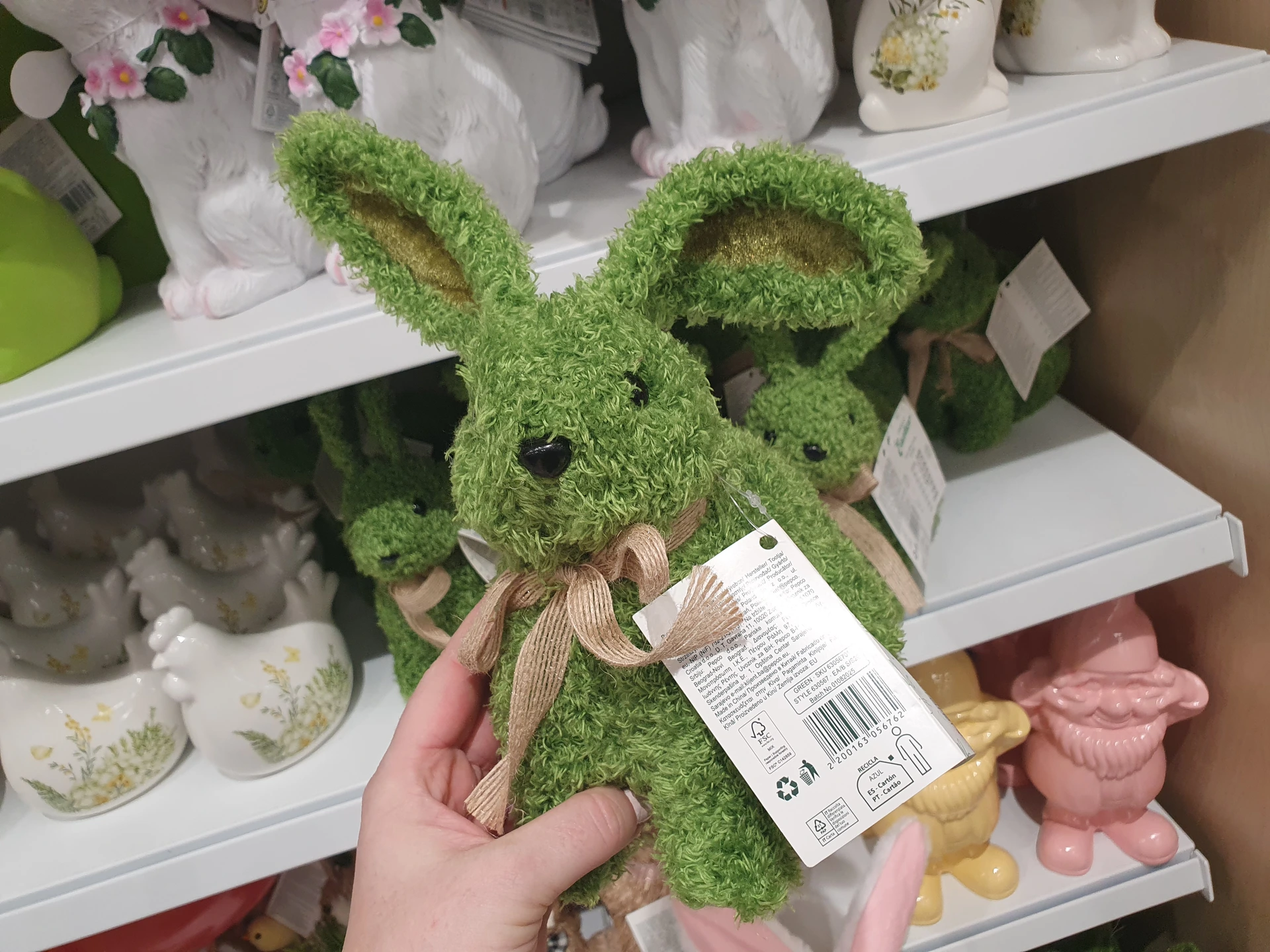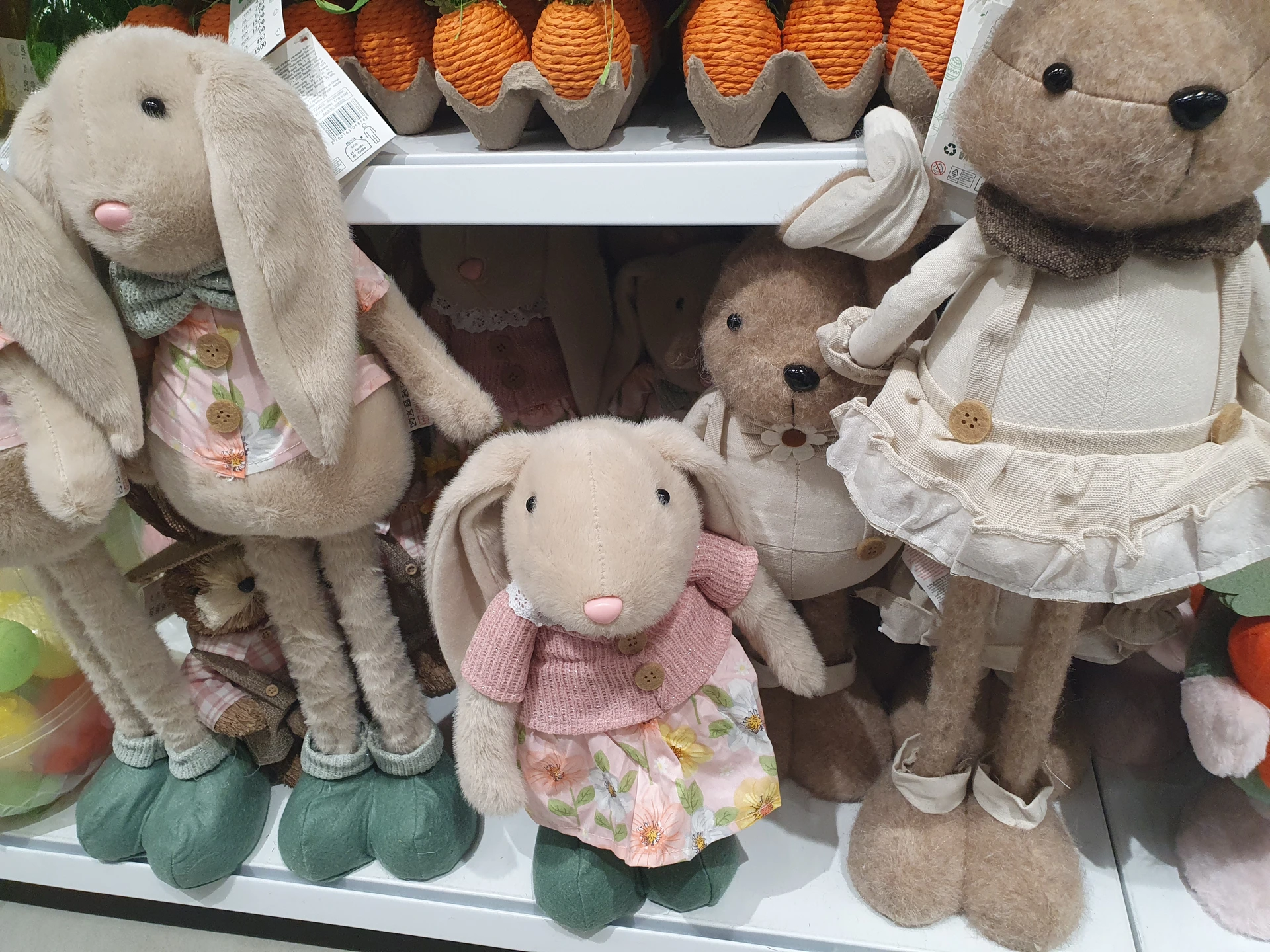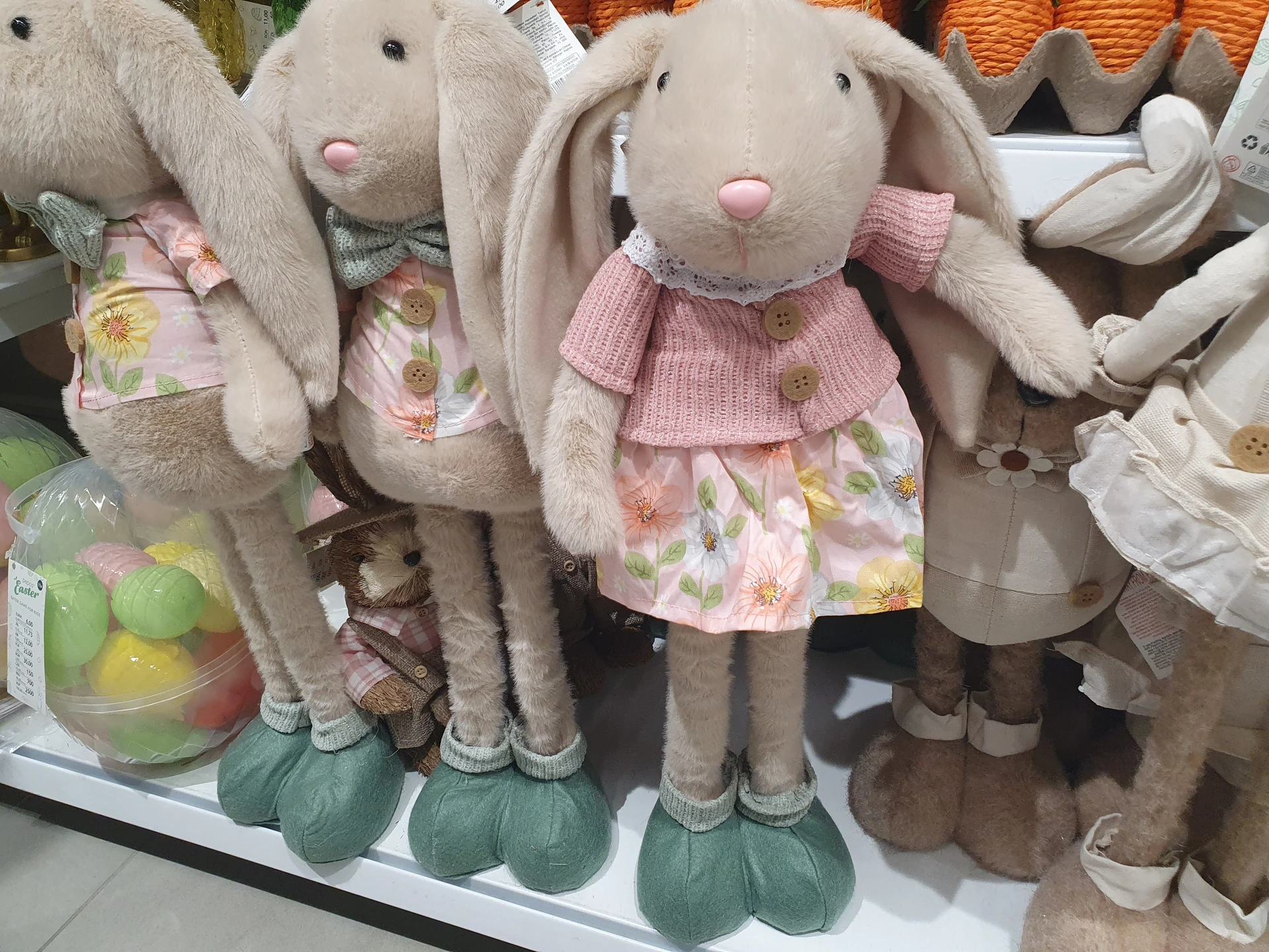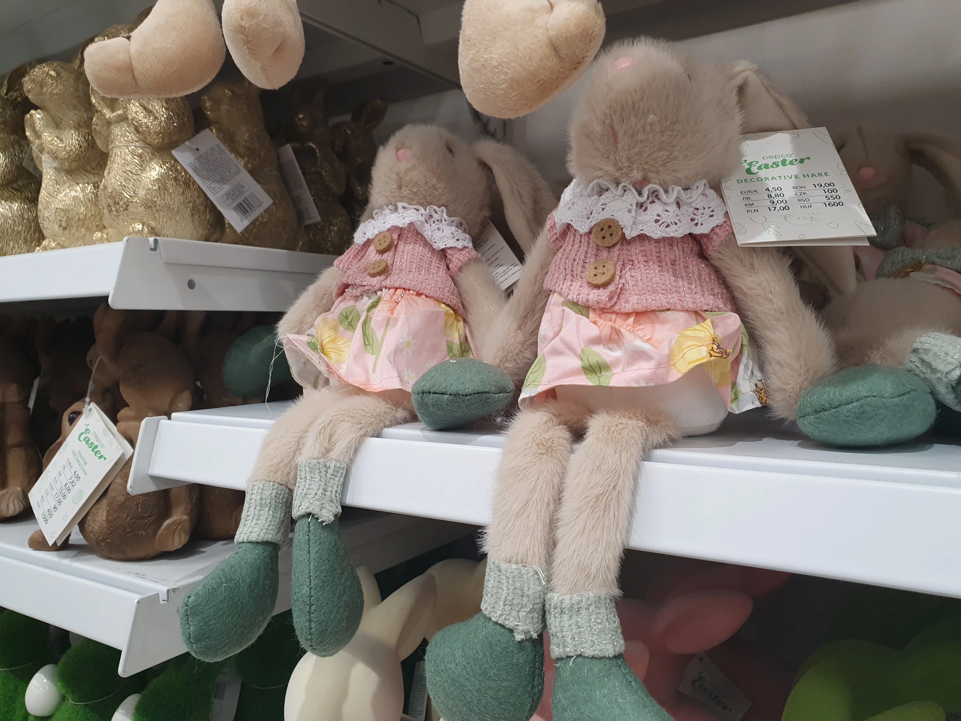 Plyšoví zajíci v podobě dekorace, která nejlépe vynikne třeba na kraji poličky, jsou v hnědé barvě a doplňuje je oblečení v růžovo-zelné kombinaci. Dostupní jsou ve variantě ženského a mužského oblečení.