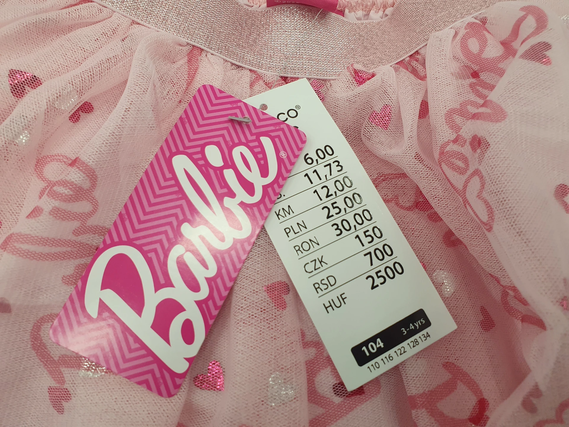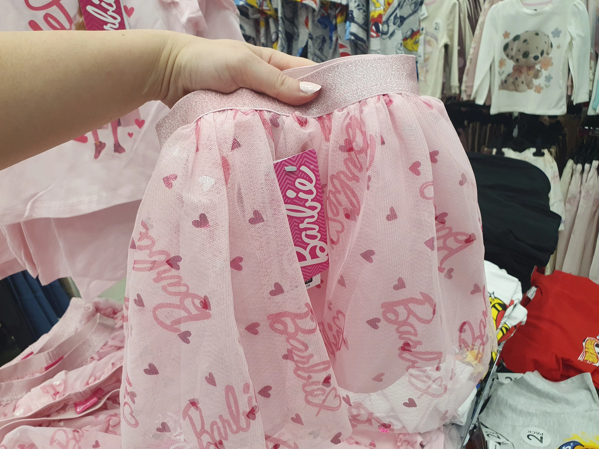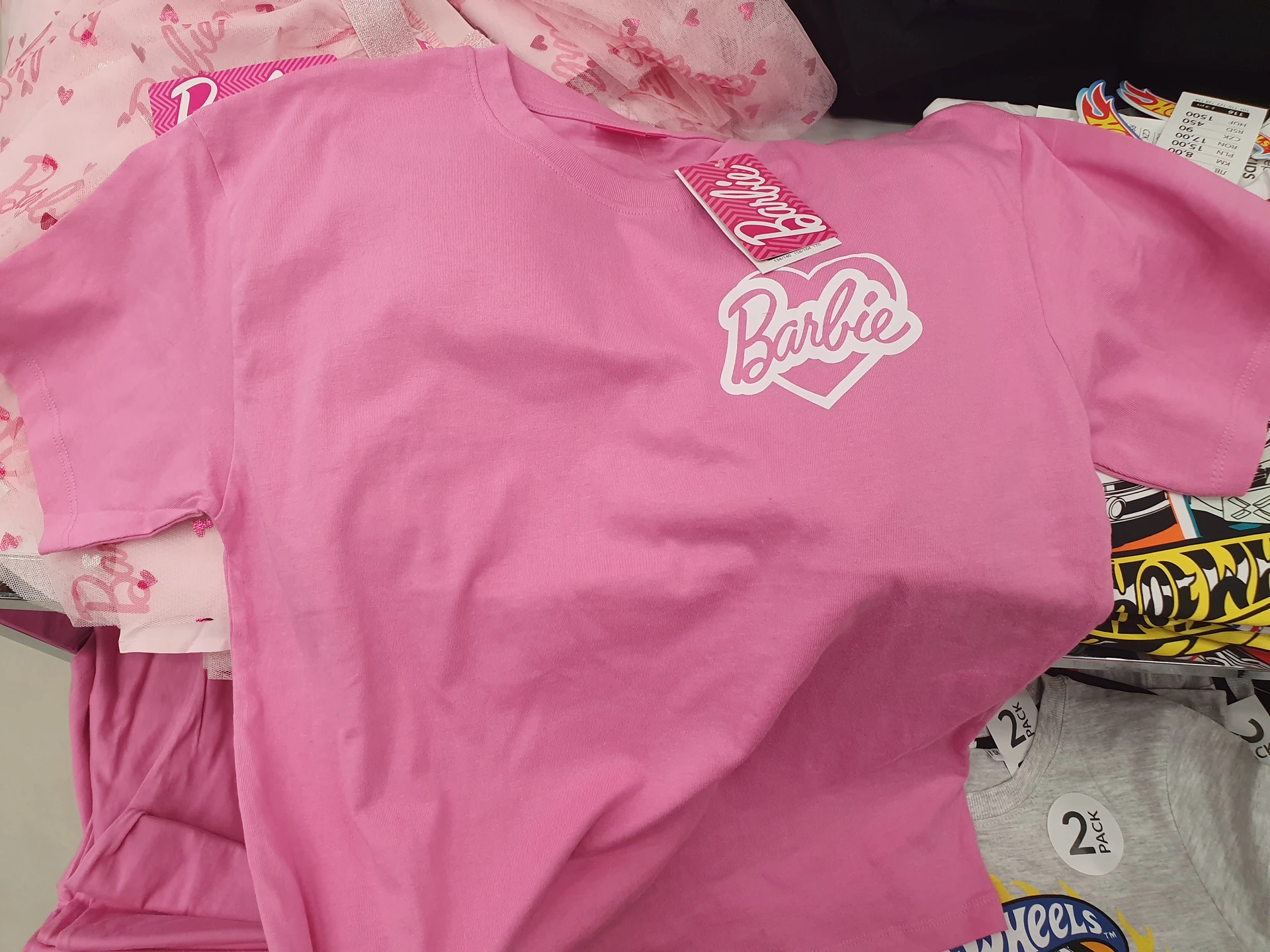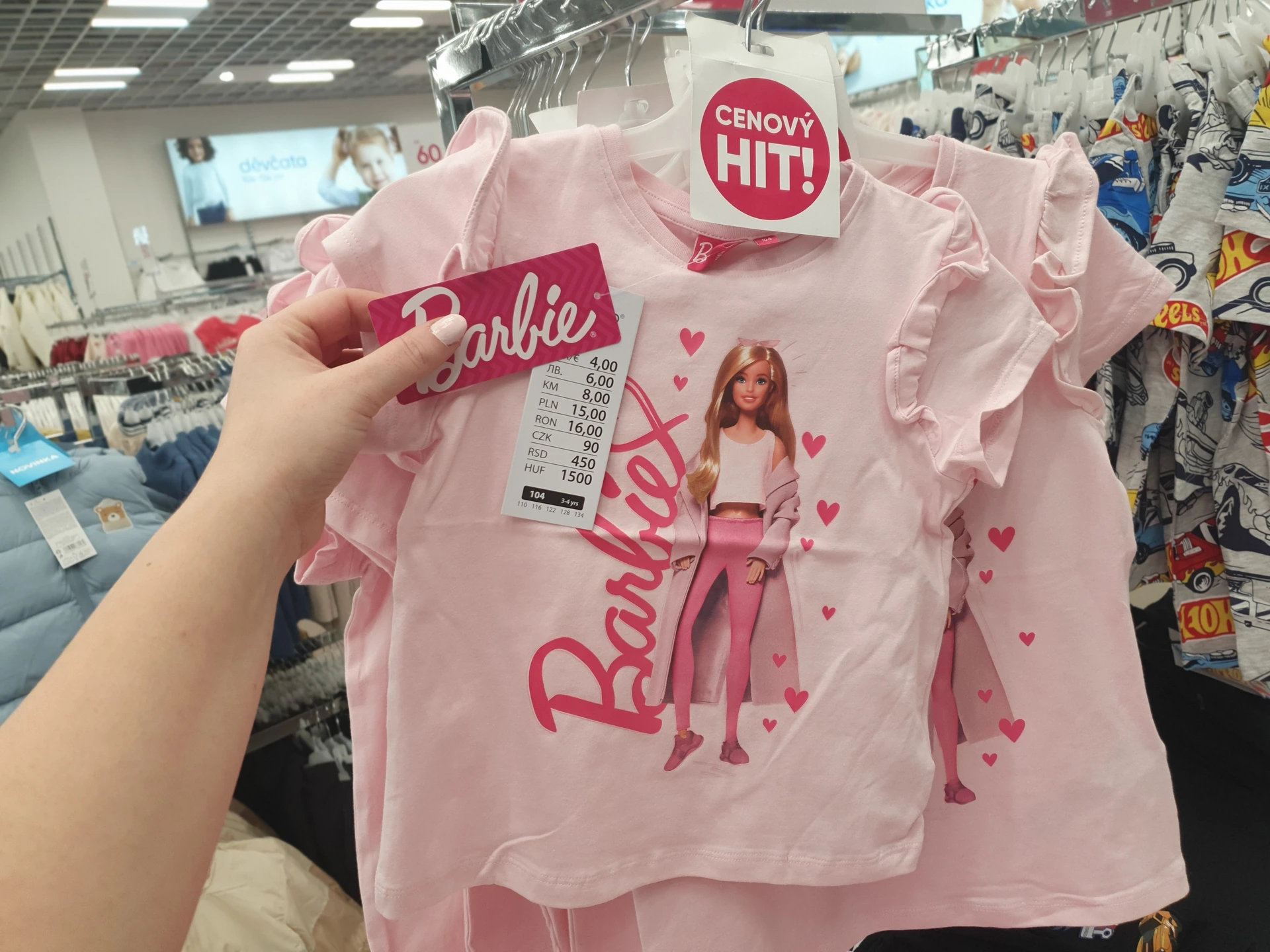 Pro menší slečny je určené světle růžové tričko s fotkou panenky Barbie doplněnou nápisem a srdíčky. Rukávy jsou zdobené volány a je dostupné ve velikostech 110 – 134 a stojí 90 Kč. Materiál tvoří 5 % elastan a 95 % bavlna.