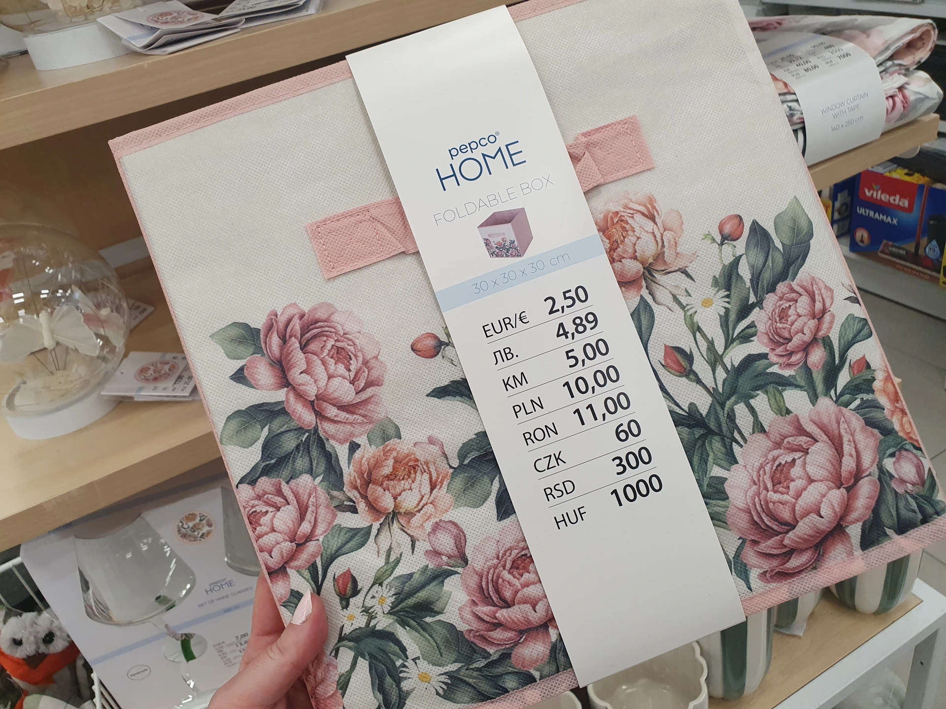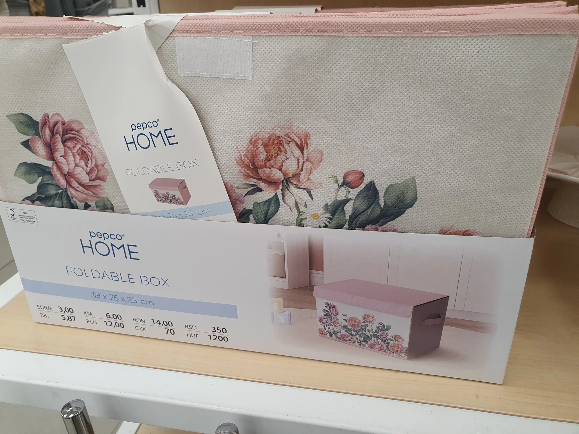 Pro uložení nejrůznějších věcí skvěle poslouží látkové skládací boxy, které v případě, kdy je nebudete využívat, můžete složit do placky. Větší z boxů je opatřený víkem ve světle růžové barvě, která ladí s květinovým vzorem na boxech. Jde o růžové pivoňky z kolekce, která se v obchodech objevila v lednu.