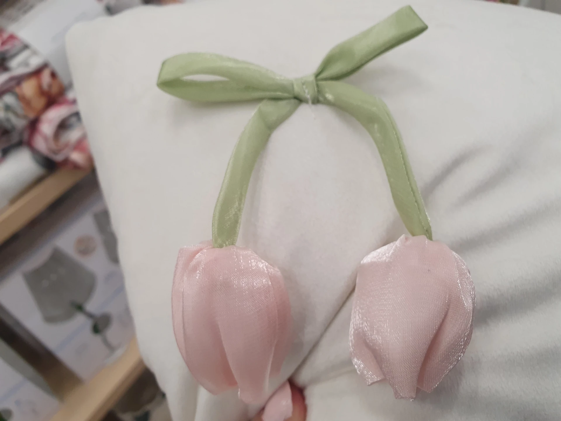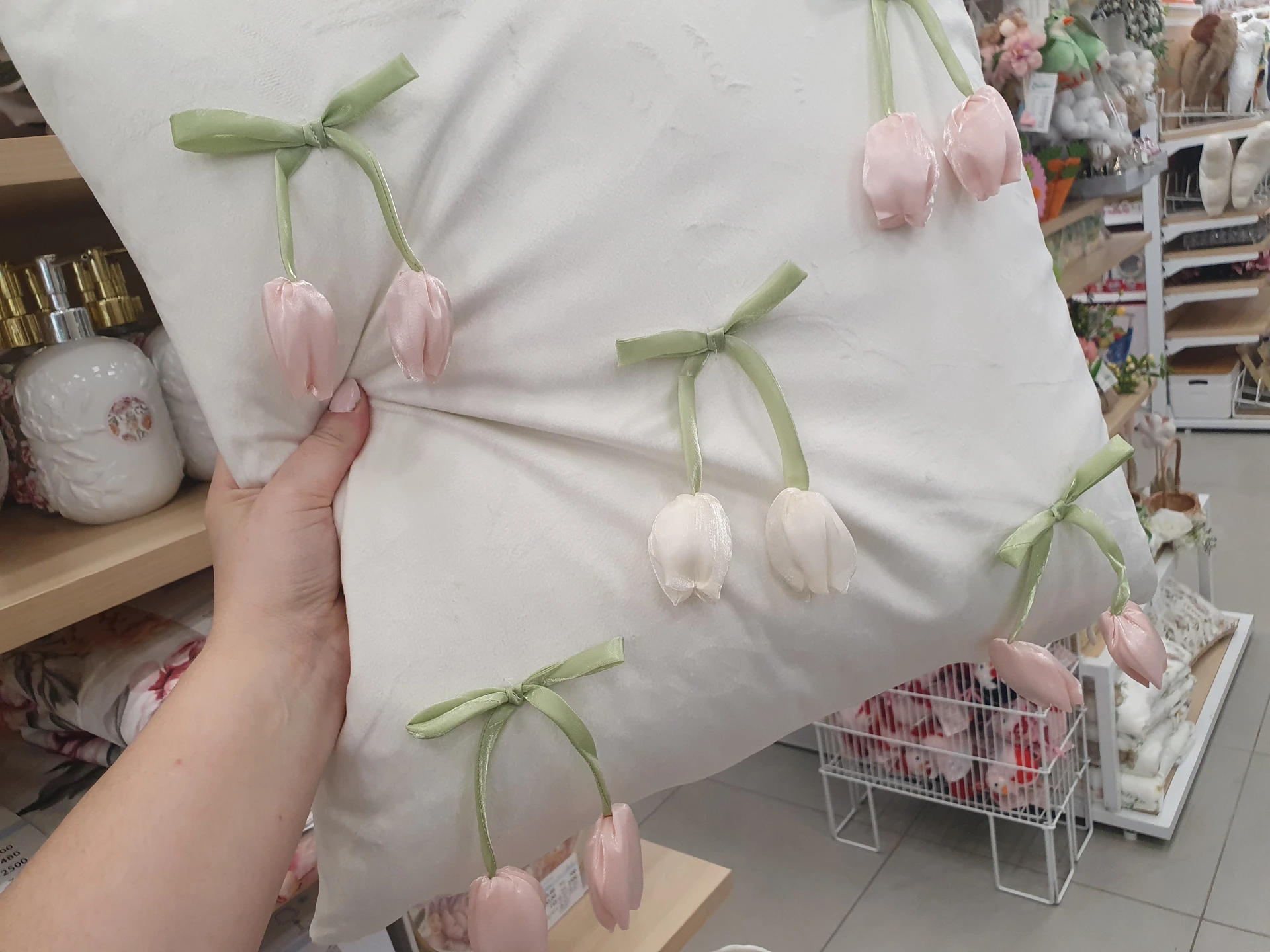Spíše k dekoraci poslouží tento polštář, který na sobě má tulipány provedené z mašlí. Na druhé straně nic nemá, takže by se na něm dalo ležet. Ale není jisté, jak by po čase dopadly tulipány na druhé straně. Polštář má rozměry 45 x 45 cm.
