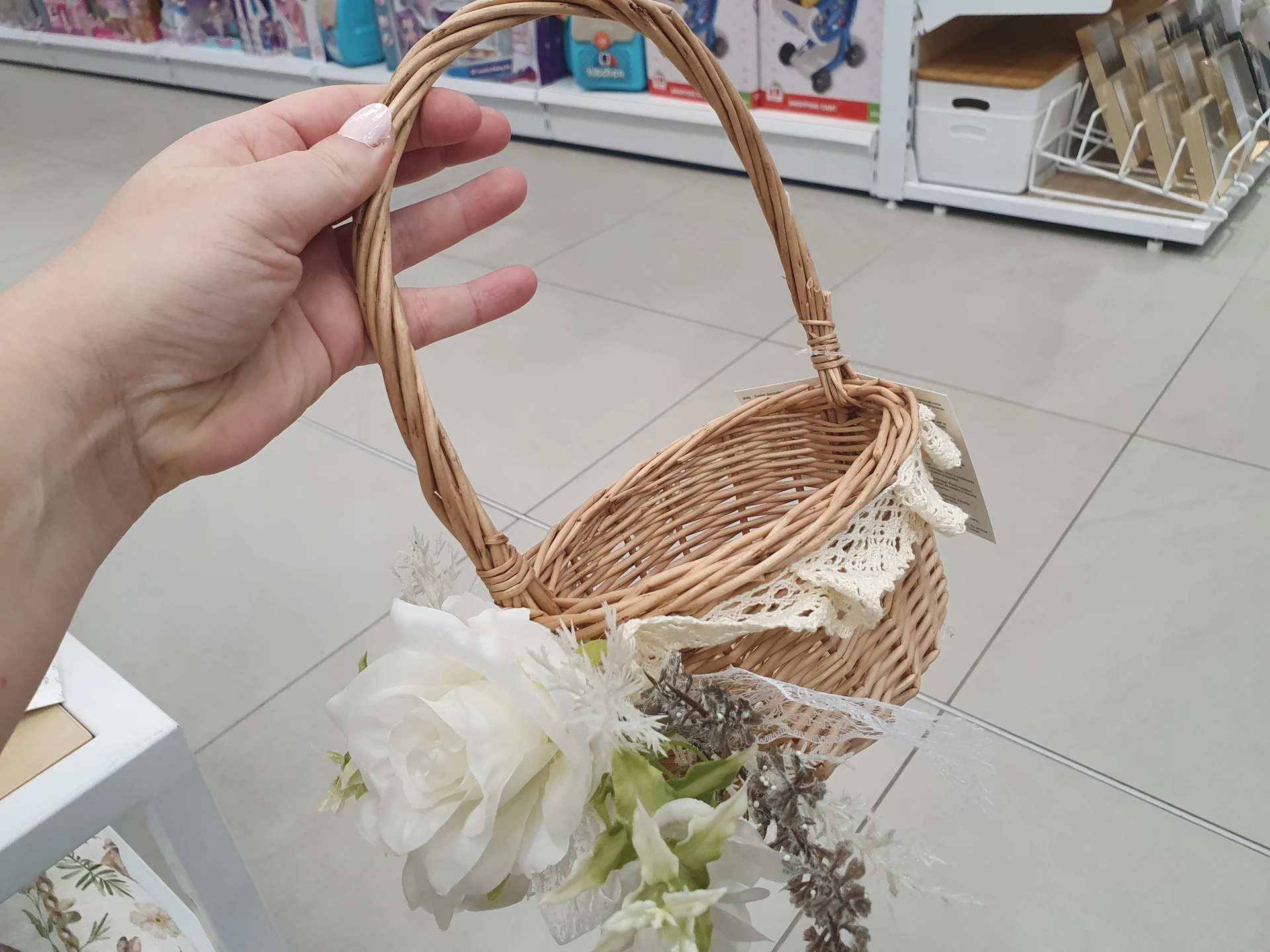 Proutěný košík s dlouhým uchem skvěle poslouží na velikonoční vajíčka, ale pěkně v něm vyniknou i další dekorace nebo třeba květiny. Sám je bohatě zdobený, kromě krajky po obvodu má na boku i výraznou umělou květinu, proto vynikne i s méně nápadným obsahem.
