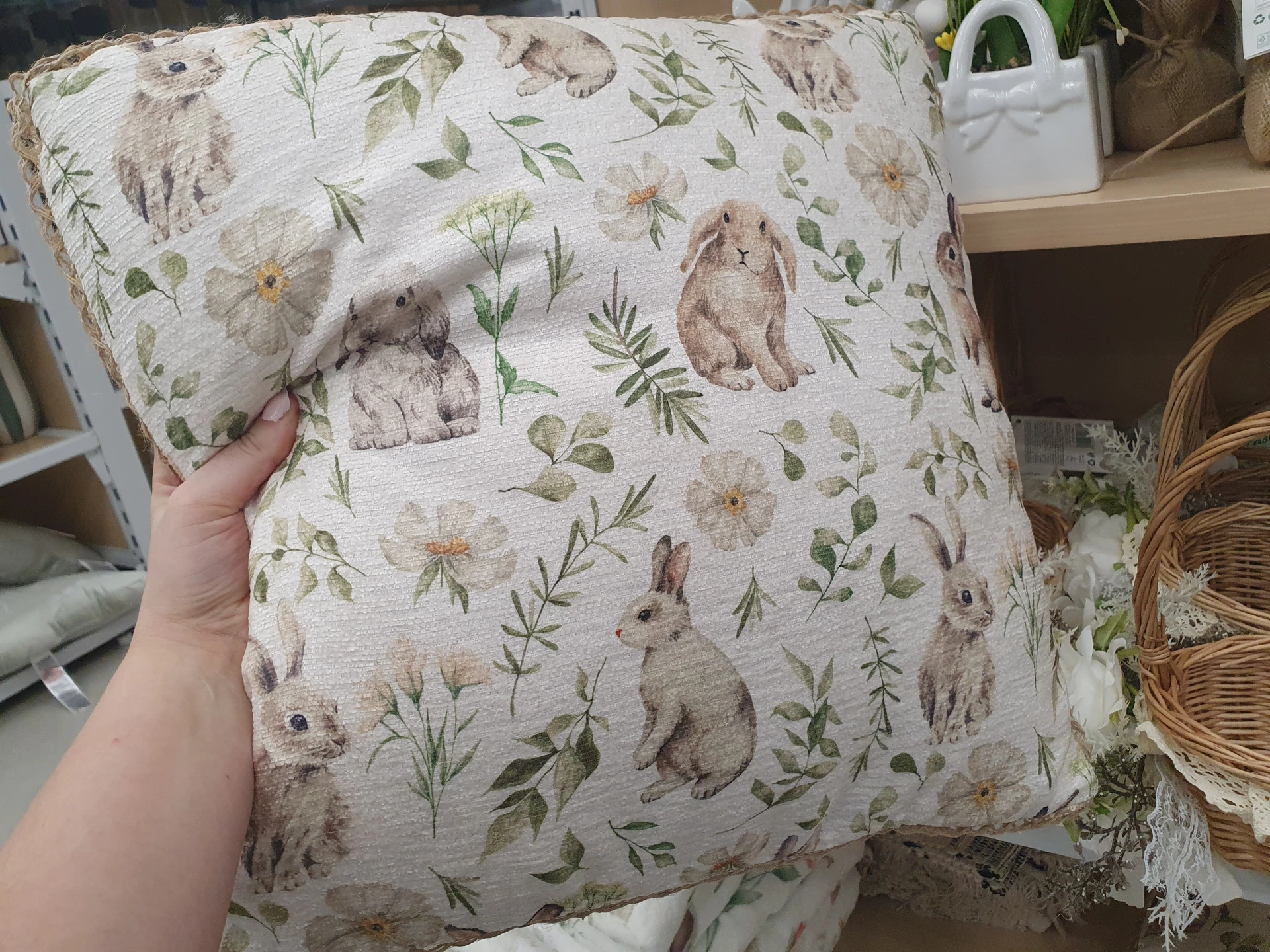 Nápaditě je zpracovaný tento oboustranný polštář, který má z jedné strany potisk se zajíci a květinami, z druhé je vzor z pruhů v zeleno-bílé barvě. Polštář má i lemování a na dotek jemný a příjemný materiál. Rozměry jsou 45 x 45 cm.