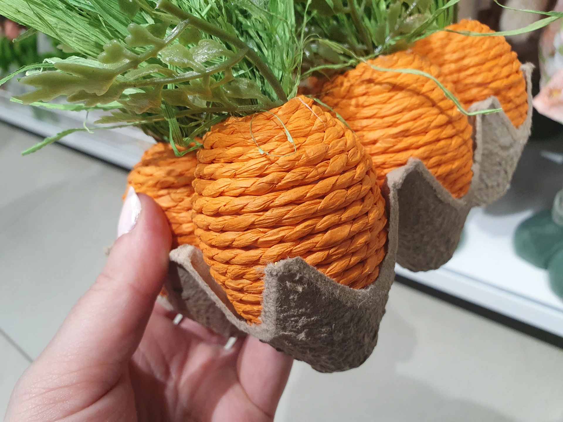 Kromě vajec a zajíců najdete v dekoracích i mrkve v několika variantách. Pro další zpracování do dekorací, ať už samostatně, nebo po jednotlivých kusech, poslouží kartonový podnos na vejce, ve kterých jsou usazené mrkve částečně tvarované jako vejce a zakončené bohatou zelenou natí. Jednotlivé mrkve jsou do kartónu pevně přilepené, po odstřižení ale budou stát samostatně.