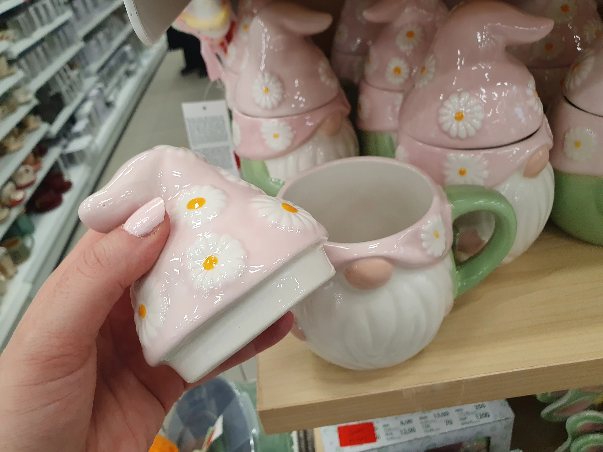 V loňském roce se ve velikonoční kolekci objevily produkty s motivem trpaslíků a v růžovo-zeleno-bílé kombinaci. Například hrnek s víčkem stojí 65 Kč místo původních 120 Kč a za misku zaplatíte 40 Kč místo původních 70 Kč.