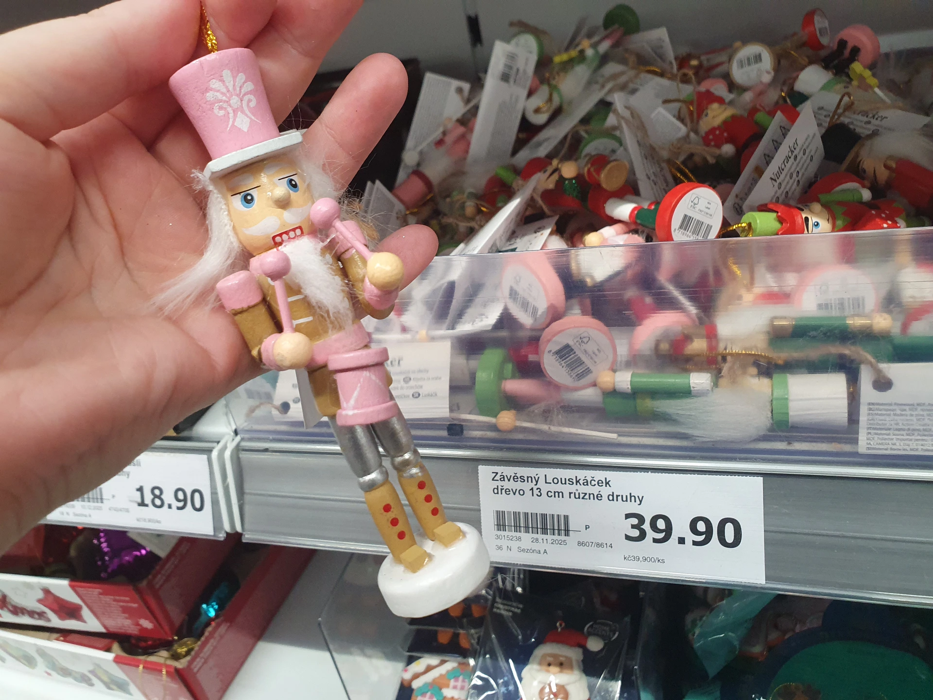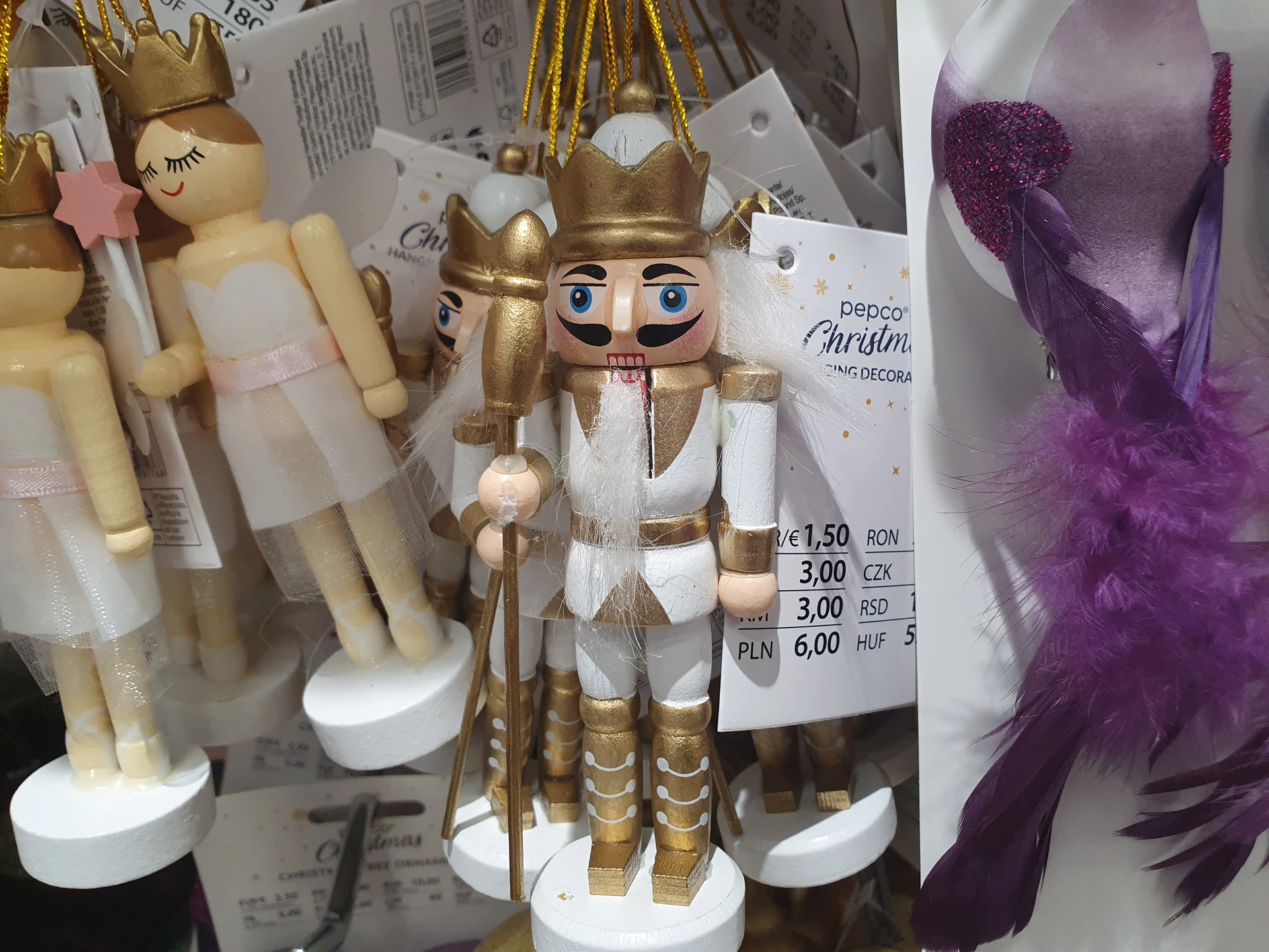 - Dřevěné ozdoby Louskáčků: v obou obchodech mají závěsné ozdoby postavičky Louskáčka, které jsou podobně velké. V Pepco jej nabízí jen v bílo-zlaté variantě za 35 Kč, v Action mají k dispozici víc barevných kombinací za cenu 39,90 Kč.