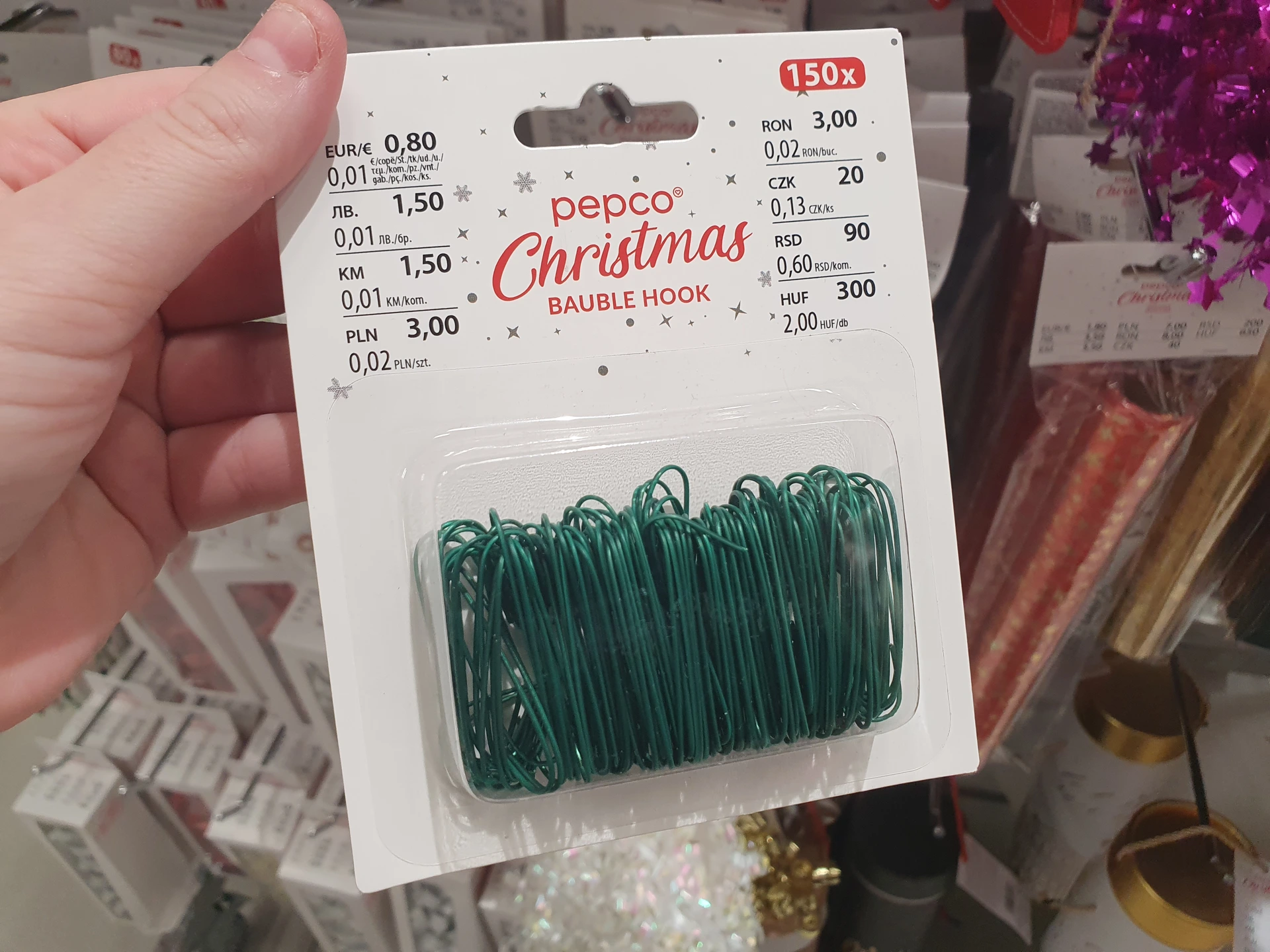 - Háčky na baňky: nezbytnou pomůcku pořídíte v Pepco výhodněji, sada 150 kusů totiž stojí 20 Kč a háčky jsou v zelené barvě. V Action jsou stříbrné a sada 50 kusů stojí 12,90 Kč.