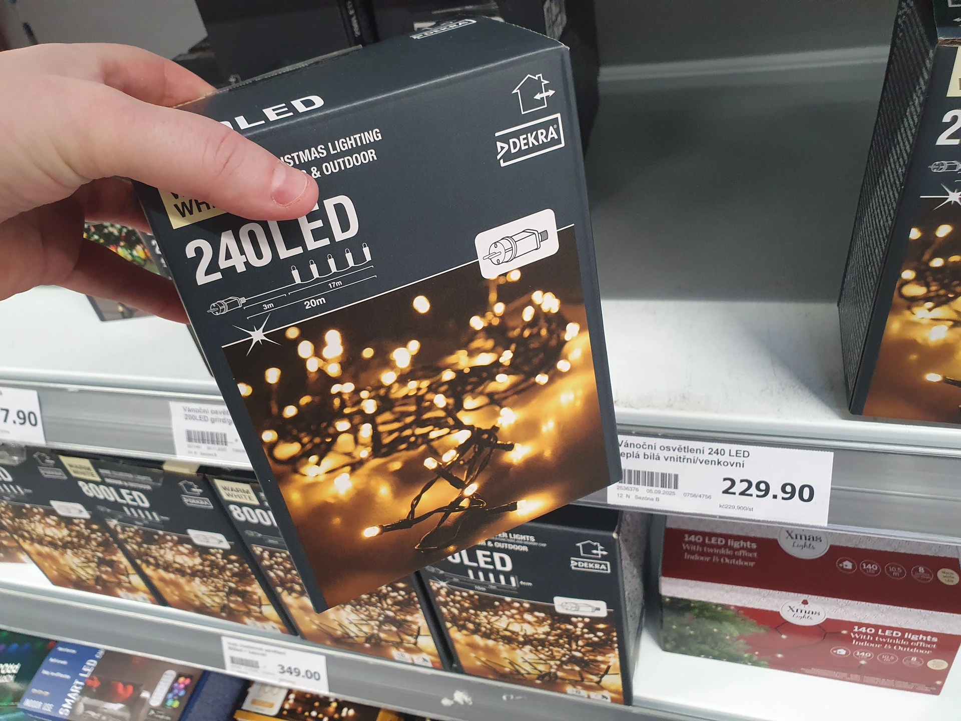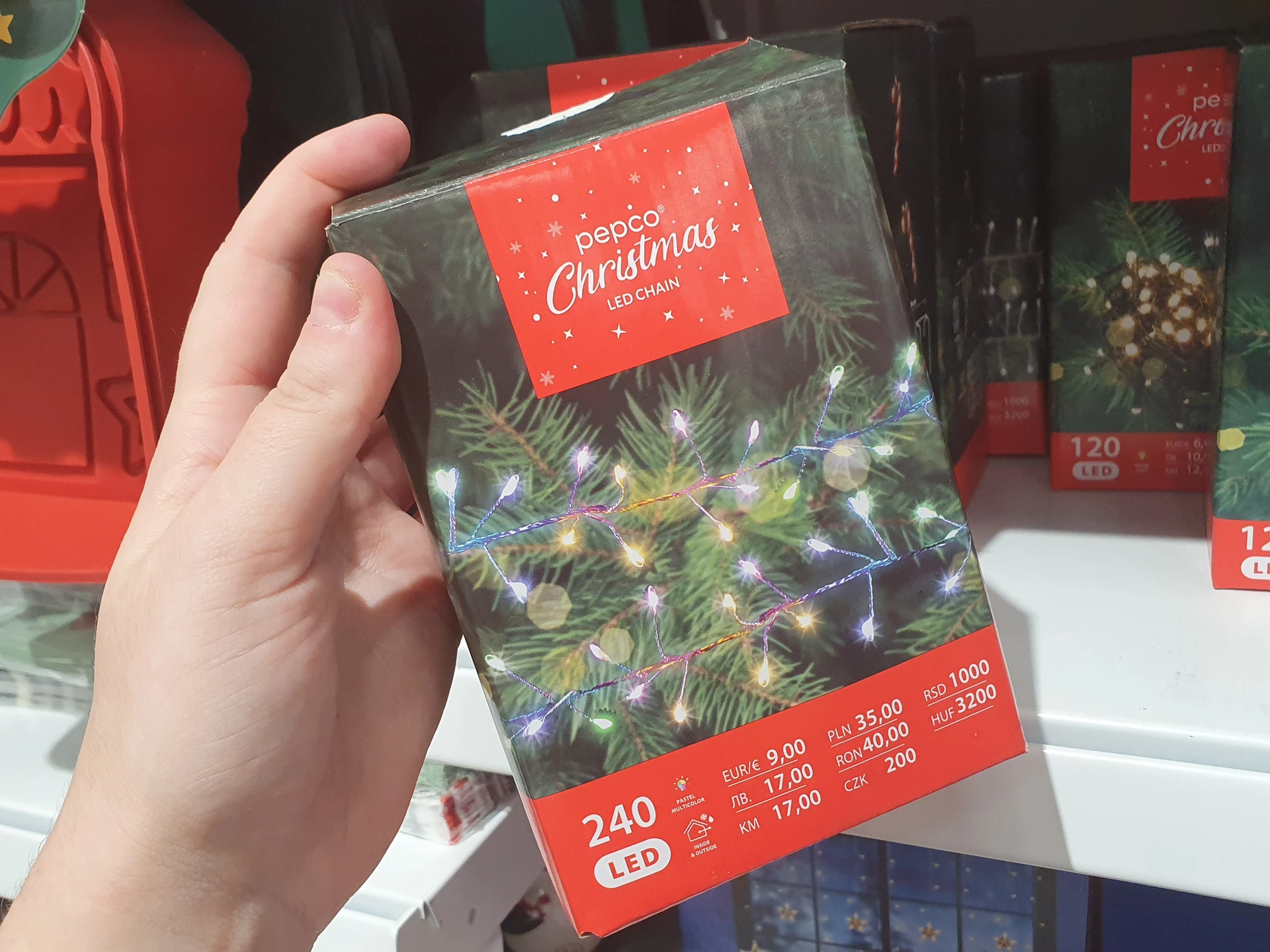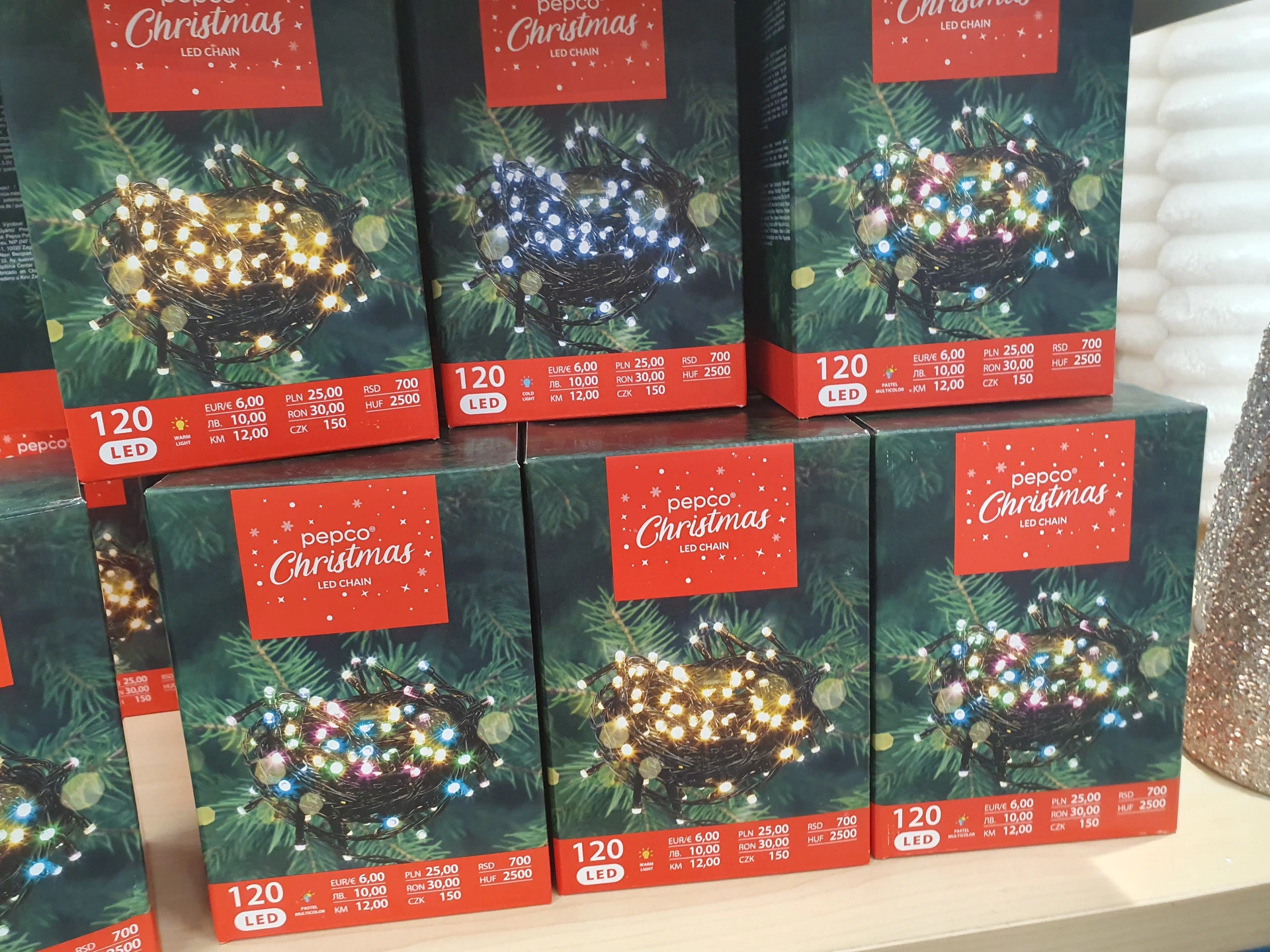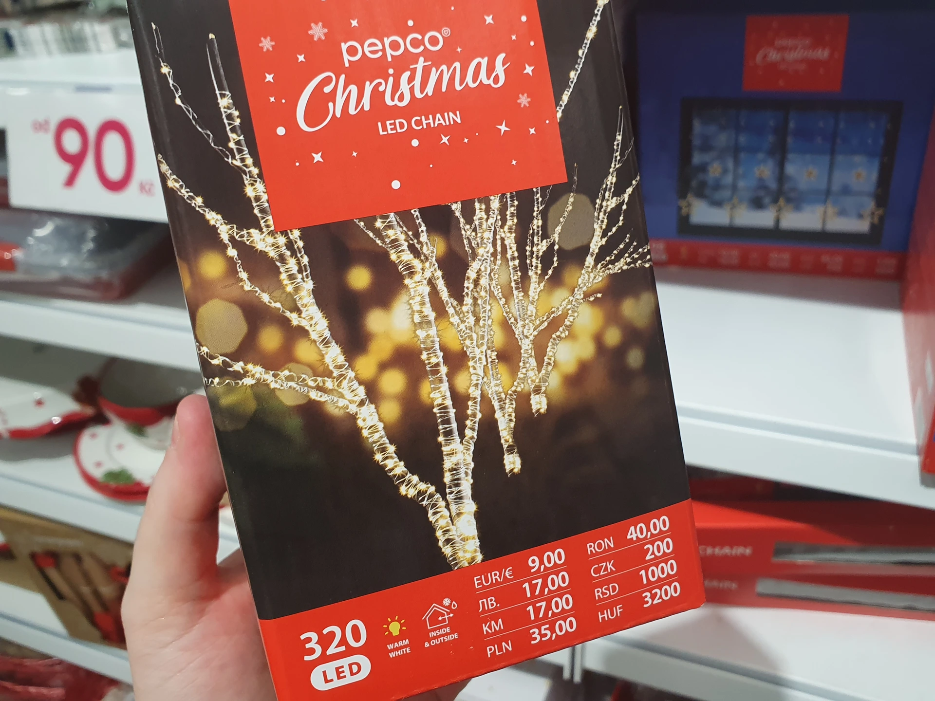 - Osvětlení v teplé bílé: zatímco Action toto osvětlení nabízí s 240 LED světly pro vnitřní i venkovní použití a za cenu 229,90 Kč, v Pepco má řetěz jen se 120 LED světly a cenu 150 Kč, dostupný je také ve studené bílé a barevné variantě. Řetěz je také určený pro vnitřní a venkovní použití a součástí je časovač. Oboje osvětlení je do zásuvky, cenově výhodněji vychází řetěz z Action.