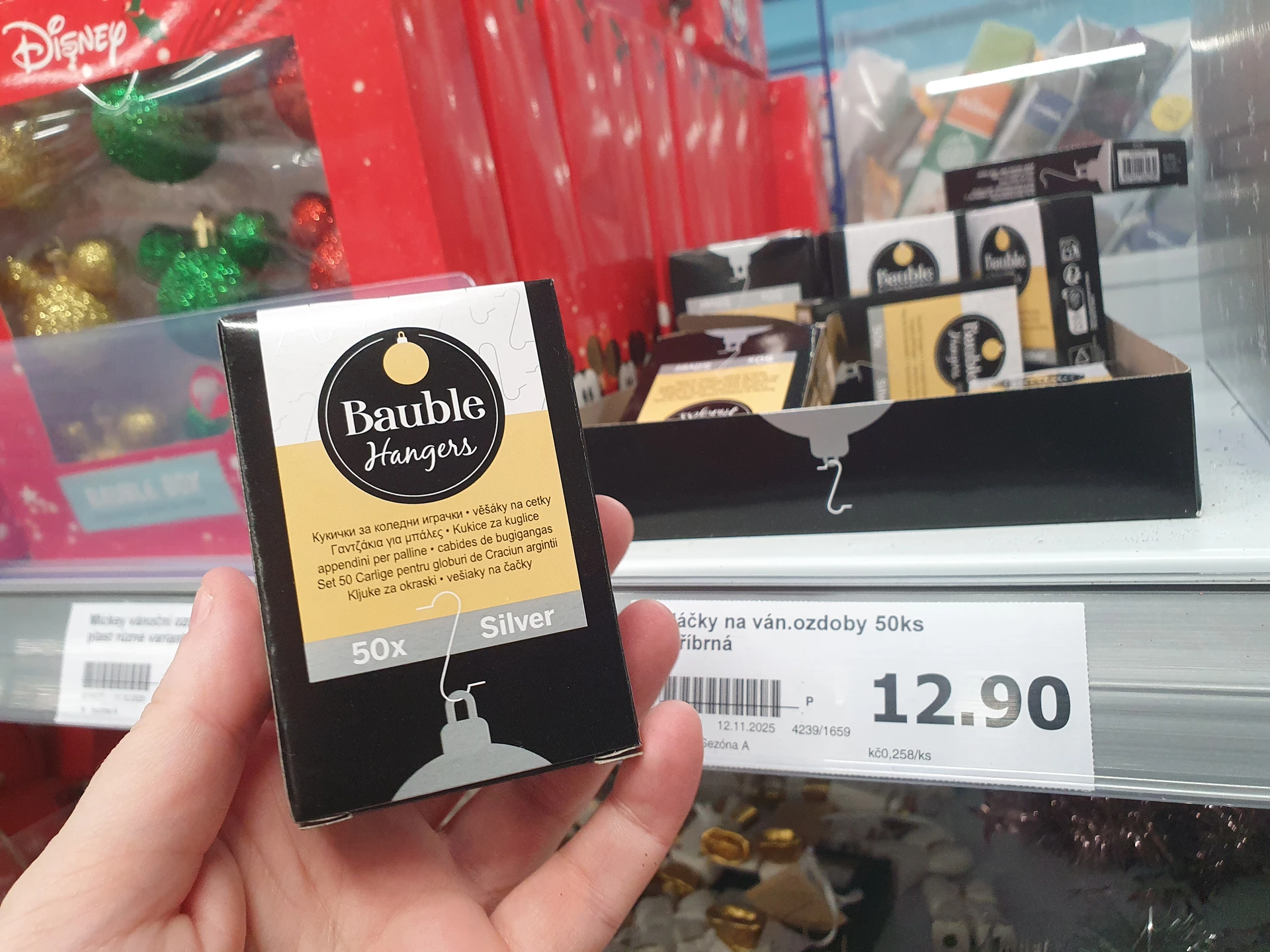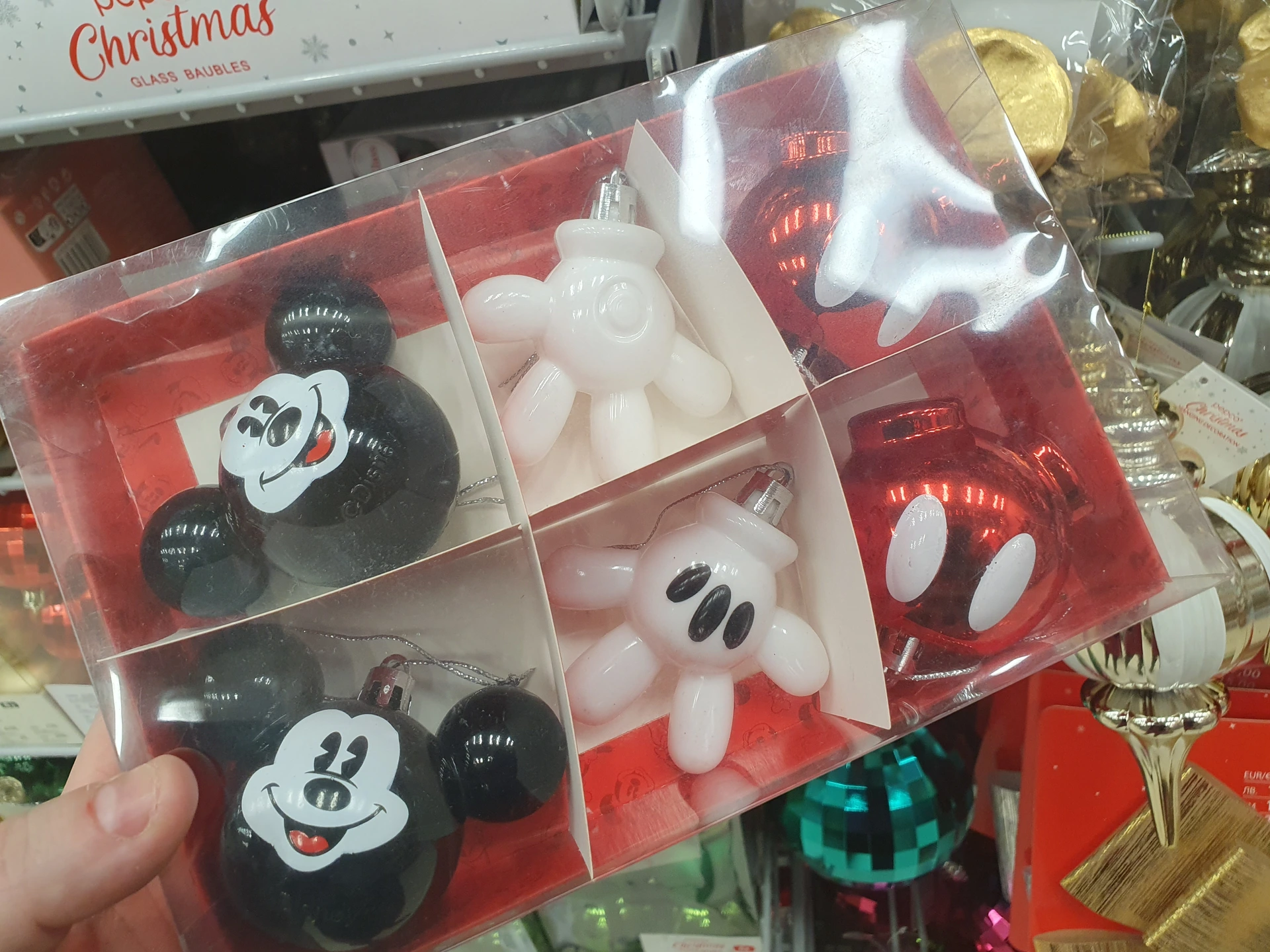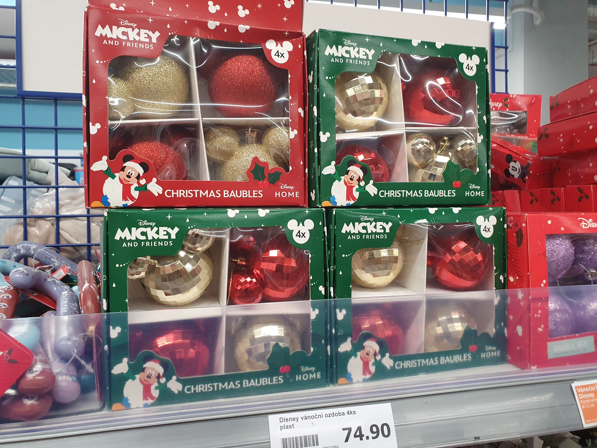 - Sada baněk Mickey Mouse: v Pepco jsme sadu 6 tvarovaných baněk ve stylu Mickey Mouse našli ve slevě z 90 na 33 Kč. V Action ale mají větší výběr. Na kulatých baňkách jsou menší baňky znázorňující uši, které má Mickey Mouse. A jsou buď třpytivé, nebo jejich povrch připomíná disko kouli. Balení 4 kusů stojí 74,90 Kč.