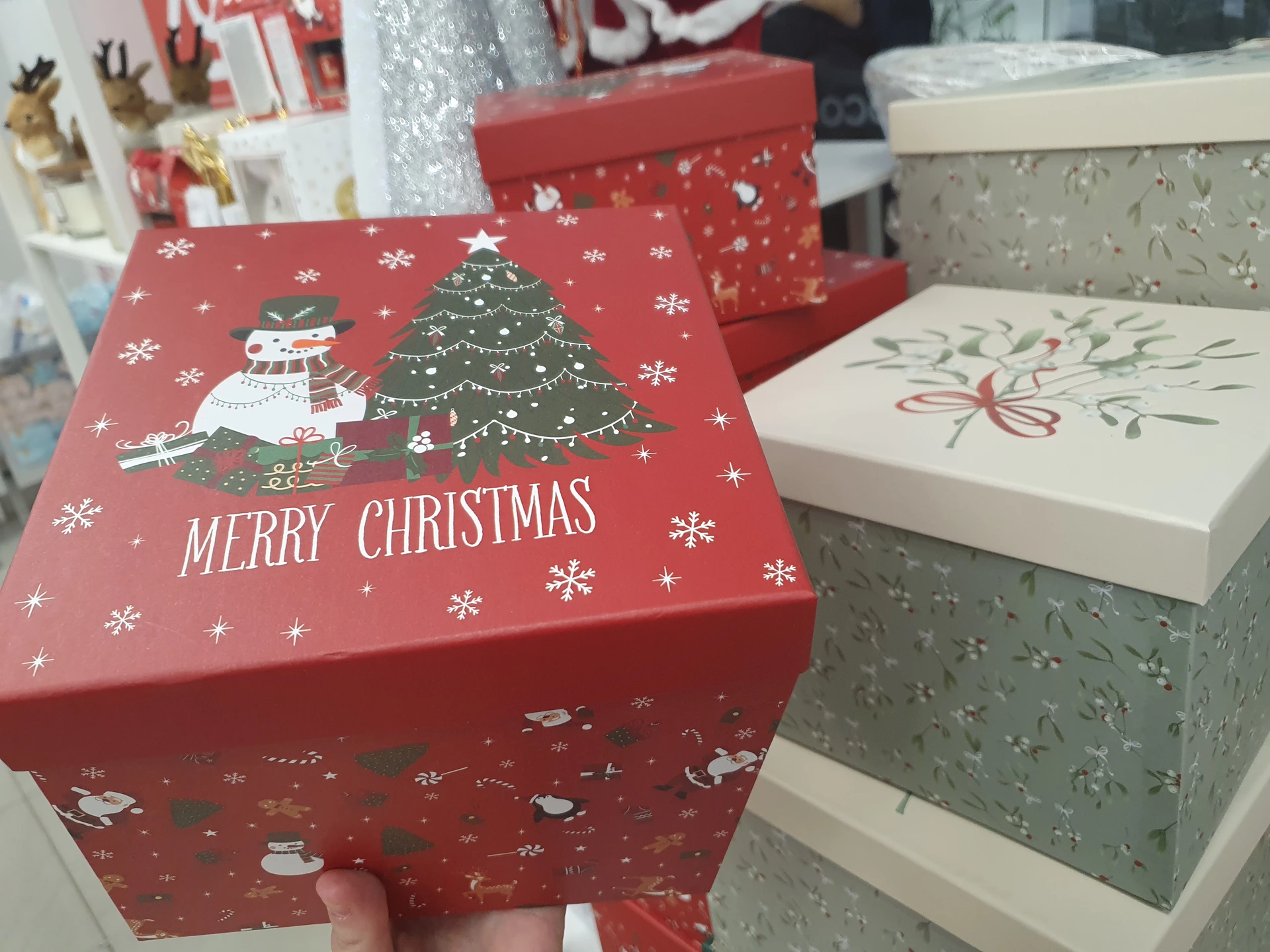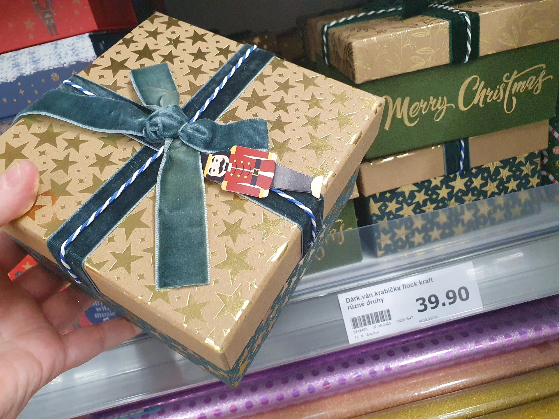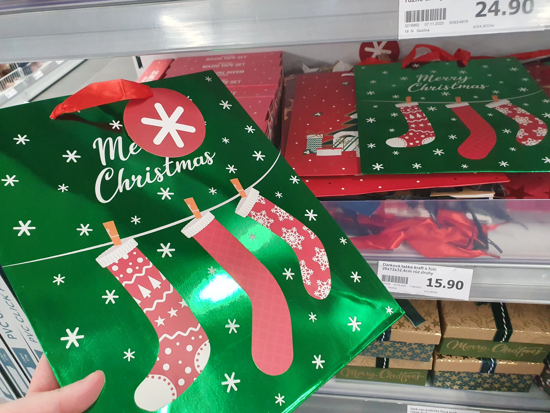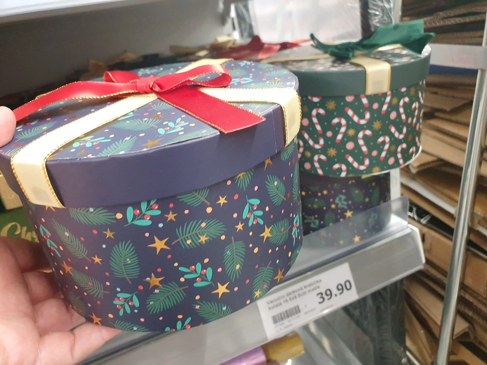 - Dárkové krabice: v Pepco mají širší výběr velikostí krabic se třemi druhy vzorů – červenou s vánočním stromečkem, béžovou s perníčkem a zelenou se jmelím. Krabice jsou ve 4 velikostech od 50 do 90 Kč. Krabice v Action jsou jen na menší dárky za cenu 39,90 Kč. Jsou hranaté nebo kulaté a ovázané mašlí.