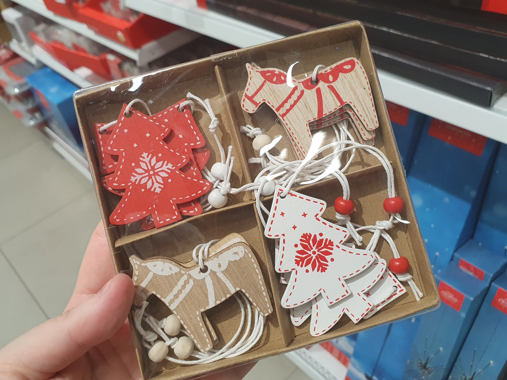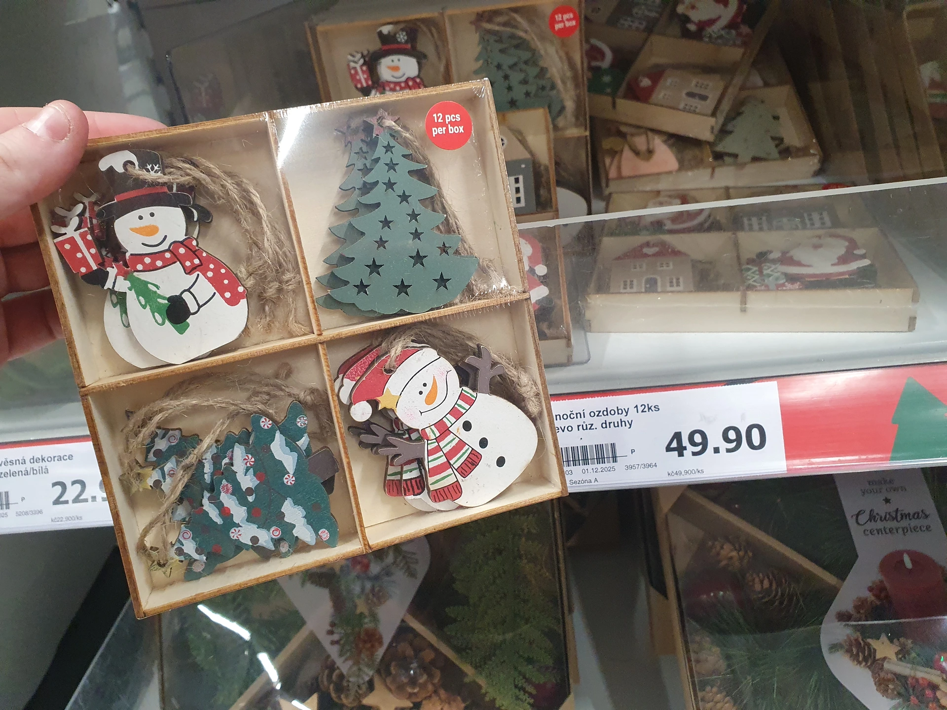- Sada dřevěných ozdob: 12 kusů plochých dřevěných ozdob s vánoční tematikou mají také v obou obchodech. V Pepco stojí 50 Kč a ozdoby jsou jemnější, v červeno-bílé kombinaci. V Action mají cenu 49,90 Kč a ozdoby jsou více barevné a působí veseleji.