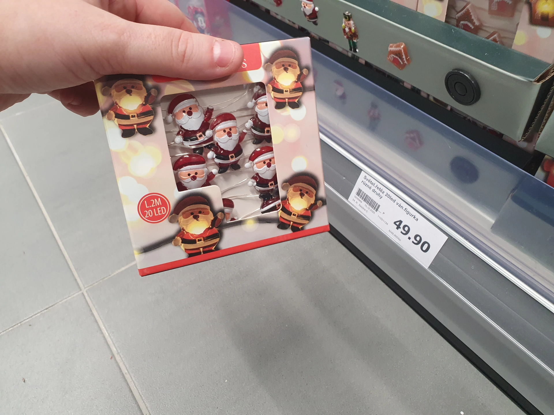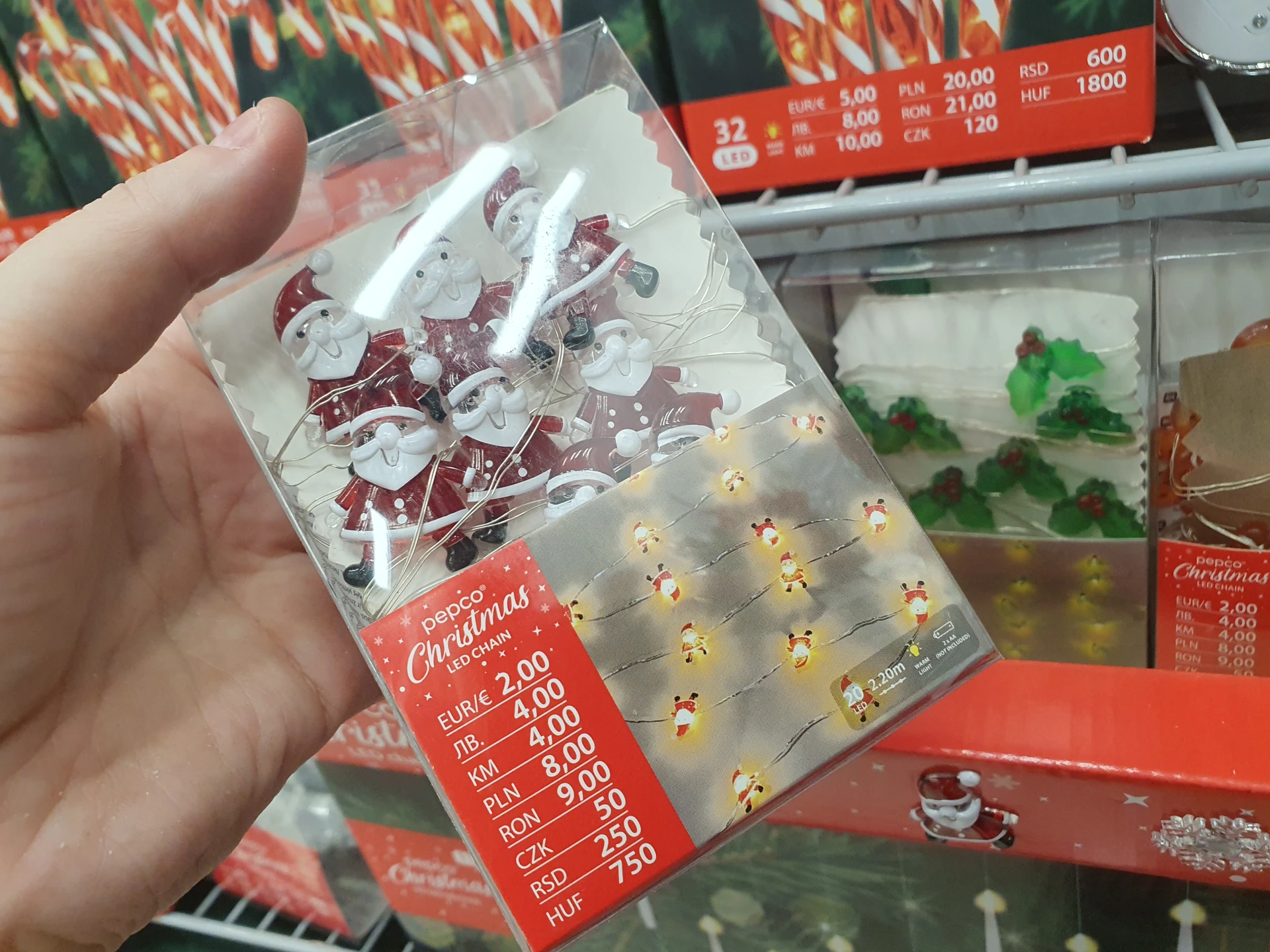 - Malý řetěz s ozdobami: v obou obchodech najdete velmi podobné řetězy s LED světly, na kterých jsou umístěné malé ozdoby. Společné mají Santy Clause a počet 20 světel. V Action stojí 49,90 Kč a mají i perníkové chaloupky či cukrová lízátka. V Pepco stojí 50 Kč a mají i cesmínu nebo perníkové panáčky.
