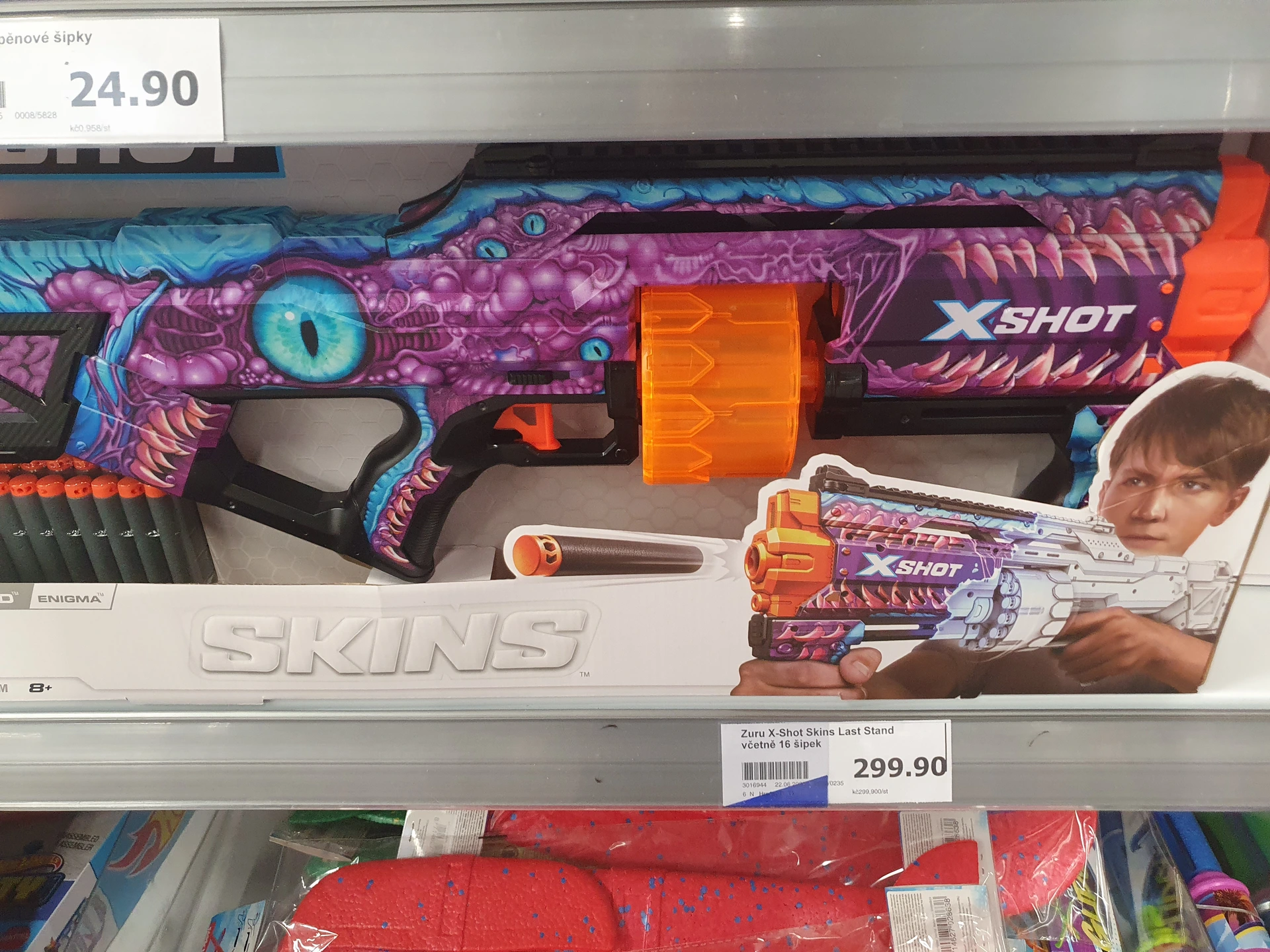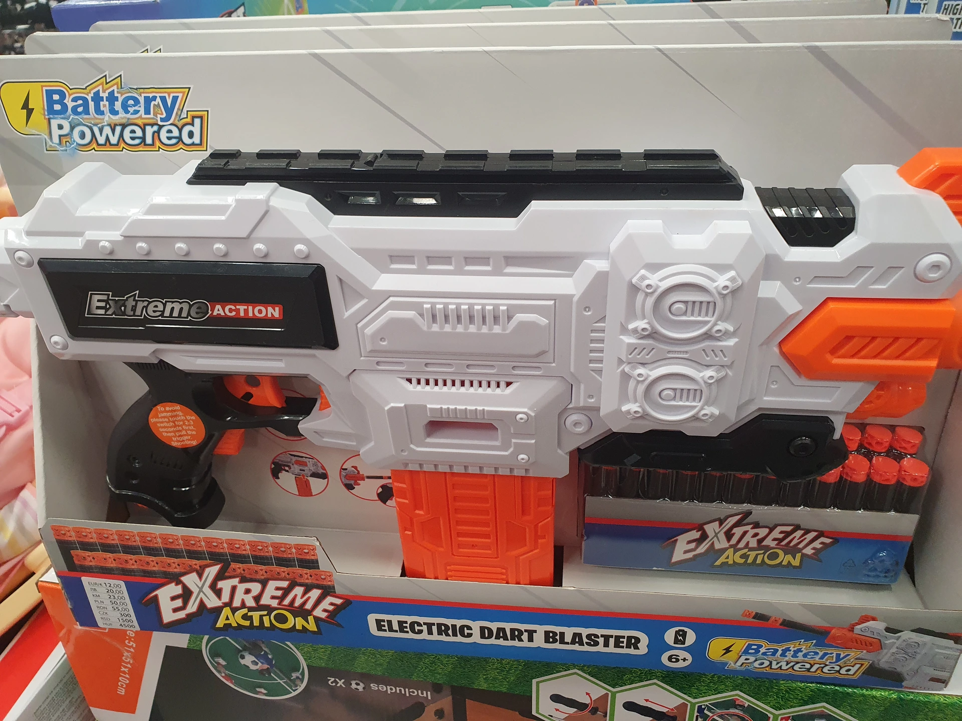 - Pistole na pěnové šipky: v obou obchodech jsme našli pistole na pěnové šipky, v Action jich měli více druhů. V Pepco mají pistoli v bílé barvě a s 24 šipkami za 300 Kč, která je určená pro děti od 6 let. V Action má pistole speciální vzor, v balení 16 šipek a stojí 299,90 Kč. Je určená pro děti od 8 let a její dostřel je až 27 metrů.