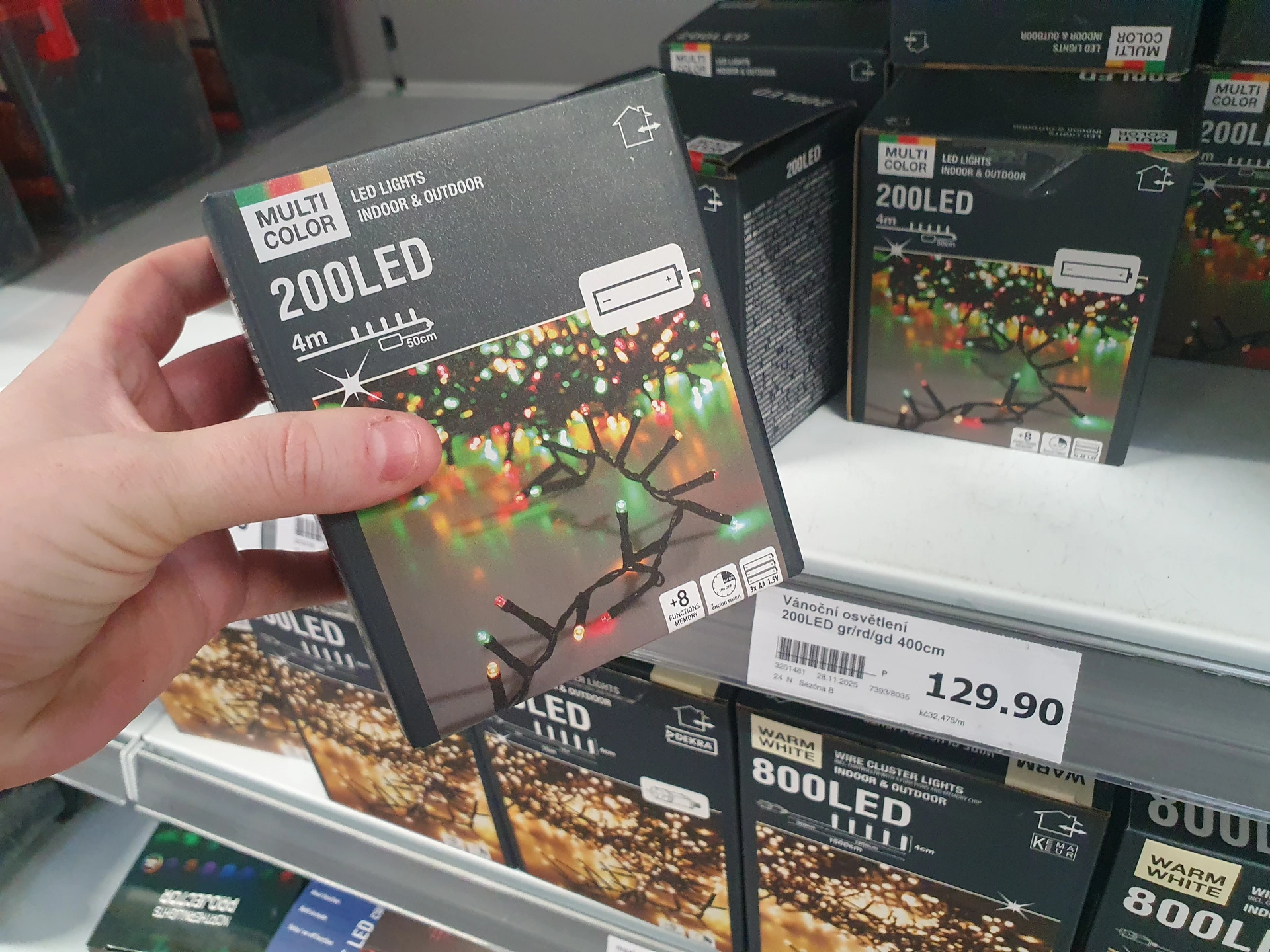 - Barevné osvětlení: v Action mají světelný řetěz s 200 LED světly, který je na tužkové baterie, venkovní i vnitřní použití a je vybavené časovačem za cenu 129,90 Kč. Světelný řetěz v Pepco s 240 LED světly je v provedení mikro světel umístěných na drátcích, které působí jemněji. Osvětlení ze řetězu vybíhá ven ve tvaru větviček. Zapojuje se do zásuvky a stojí 200 Kč, v přepočtu na počet světel opět vychází lépe řetěz z Action.