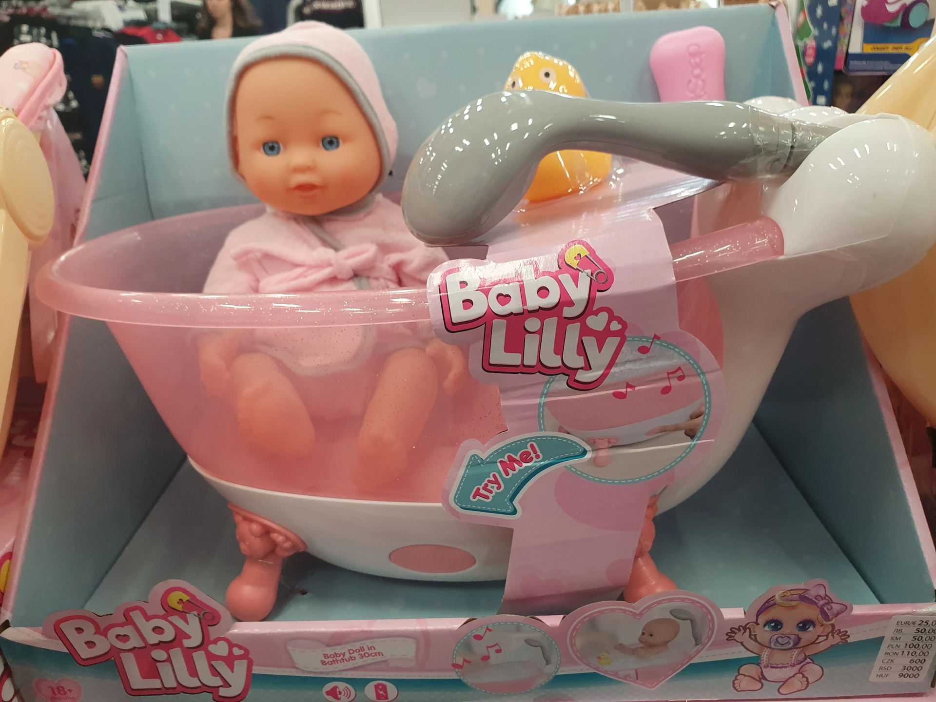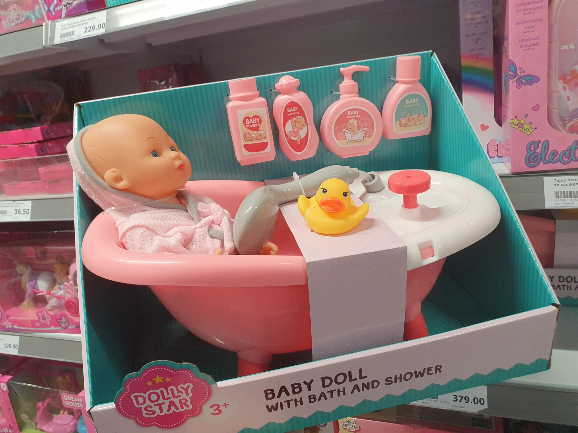 - Panenka ve vaně: na první pohled velmi podobnou hračku mají v obou obchodech. V Pepco má vyšší cenu 600 Kč, protože vydává i zvuky. V Action má ve výbavě kromě podobné kachničky a mýdla i další makety dětské kosmetiky a sada stojí 379 Kč.