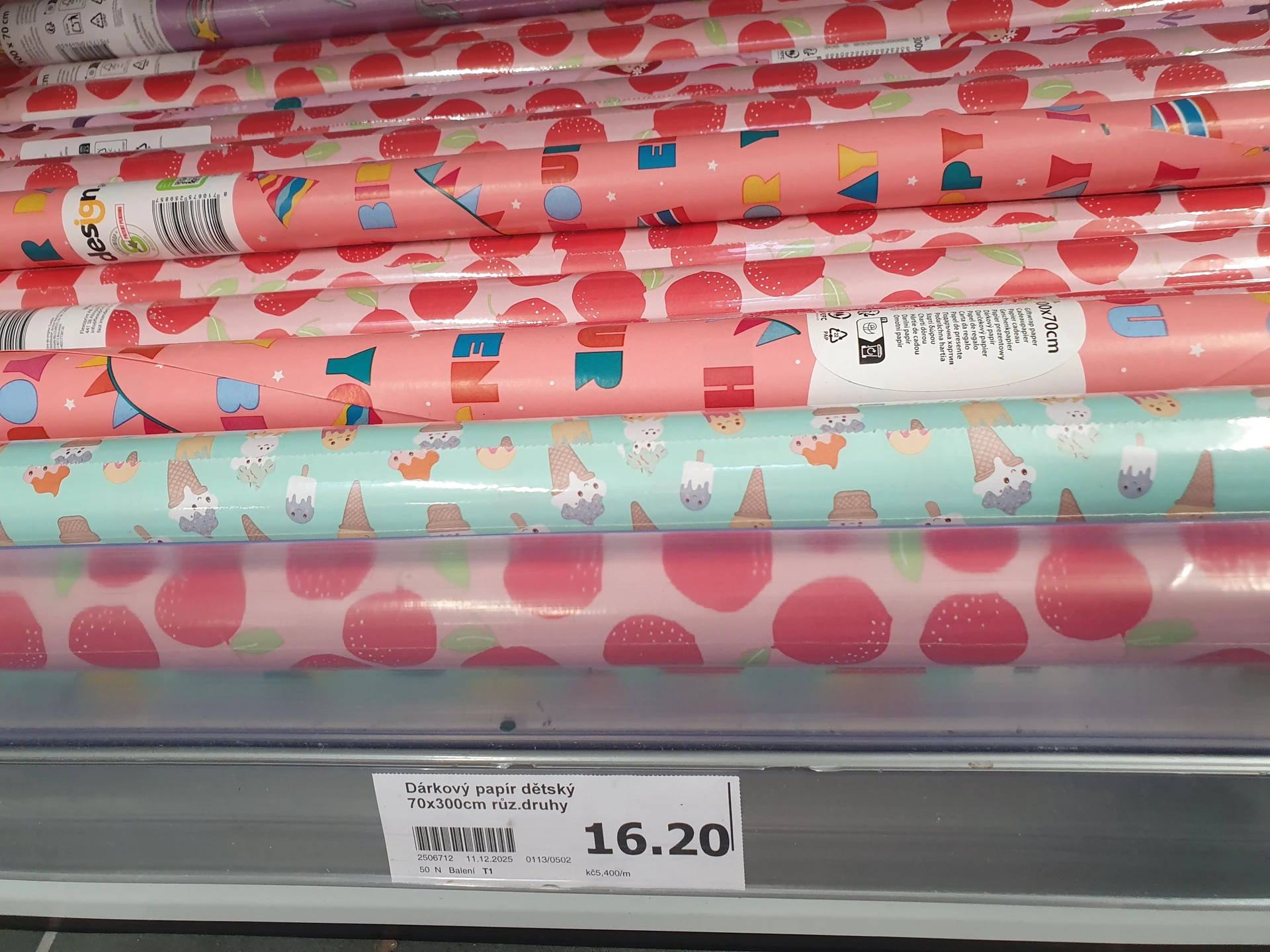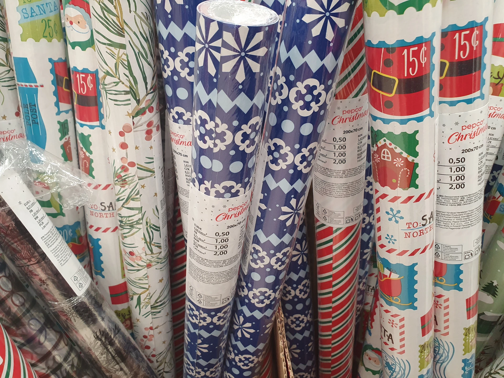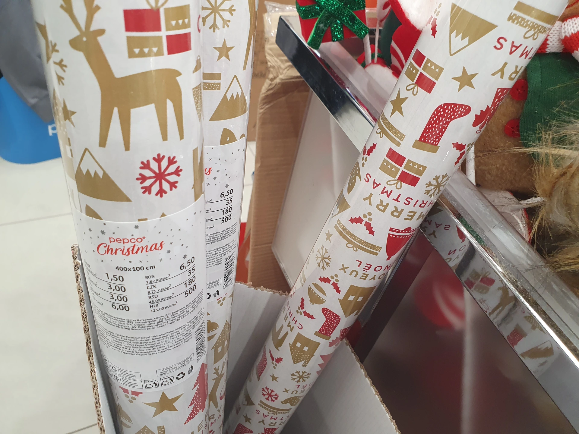 - Dárkové papíry: dvě velikosti vánočních balicích papírů jsme našli v Pepco, kde menší role s rozměry 200 x 70 cm stojí 12 Kč a větší s rozměry 400 x 100 cm má cenu 35 Kč. Zároveň jich byl na prodejnách dostatek. Papíry v Action měli sice v předních regálech u vánočního zboží, byl ale označený jako dětský dárkový papír a vánoční vzory na něm nebyly. S rozměry 300 x 70 cm stojí 16,20 Kč.