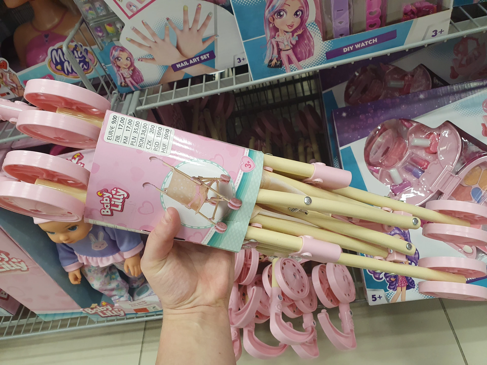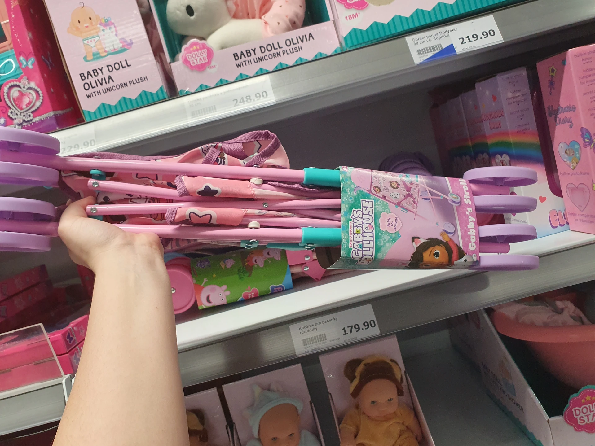 - Skládací kočárek pro panenku: kočárek v Action má trochu tenčí konstrukci, ale je na něm obrázek z oblíbené pohádky Gabby´ s Dollhouse. Stojí 179,90 Kč. Kočárek v Pepco nám připadal trochu pevnější, má ale i vyšší cenu 200 Kč.