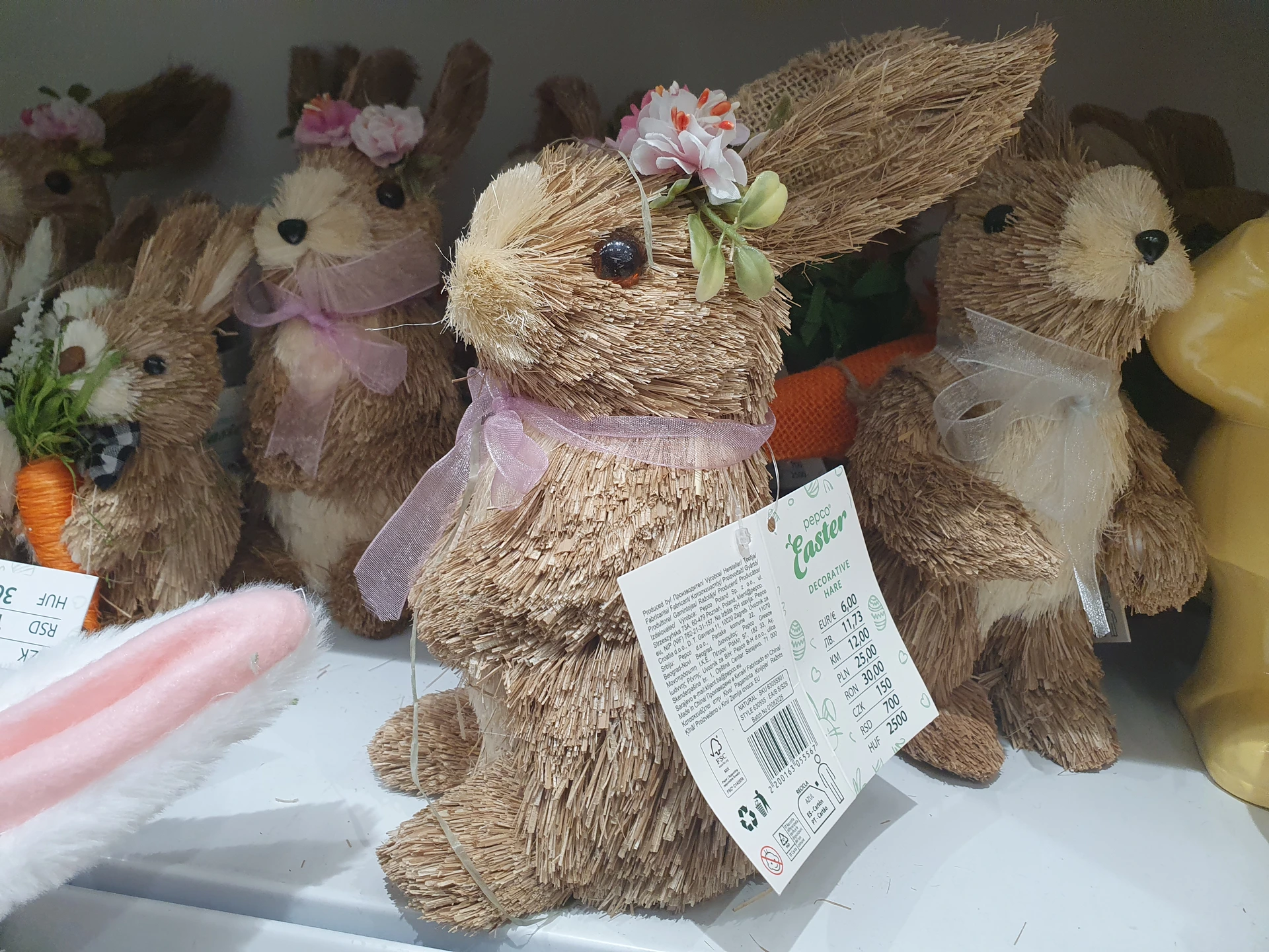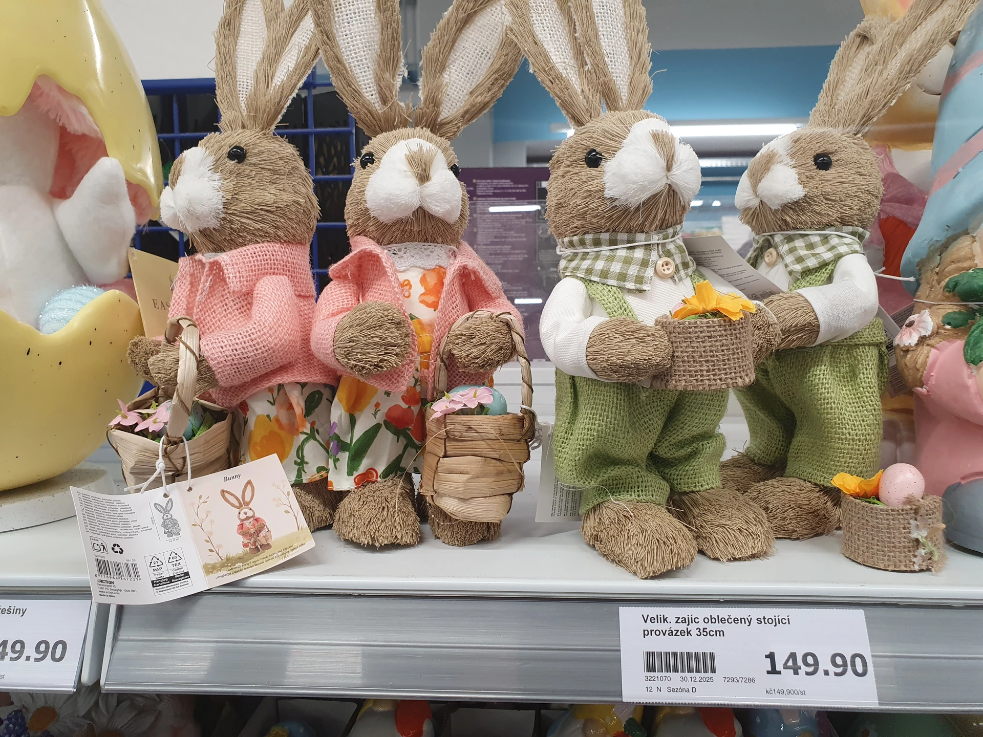 Zatímco v Pepco má slaměný zajíc jen drobnější zdobení a stojí 150 Kč, zajíci v Action mají i oblečení a košíčky a stojí 149,90 Kč. V Pepco mají ještě menšího zajíce za 90 Kč, jeho zdobení je opět střídmější a v packách drží mrkev.