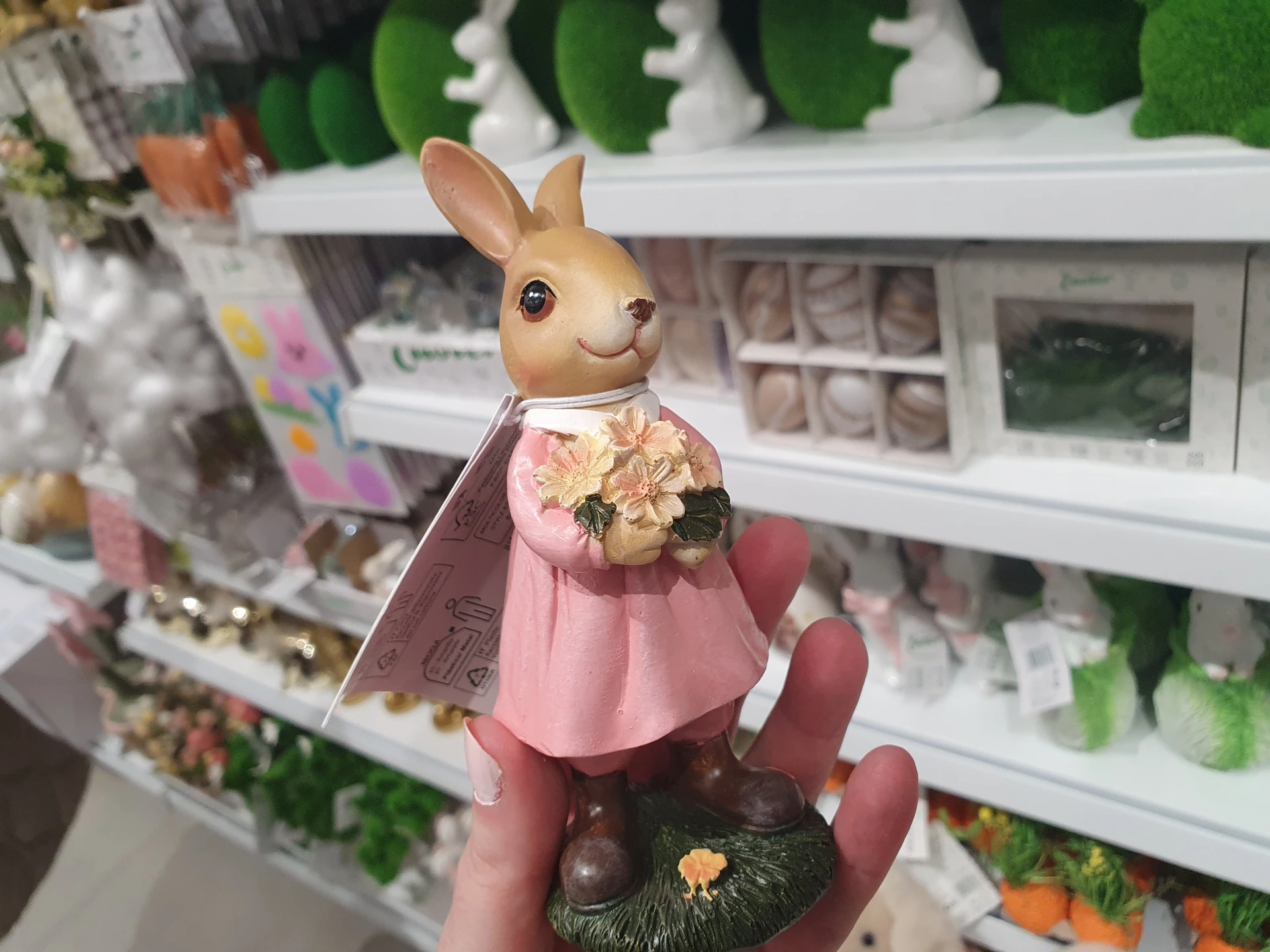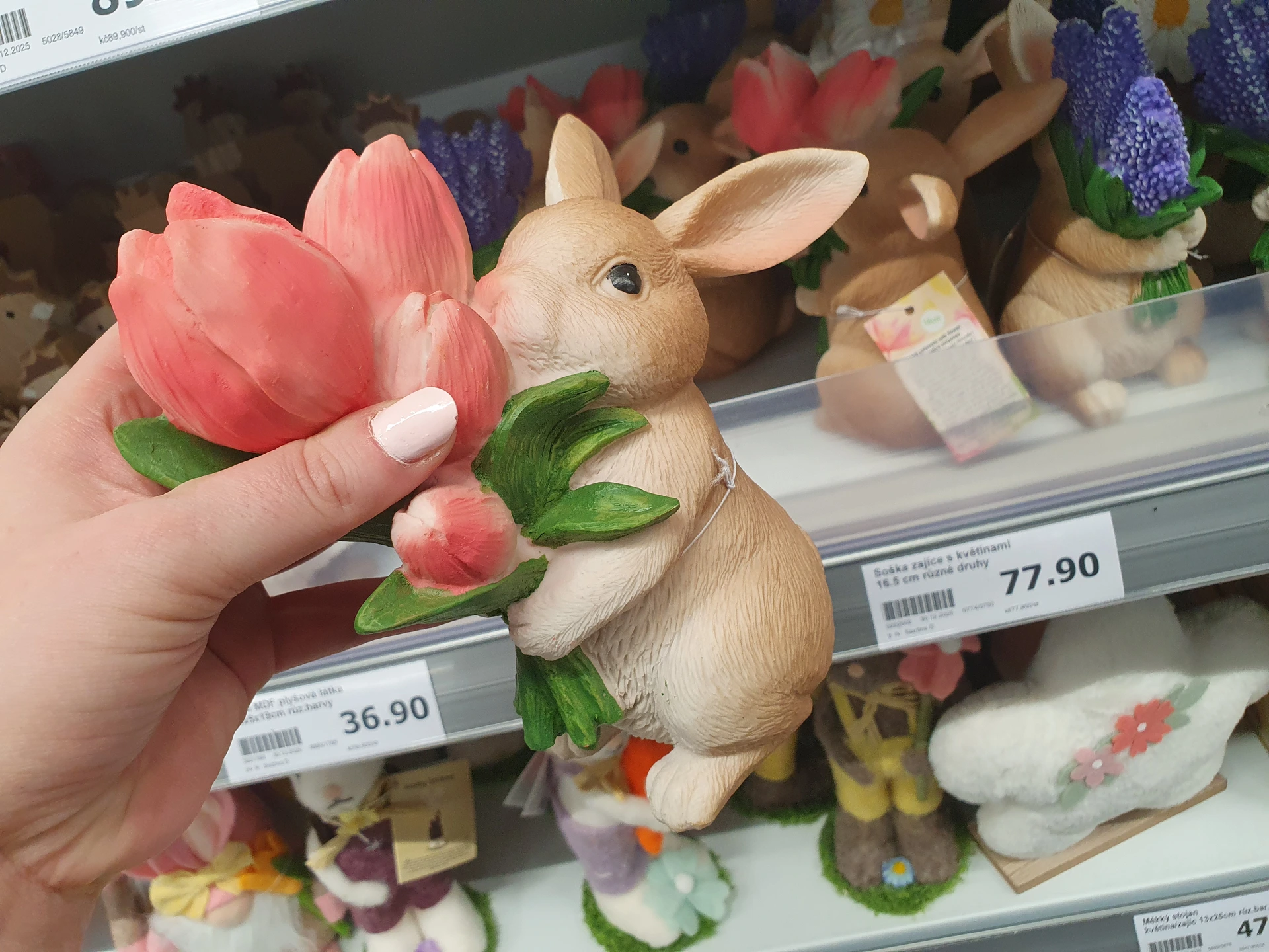 Výraznou a zároveň roztomilou ozdobou jsou figurky zajíců z polyresinu, které mají vypracované i nejmenší detaily. Zatímco v Pepco má zajíc oblečení a v rukou květiny, je i trochu menší a stojí 60 Kč. Zajíc v Action drží velkou kytici květin a stojí 77,90 Kč.