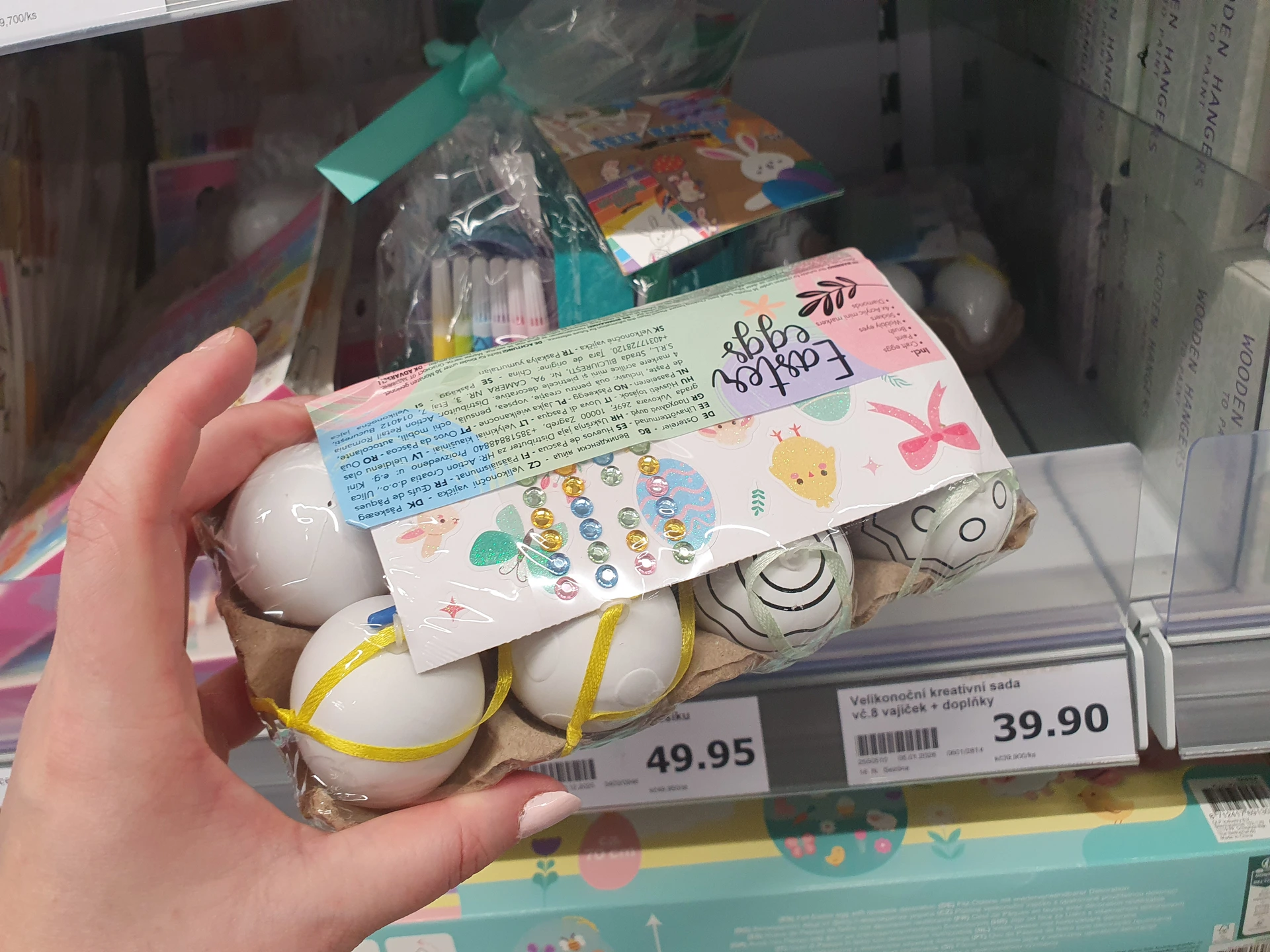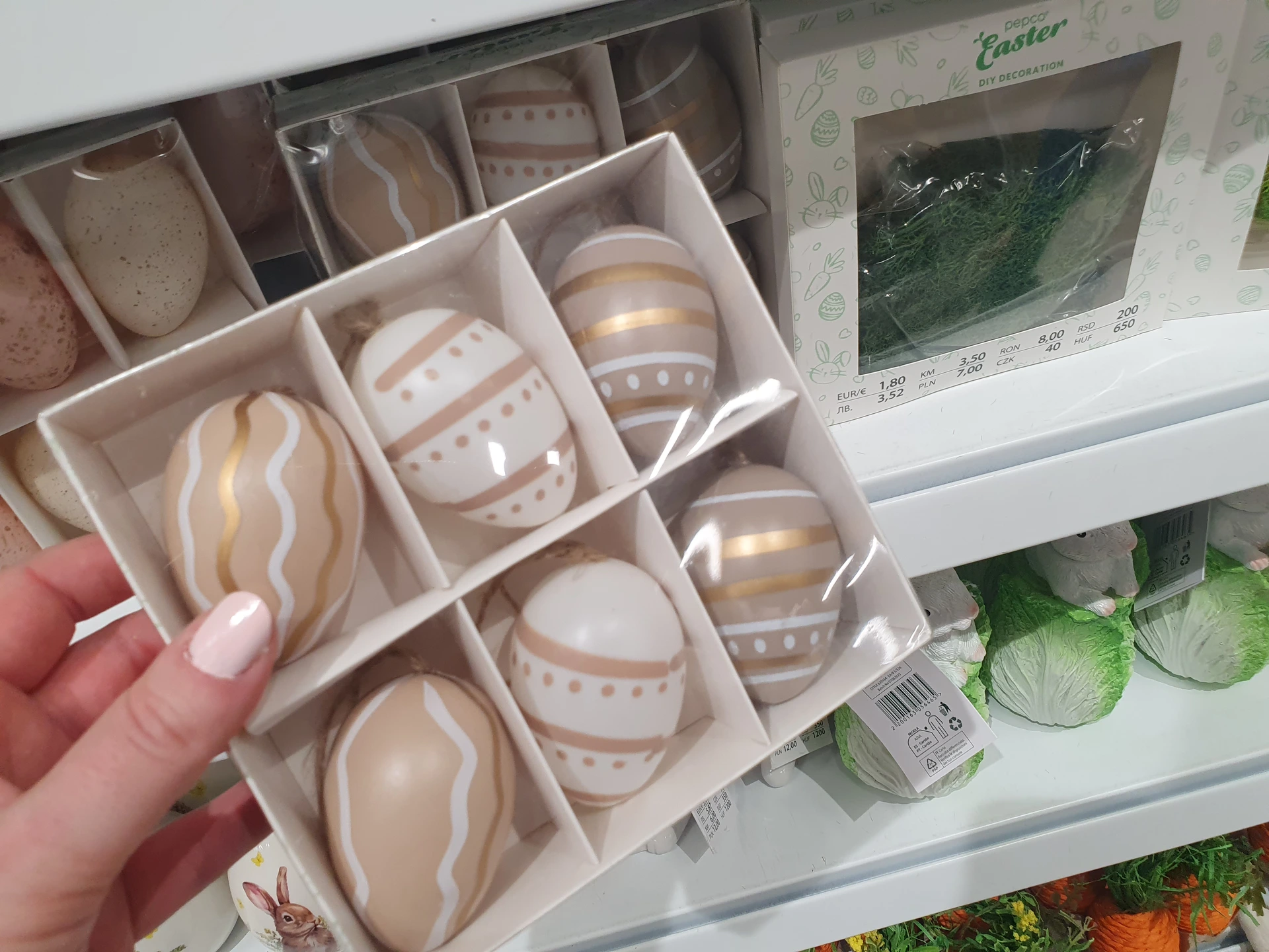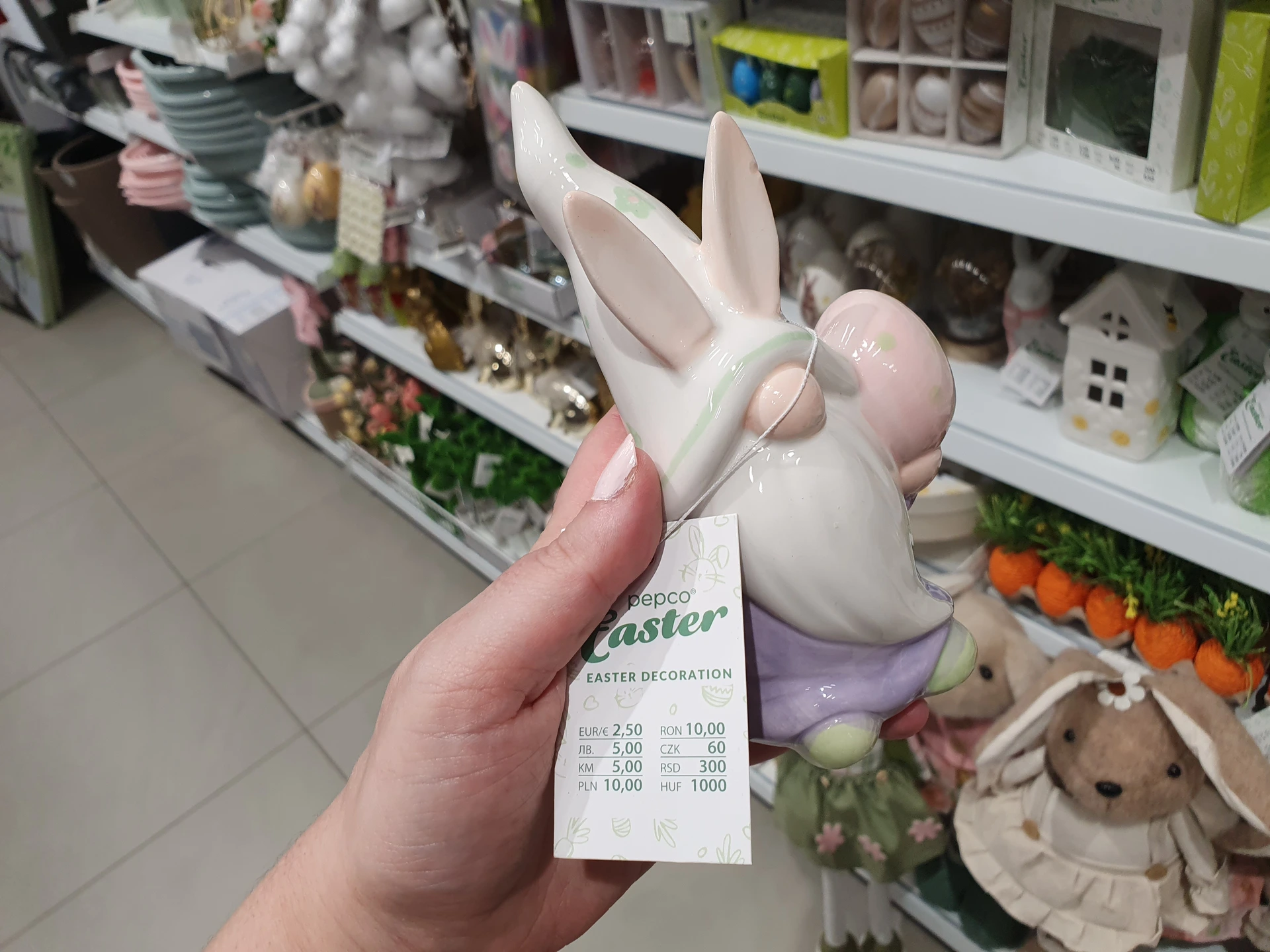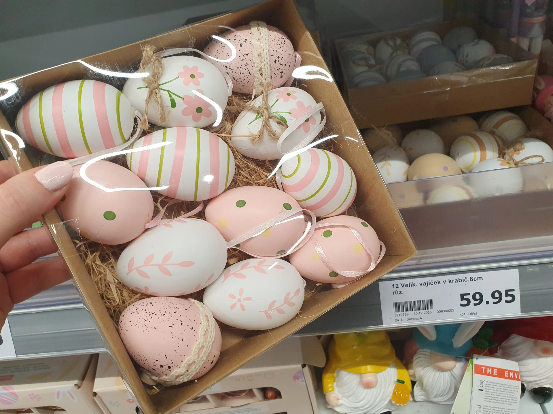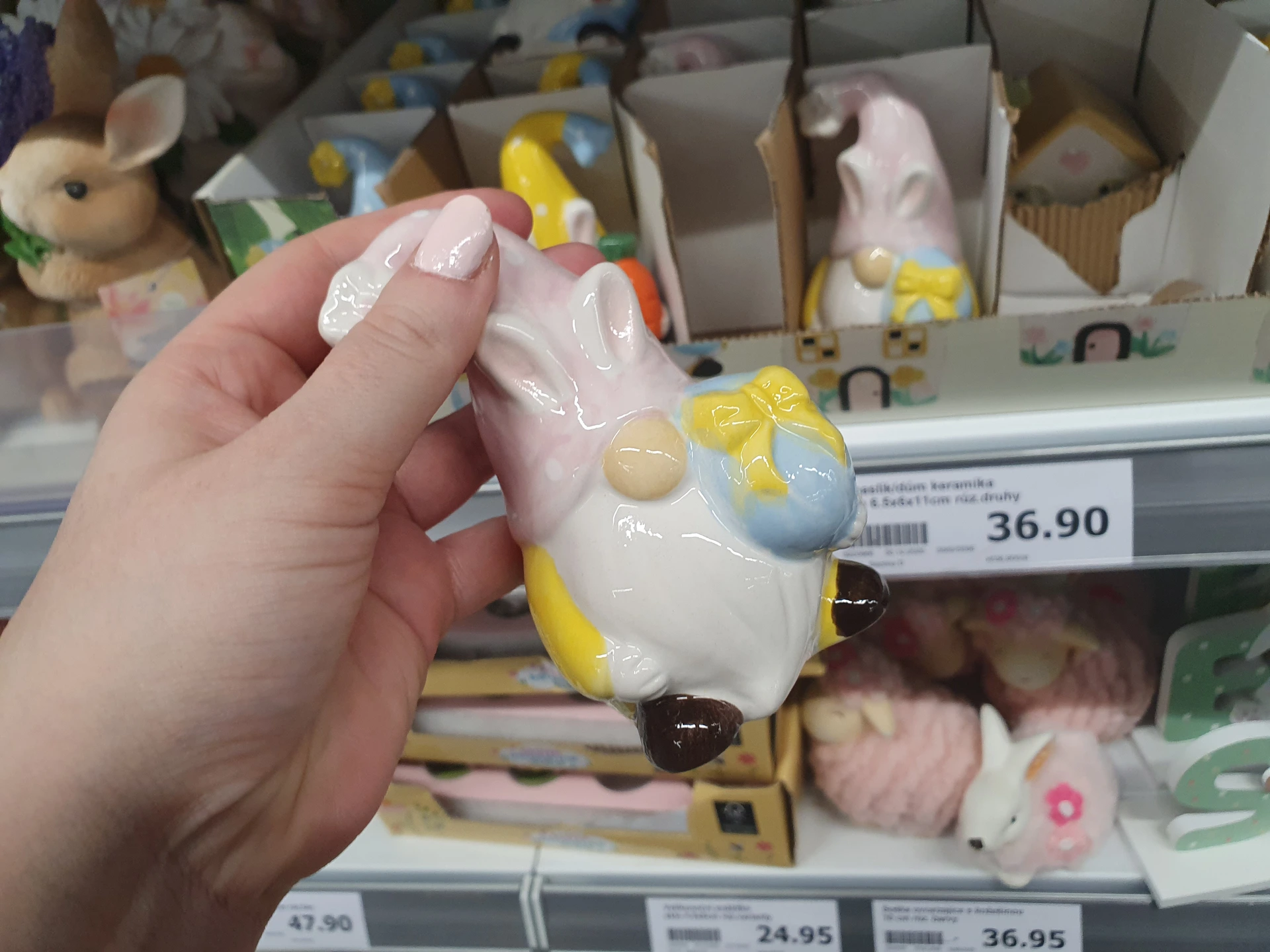 Trpaslíci v pastelových barvách, kteří drží vejce, jsou v regálech obou obchodů. V Action stojí 36,90 Kč a v Pepco je o trochu větší s cenou 60 Kč.