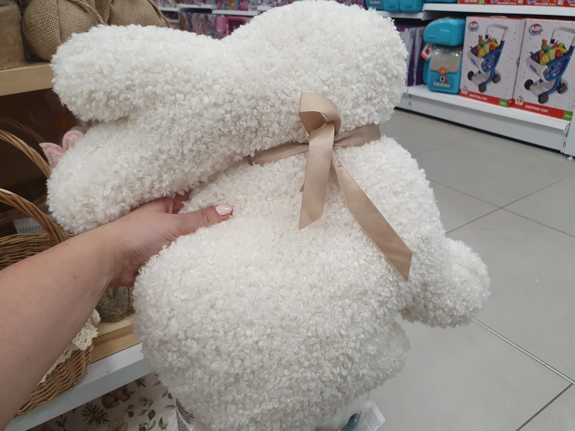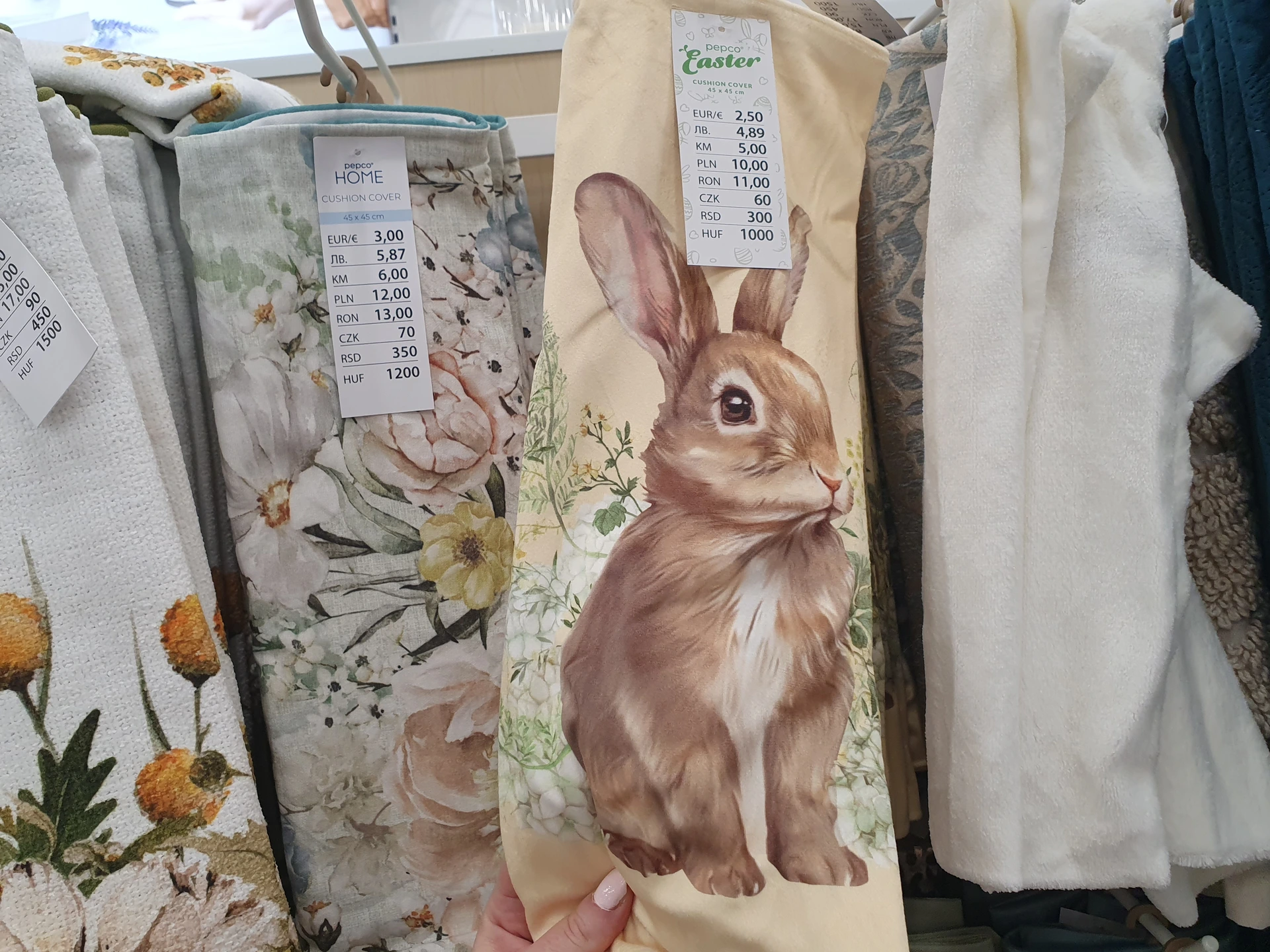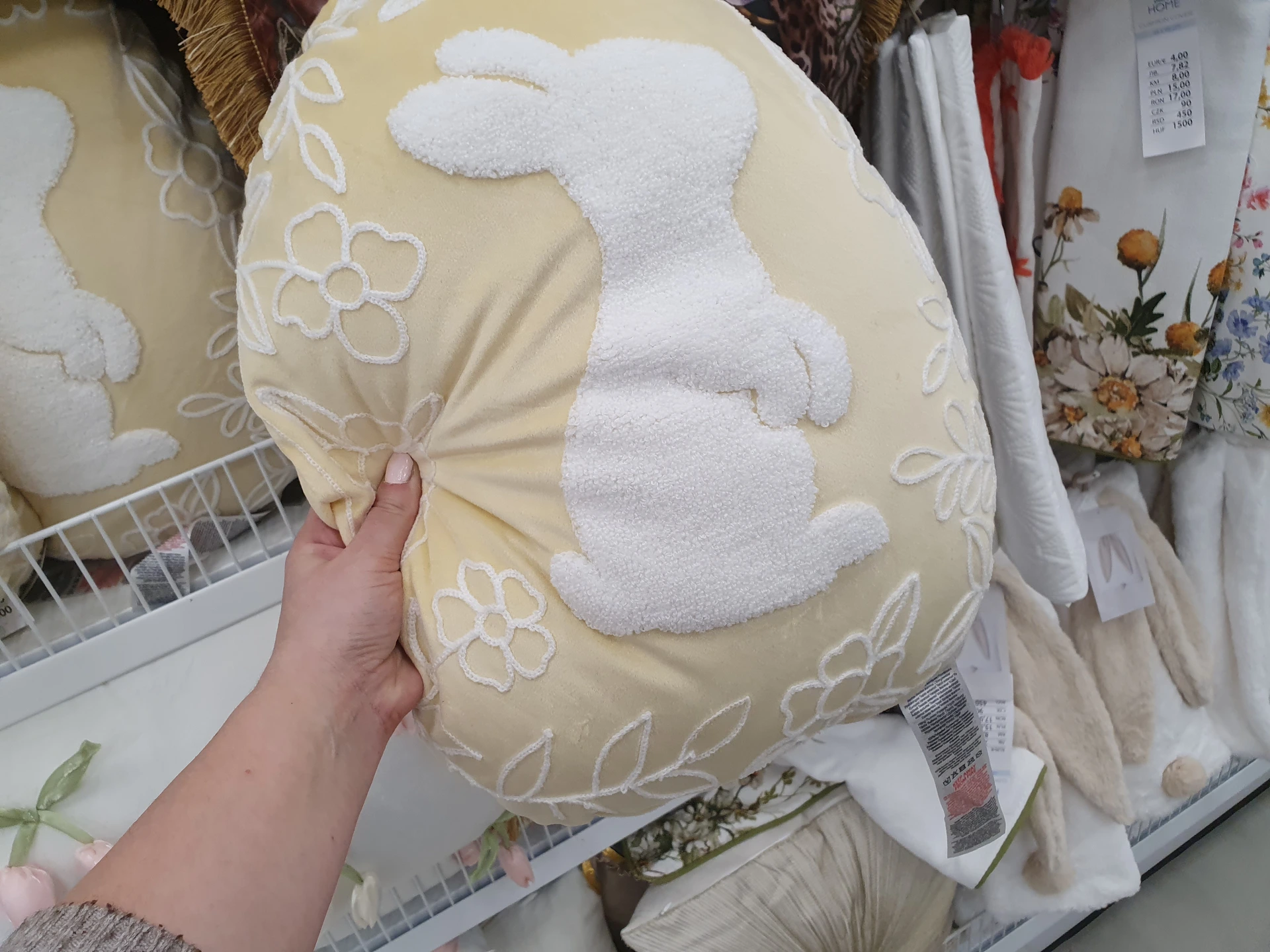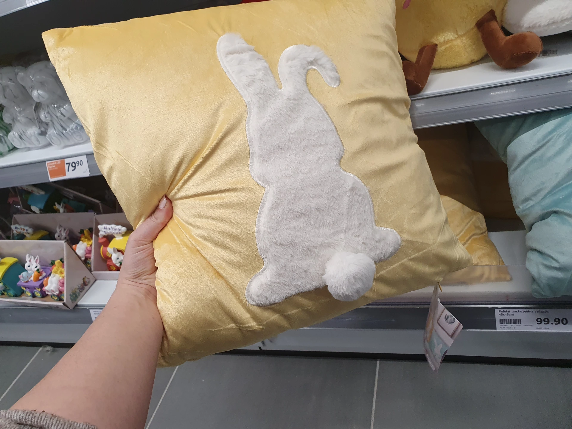 Žluté polštáře s motivem bílých zajíců nabízí v obou obchodech. V Pepco má oválný tvar a kolem zajíce jsou i květiny, polštář stojí 150 Kč. V Action mají klasický polštář, na kterém je zajíc v provedení z umělé kožešiny. Polštář stojí 99,90 Kč.
