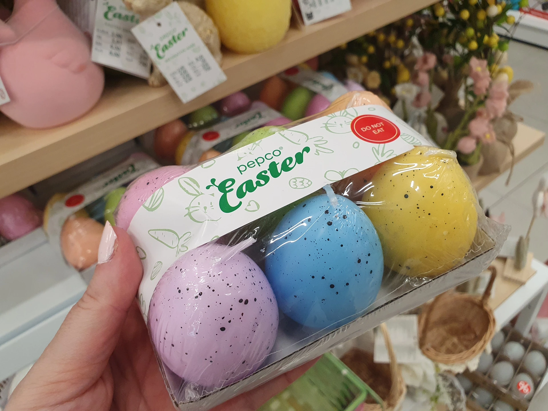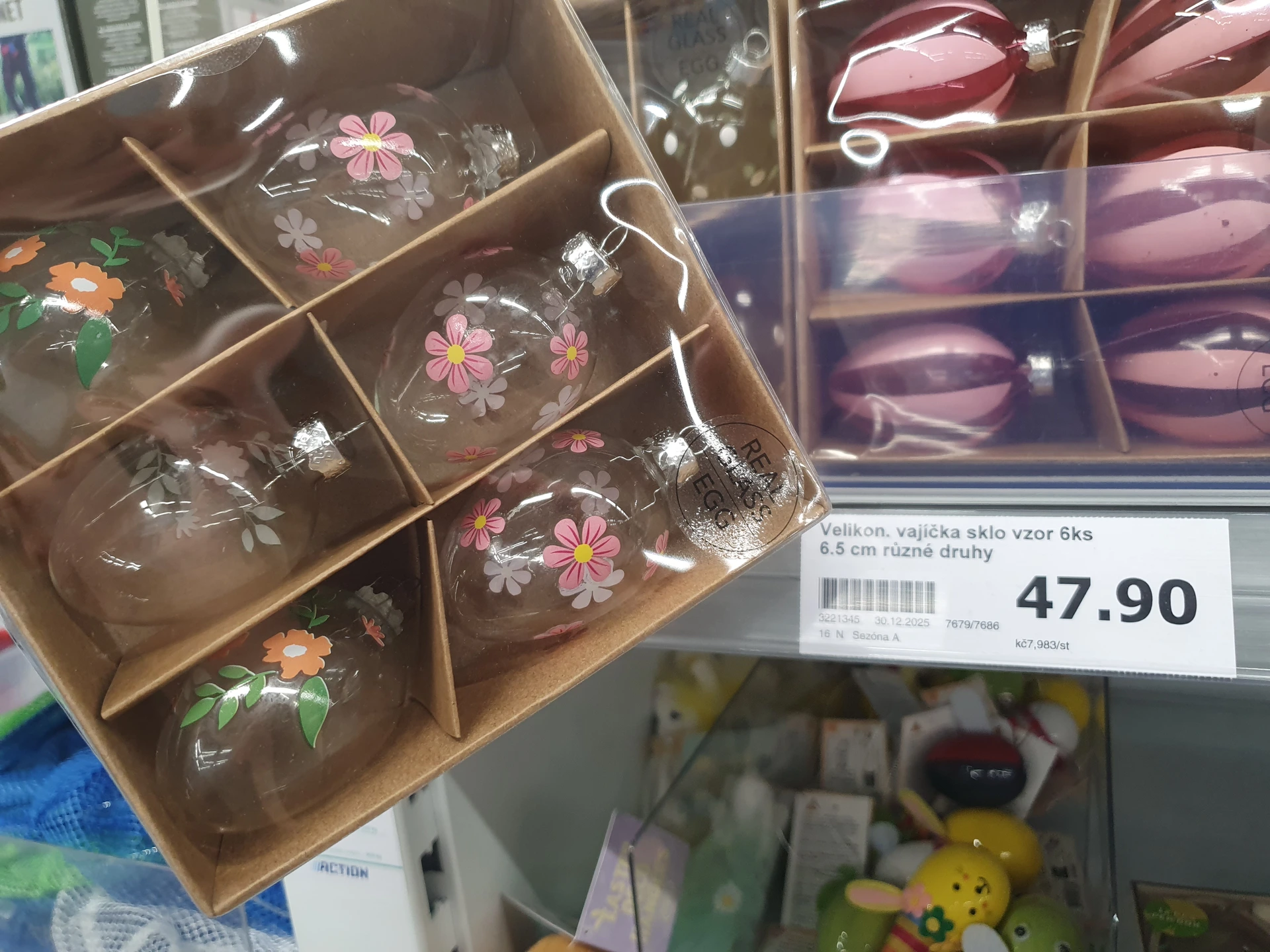 V obou obchodech pořídíte více druhů dekoračních vajec k zavěšení. V Action jsme kromě plastových našli i skleněná vejce, sady plastových vajec jsou obvykle větší po 12 kusech a stojí 59,95 Kč. V Pepco jsou sice jen po 6 kusech, ale mají na výběr více stylů zdobení. Balení stojí 40 Kč.