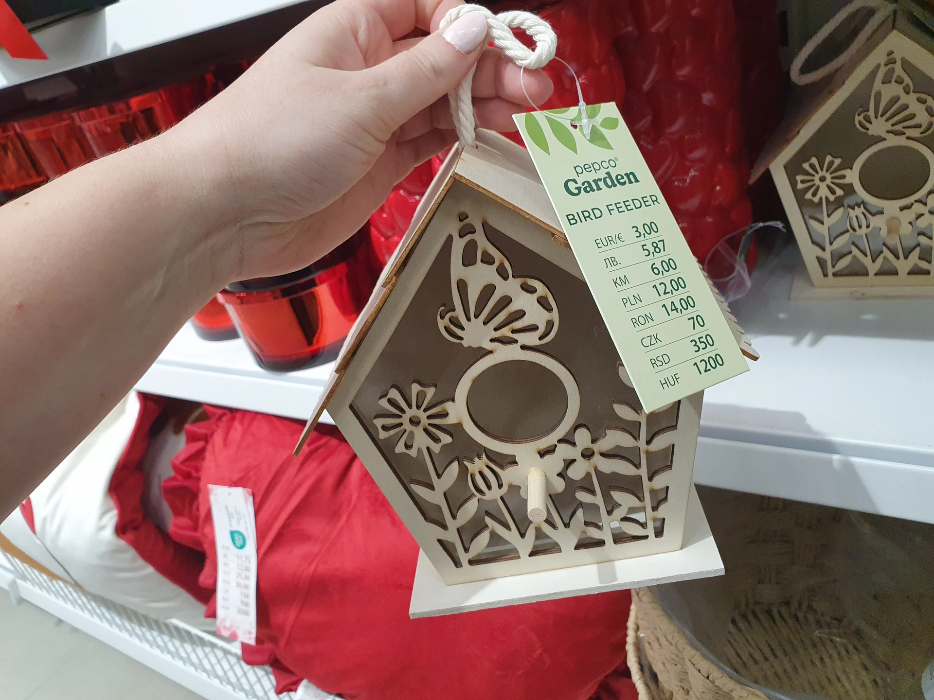 V Pepco mají velmi zdobené krmítko ve tvaru ptačí budky. Kvůli malému otvoru je vhodné jen pro menší ptáky, krmítko stojí 70 Kč. Krmítko v Action zase není určené na semena, ale jen na arašídové máslo nebo lůj. Má velmi jednoduché provedení bez zdobení a stojí 34,90 Kč.
