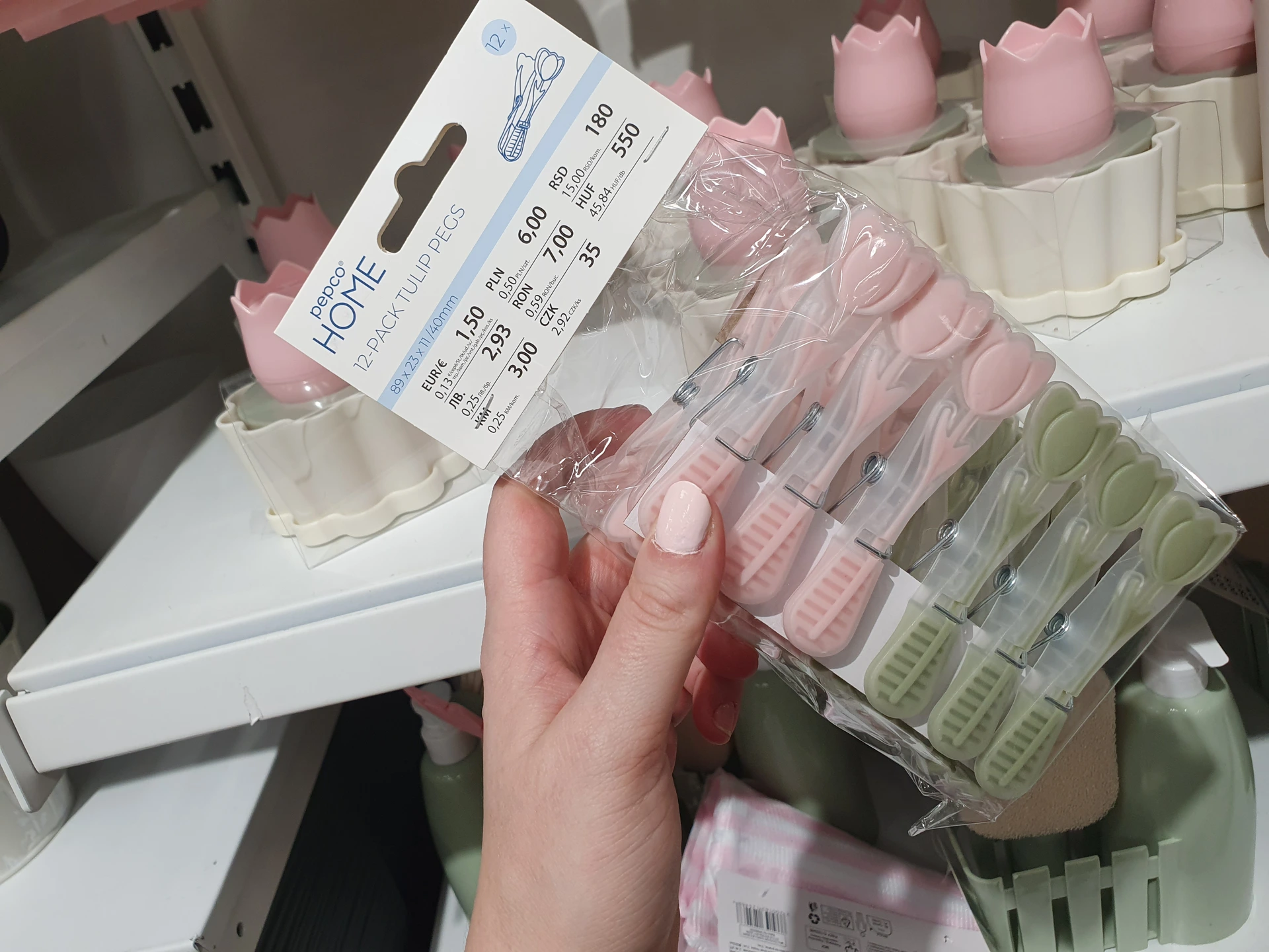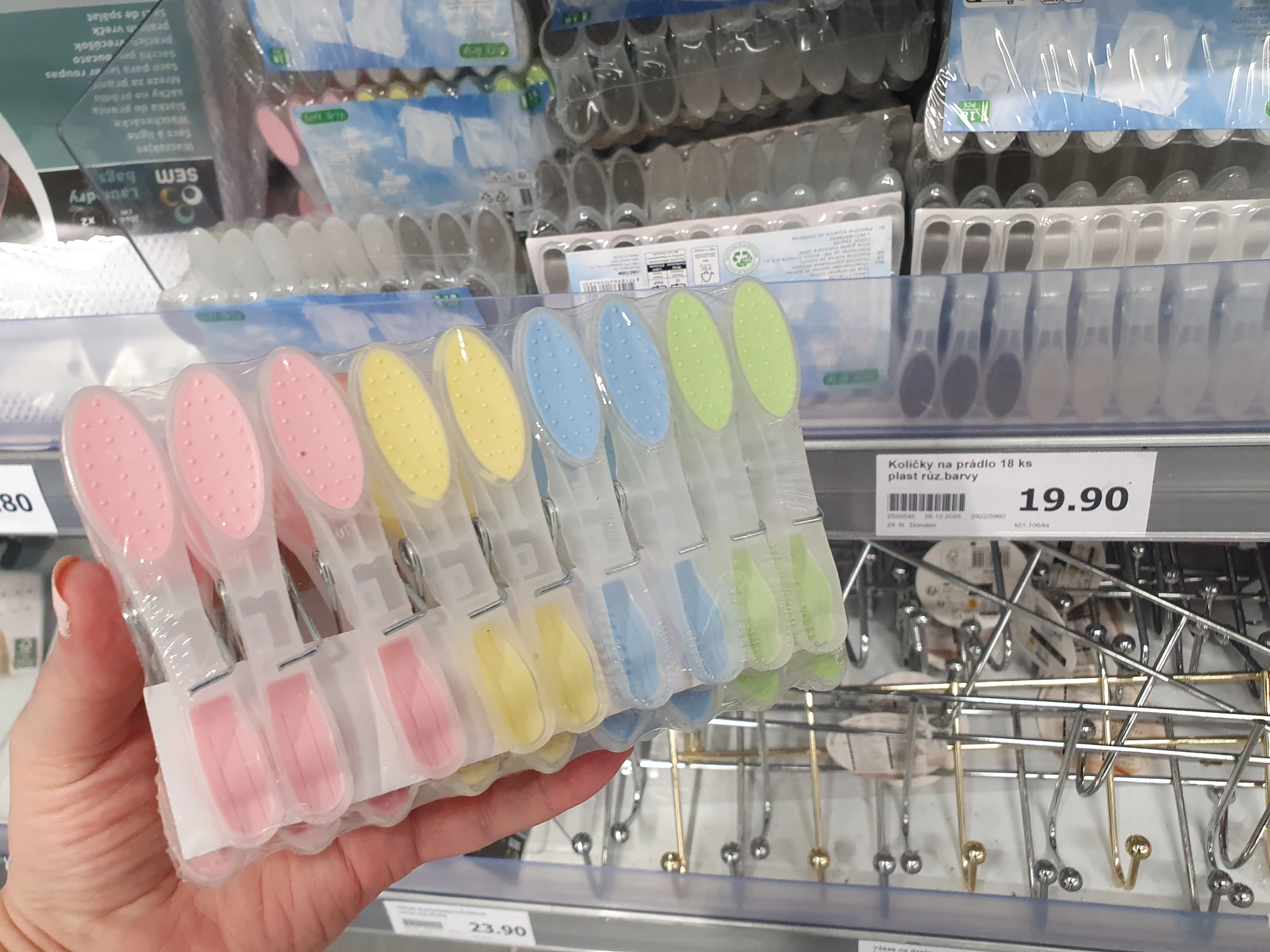Kolíčky v obou obchodech jsou opatřené gumovými částmi, díky kterým se tolik nemačká prádlo a nekloužou z ruky. V Action mají navíc protiskluzové výstupky. Sada 18 kolíčků tu vychází na 19,90 Kč a kolíčky mají různé barvy. Kolíčky v Pepco jsou dražší, sada 12 kolíčků stojí 35 Kč. Má okrasné provedení a kolíčky jsou jen v zelené a růžové barvě.