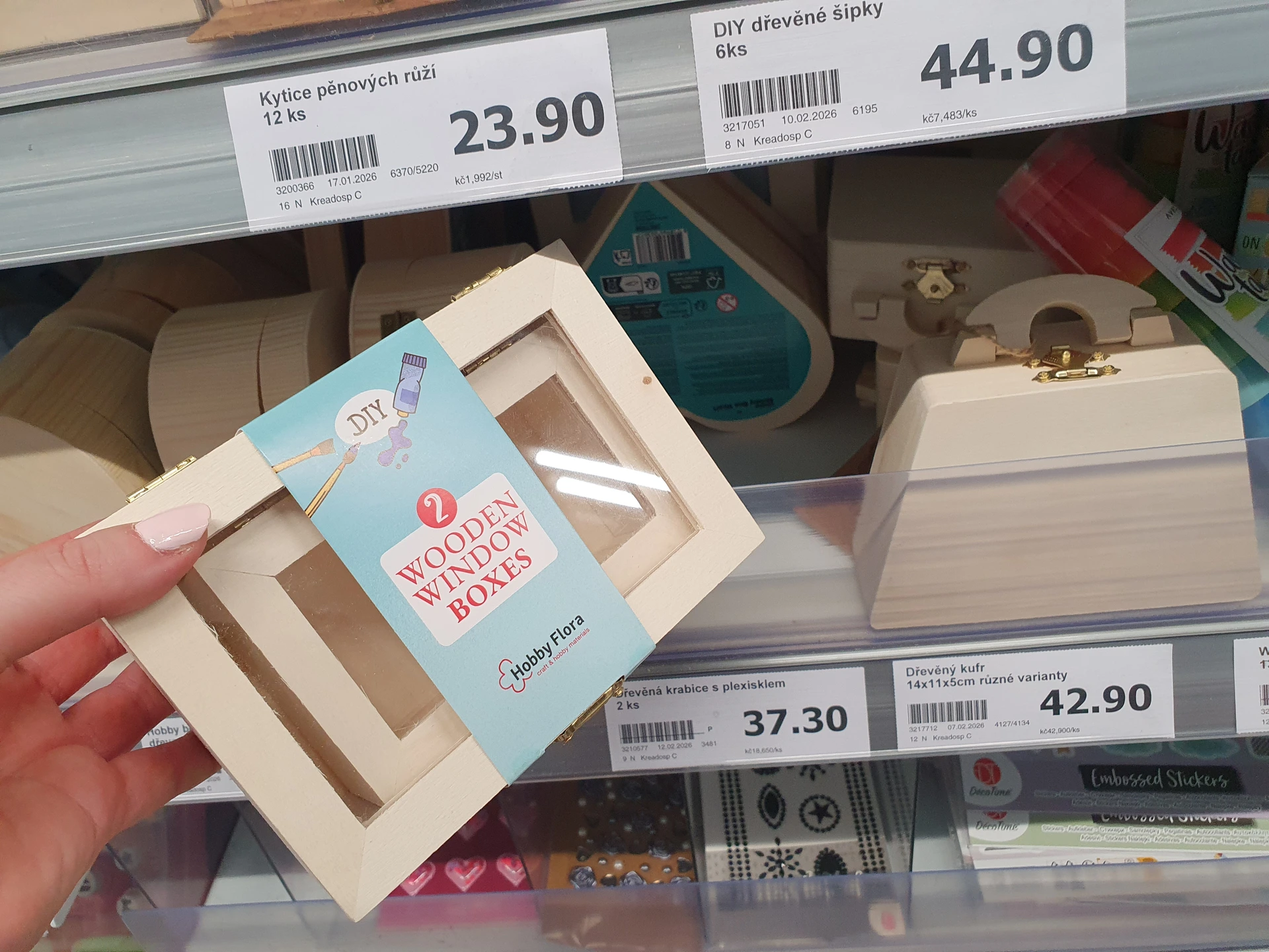 Dřevěné krabičky můžete namalovat nebo je polepit nejrůznějšími nálepkami či kamínky a dalšími ozdobami. V Action jsou krabičky propracovanější a levnější, mají například madla nebo částečně průhledná víka. V Pepco kromě krabiček nabízí i stojan na tužky, krabičky mají ale jen obyčejné provedení. V Action za dřevěný kufřík zaplatíte 42,90 Kč, v Pepco za krabičku podobné velikosti dáte 70 Kč.