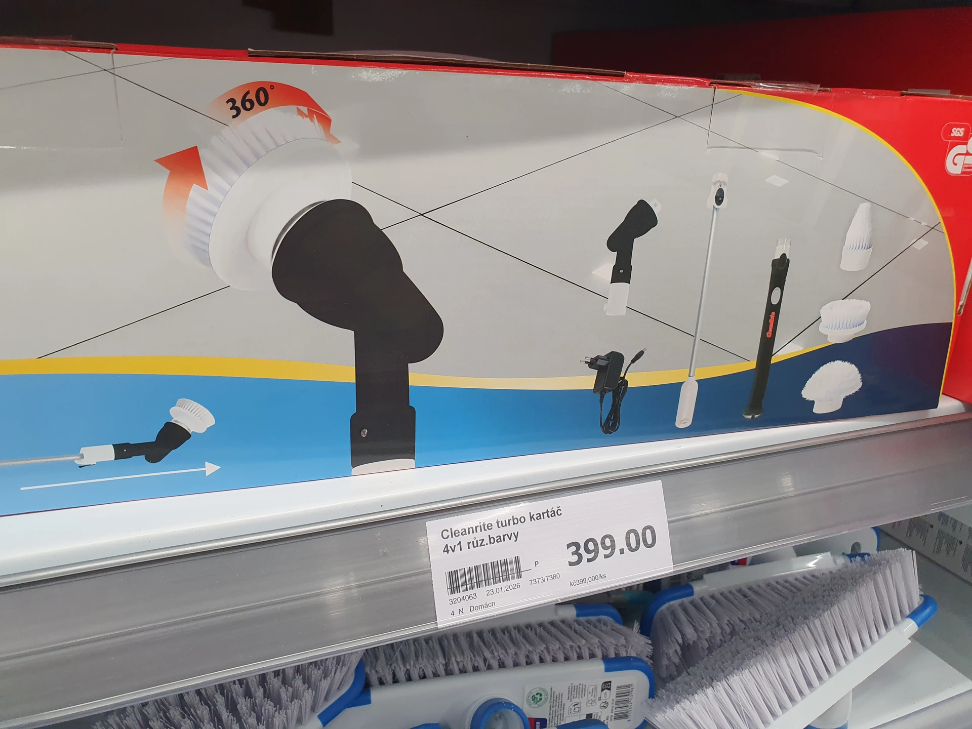 Pro čištění větších ploch nebo vzdálenějších míst je vhodný Bezdrátový čisticí kartáč CleanRite Turbo Scrubber za 399 Kč. Je dobíjecí a v balení najdete 3 nástavce, prodlužovací násada je dlouhá 110 cm.