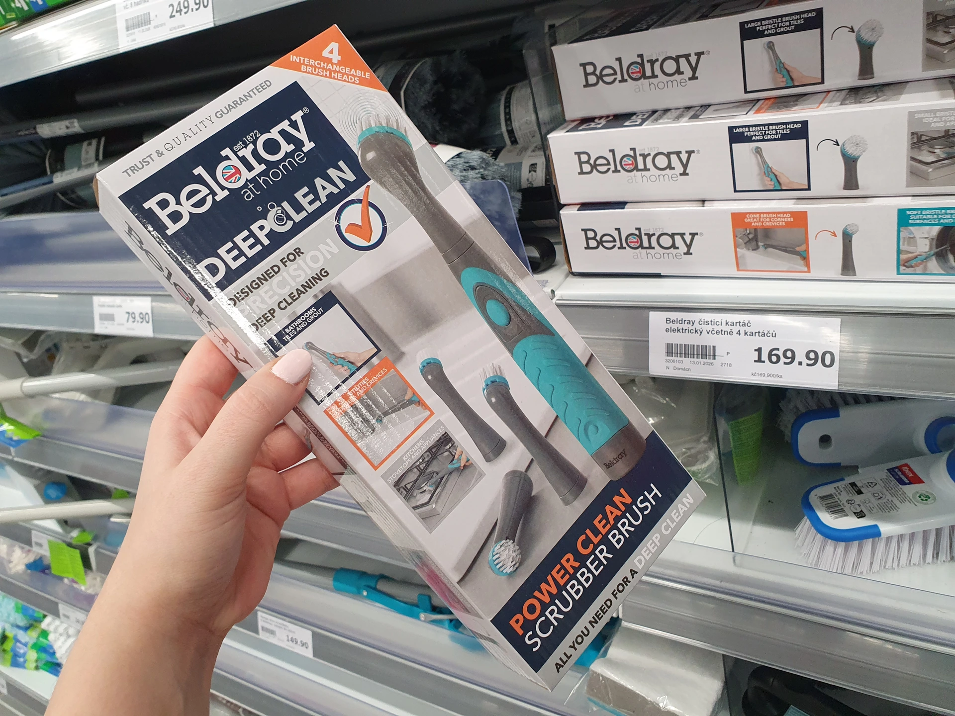 Z produktů, které nejsou dostupné v Pepco, nás zaujaly elektrické čisticí kartáče. V sadě se 4 různými nástavci je Elektrický čisticí kartáč Beldray za 169,90 Kč. S kartáčem se dostanete i do velmi malých prostor a díky tomu, že rotuje, nemusíte vyvinout tolik fyzické síly, funguje na baterie.