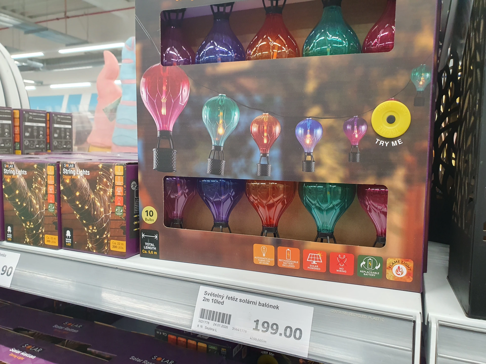 Podobné nabízí i solární světla na zavěšení, ale v Pepco mají pouze vzhled bílých žárovek. Na řetězu jich je 10 kusů a stojí 200 Kč. V Action mají tvar horkovzdušných balónů a žárovky jsou barevné. Na řetězu jich je také 10 a stojí 199 Kč.