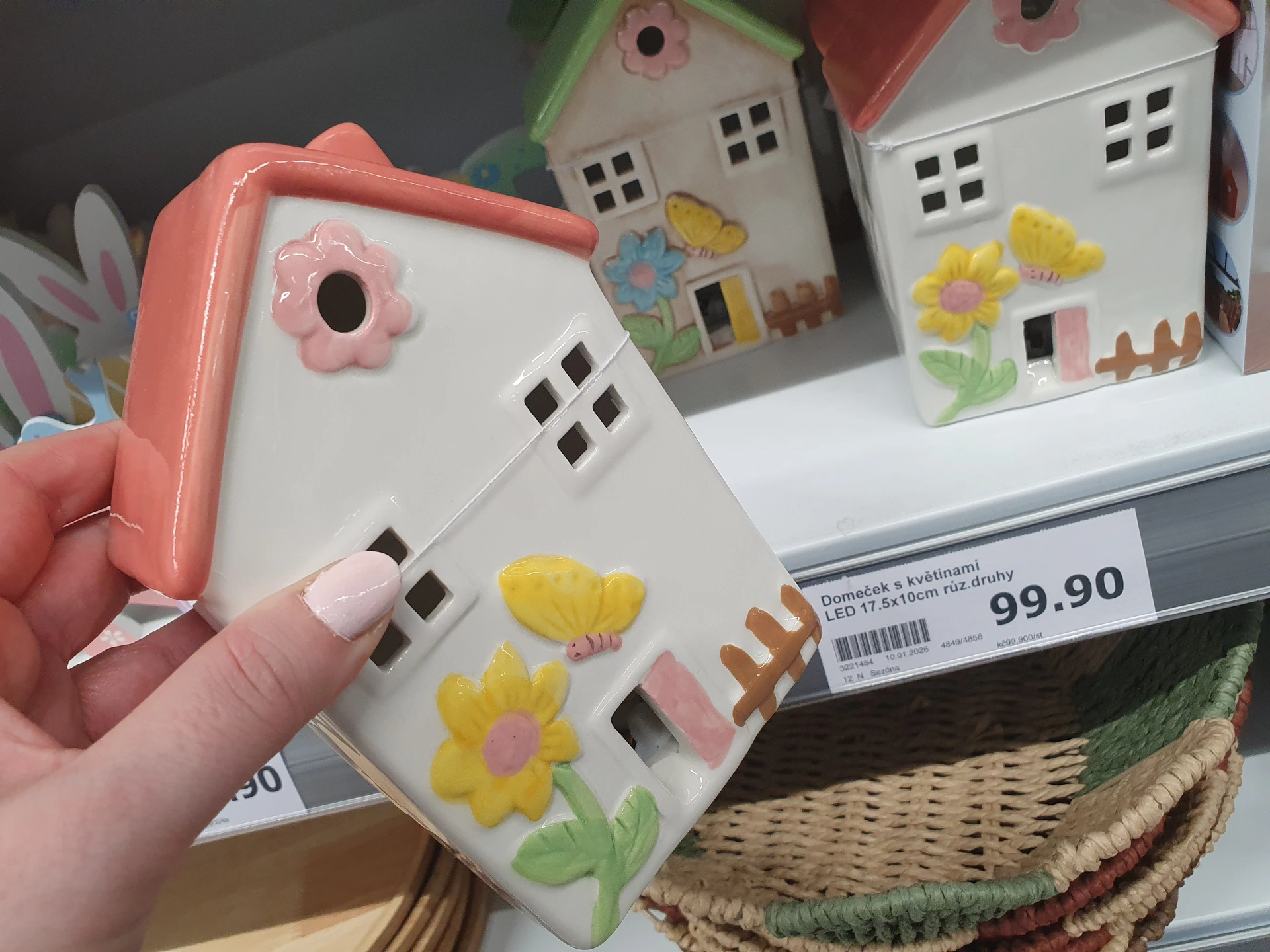 Keramický domeček s LED osvětlením a jarními květinami pořídíte ve větším provedení v Action za 99,90 Kč, na výšku má zhruba 17 cm. Menší domeček s LED osvětlením mají v Pepco za 50 Kč, na výšku má přibližně 10 cm.