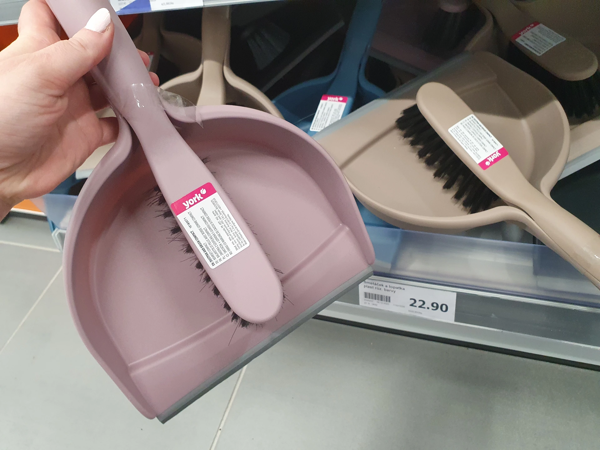 Sada lopatky se smetáčkem z Pepco je opět v provedení se zdobením za 50 Kč. Pružná lišta na lopatce je širší, budou se na ni proto snadno nametat i drobnější nečistoty. Smetáček má hustá vlákna. Sada z Action je bez zdobení a stojí 22,90 Kč. Pružná lišta je ale tenčí a štětiny některých smetáčků v regálech byly ohnuté, může mít proto nižší životnost. Je dostupný ve fialové, béžové, modré, šedé nebo černé barvě.