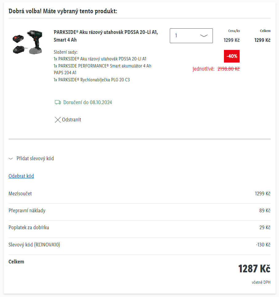 Čas od času se nám nabídne možnost doručit našim čtenářům i nějakou tu slevičku navíc. Tentokrát můžete využít limitované nabídky na e-shopu LIDLu. S níže uvedeným kódem můžete nakoupit celý sortiment v akci Hit týdne s dodatečnou slevou 10 %. Slevový kód můžete aplikovat v posledním kroku objednávky a sleva se odečte z již snížené ceny produktu. Ale pozor, sleva platí pouze 2. října.
