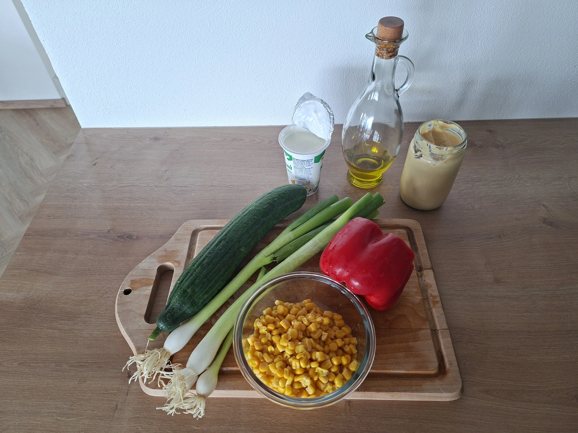 Těstoviny uvařte podle návodu, sceďte a přidejte 2 až 3 lžíce olivového oleje, aby se neslepily. Na drobno nakrájejte zeleninu a sceďte kukuřici. Cibulku orestujte na oleji a poté na pár minut přidejte také papriku. Poté vše smíchejte a přidejte sůl i pepř dle chuti. Množství zakysané smetany a hořčice taky můžete upravit dle libosti, případně lze přidat pár lžiček klasické majonézy.