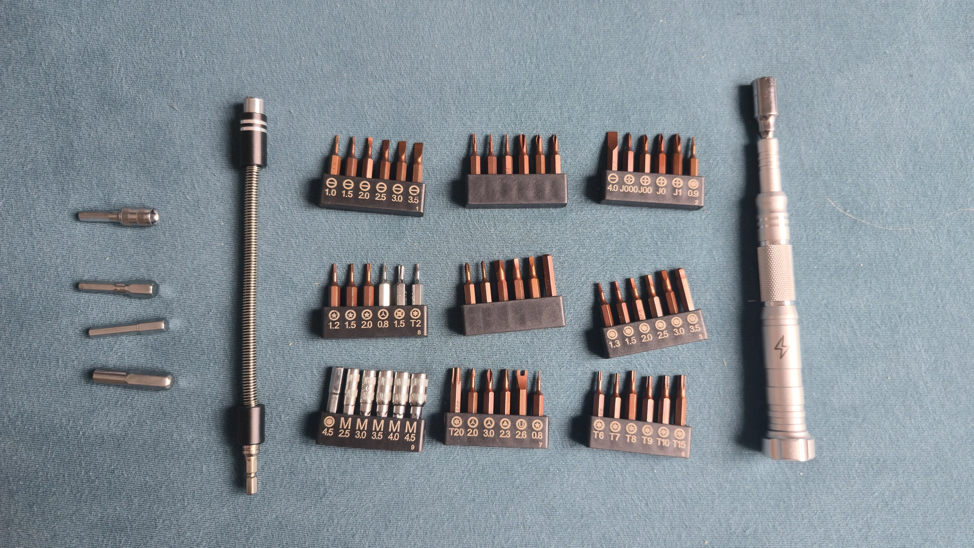 Sada obsahuje neuvěřitelných 45 magnetických bitů z tvrdé oceli S2 a dalších 6 bitů z materiálu Cr V. K tomu připočítejte flexibilní nástavec o délce 15 centimetrů, který se ohýbá do všech stran. Právě tenhle nástavec je k nezaplacení ve chvíli, kdy potřebujete povolit šroubek v nějakém hlubokém nebo špatně přístupném rohu, kam se s rovným šroubovákem prostě nedostanete.