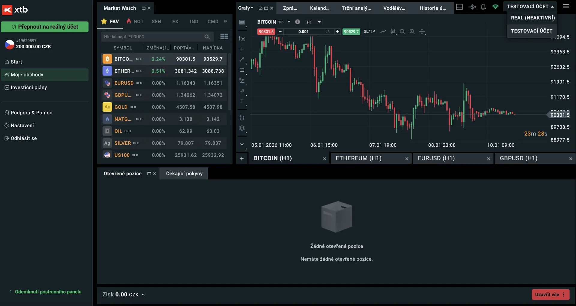 5. Okno zavřete a v horní liště přepněte na testovací neboli demo účet.