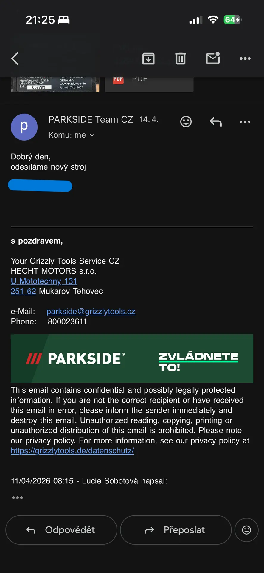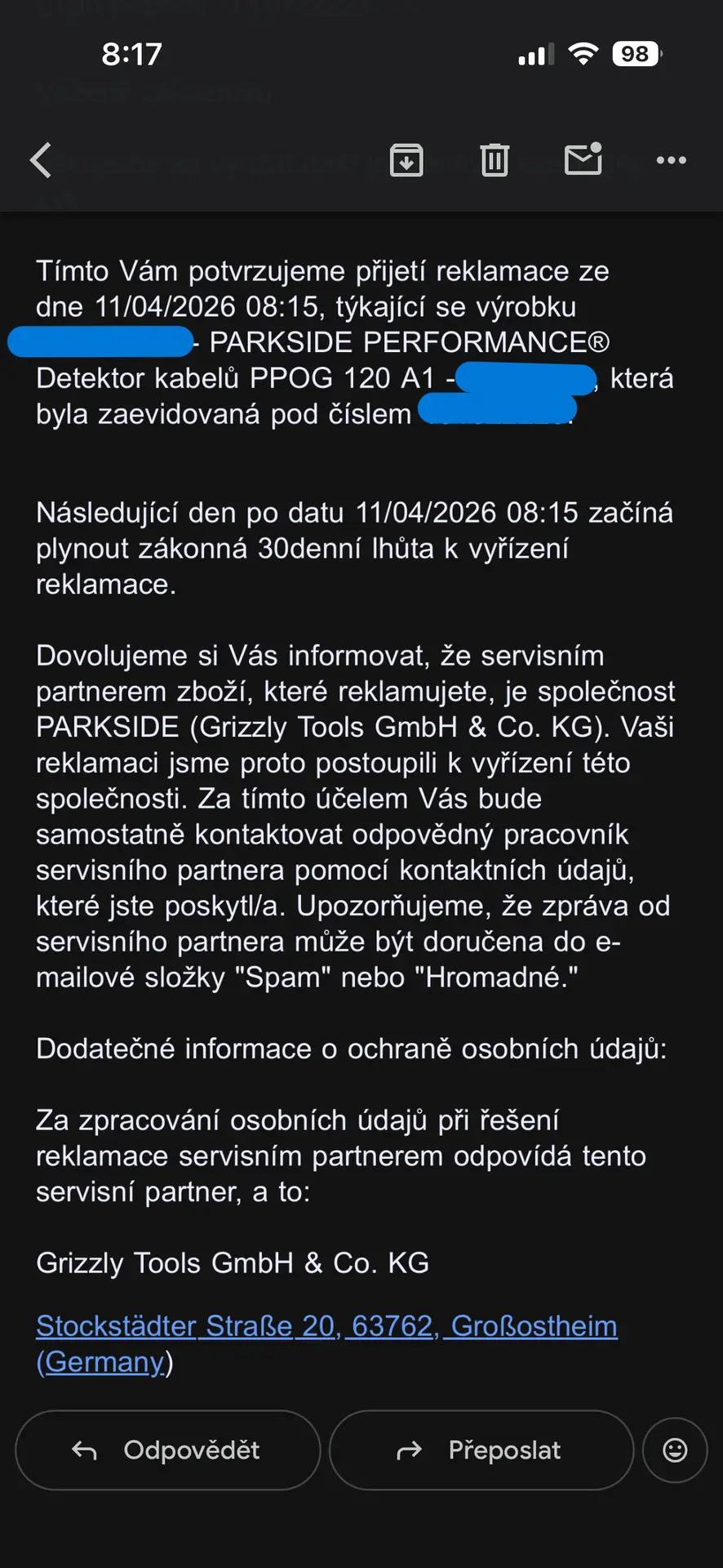 V sobotu 11. 4. jsem proto přes online asistenta Lidlu zadala reklamaci. Stačilo popsat problém a doplnit základní údaje. Během chvíle přišlo potvrzení, že reklamaci přebírá servisní partner Grizzly Tools.