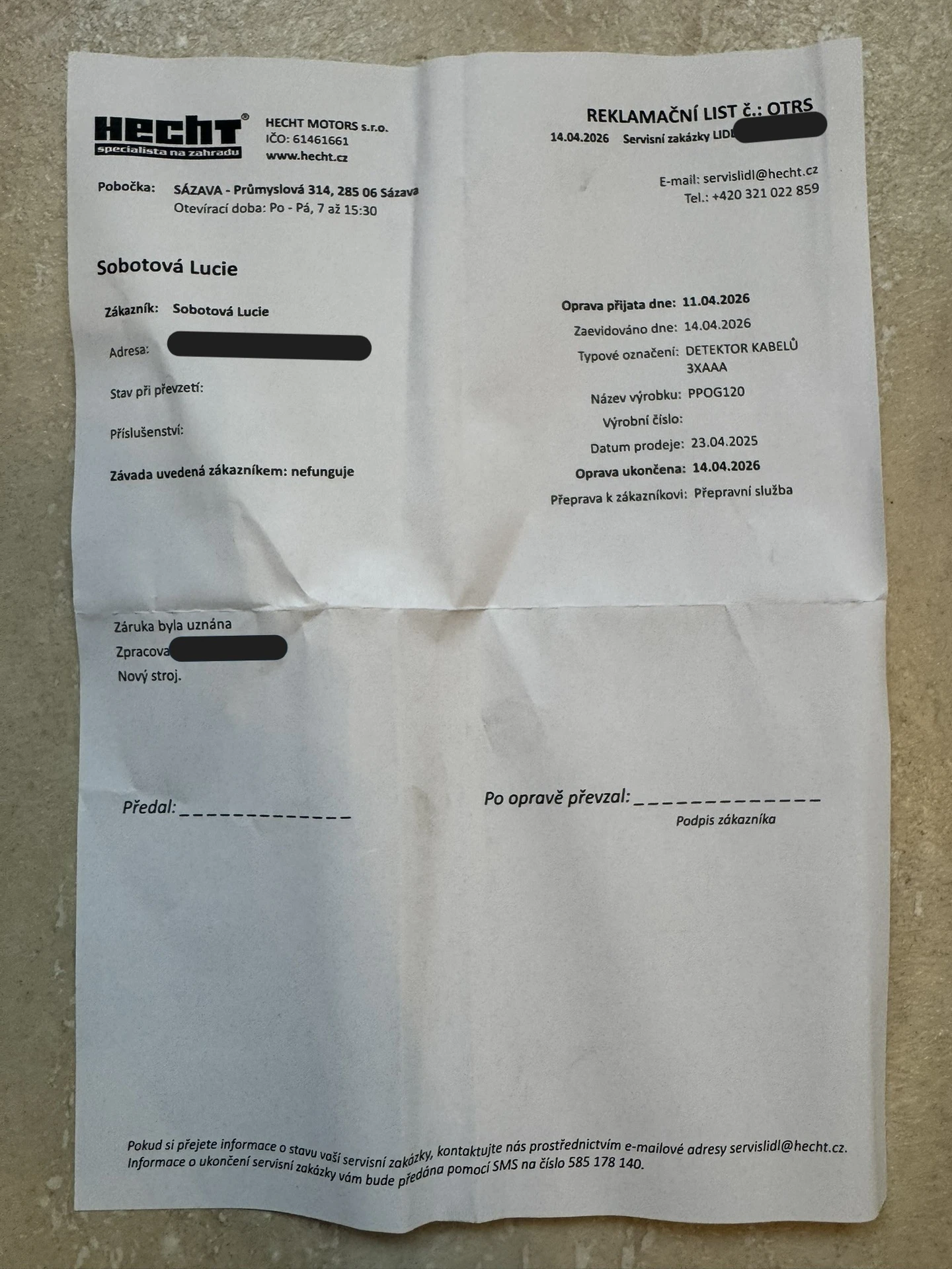 Hned v pondělí se ozval servis (zastoupený HECHT MOTORS) s tím, že mi pošlou nový kus. Stačilo dodat fotku štítku, doklad o koupi a adresu. Ještě ten den jsem vše odeslala. Následující den přišlo potvrzení, že detektor posílají.