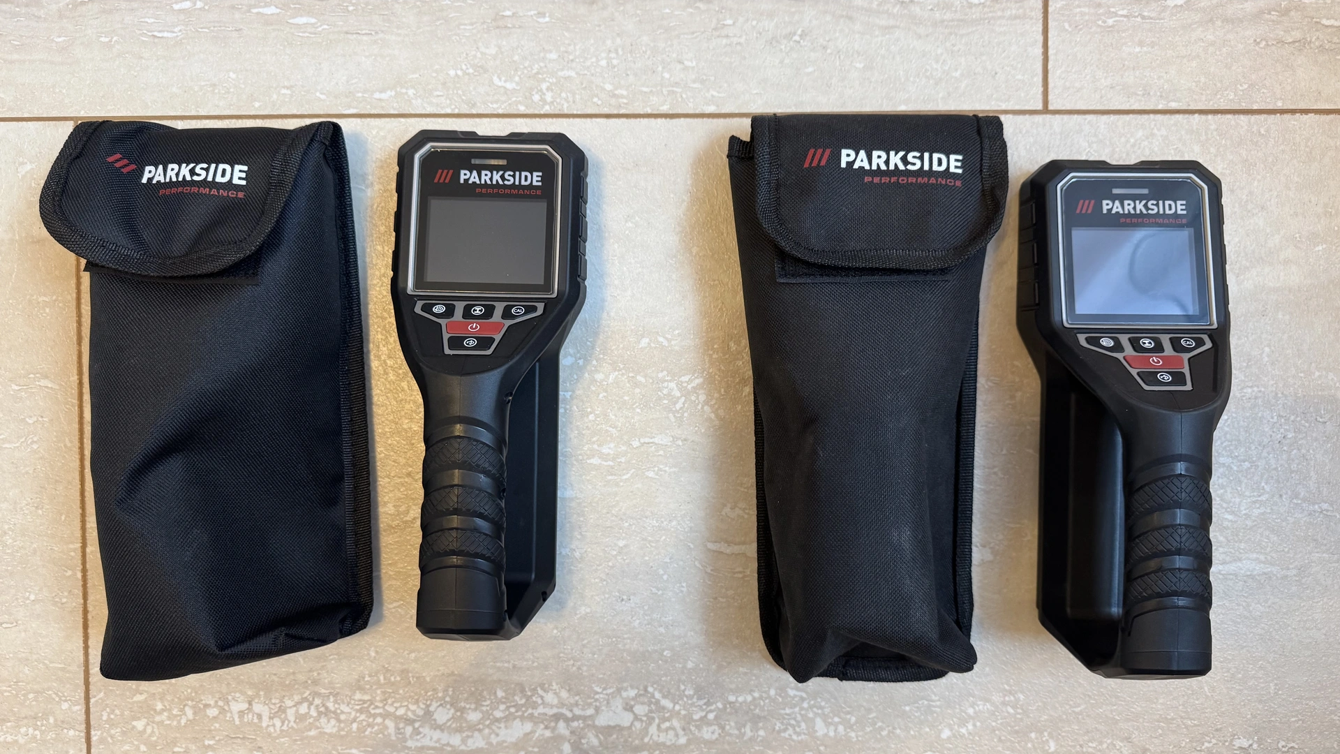 Dva detektory Parkside Performance PPOG 120 A1 – vlevo nový kus z reklamace, vpravo původní se závadou.