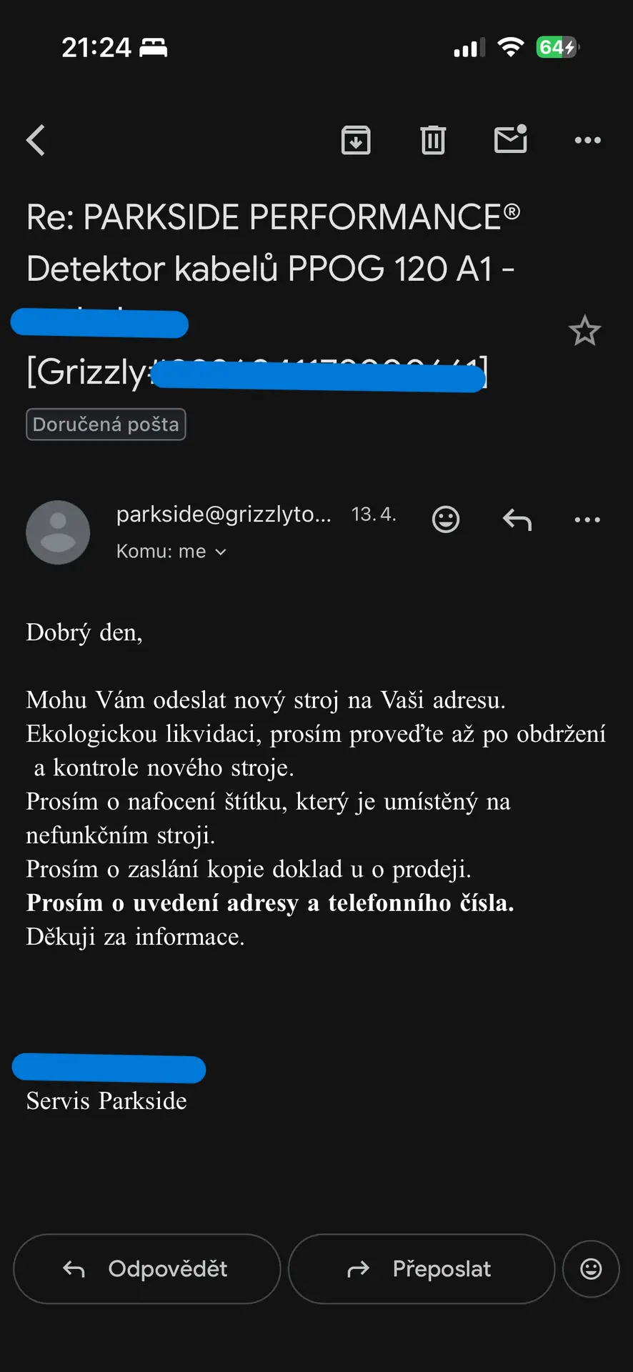 • 11. 4. – automatické potvrzení o přijetí reklamace a předání servisnímu partnerovi Grizzly Tools