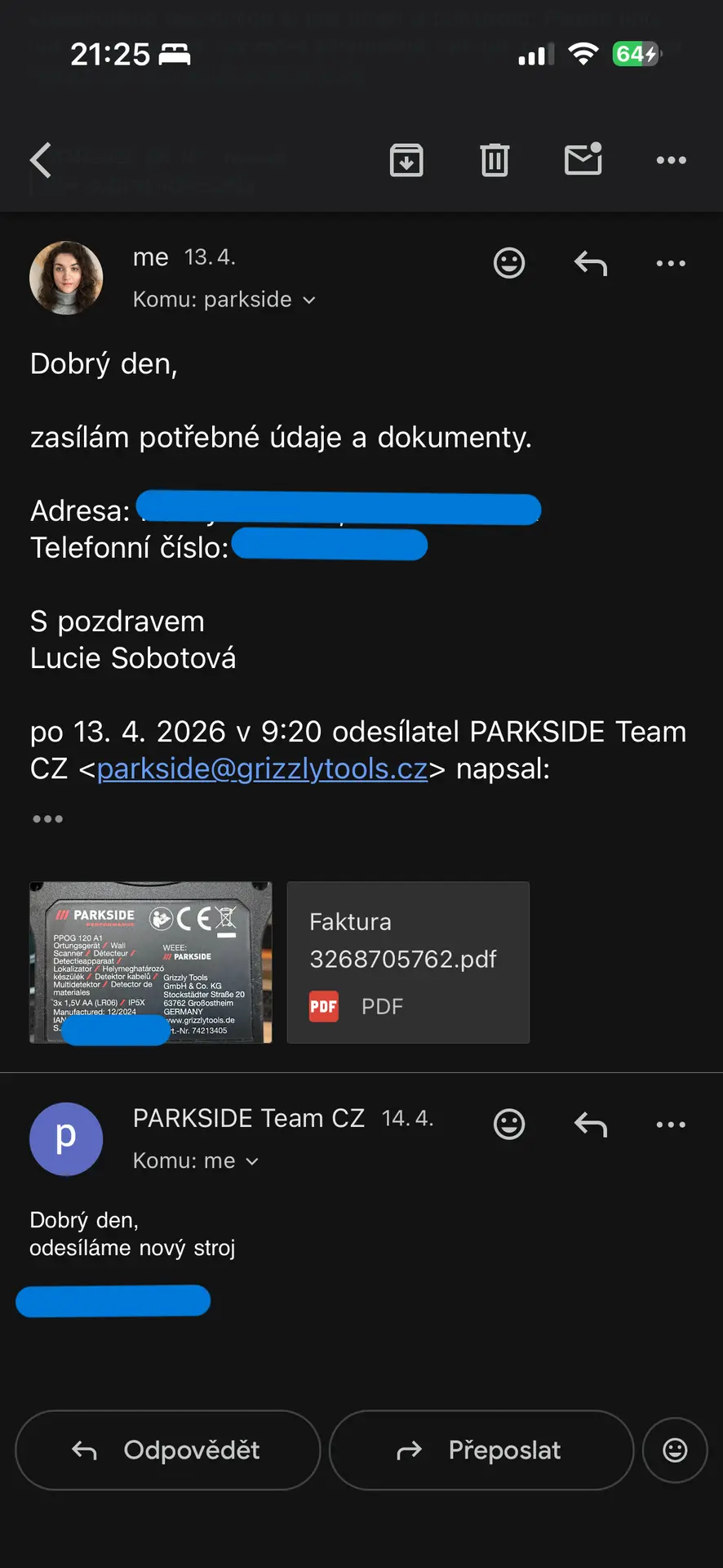 • 14. 4. (úterý) – potvrzení, že odesílají nový kus