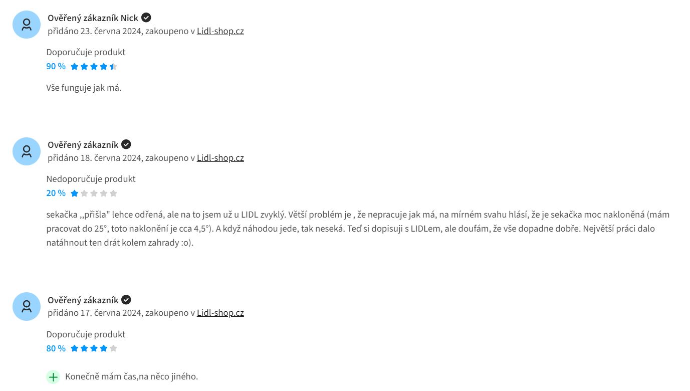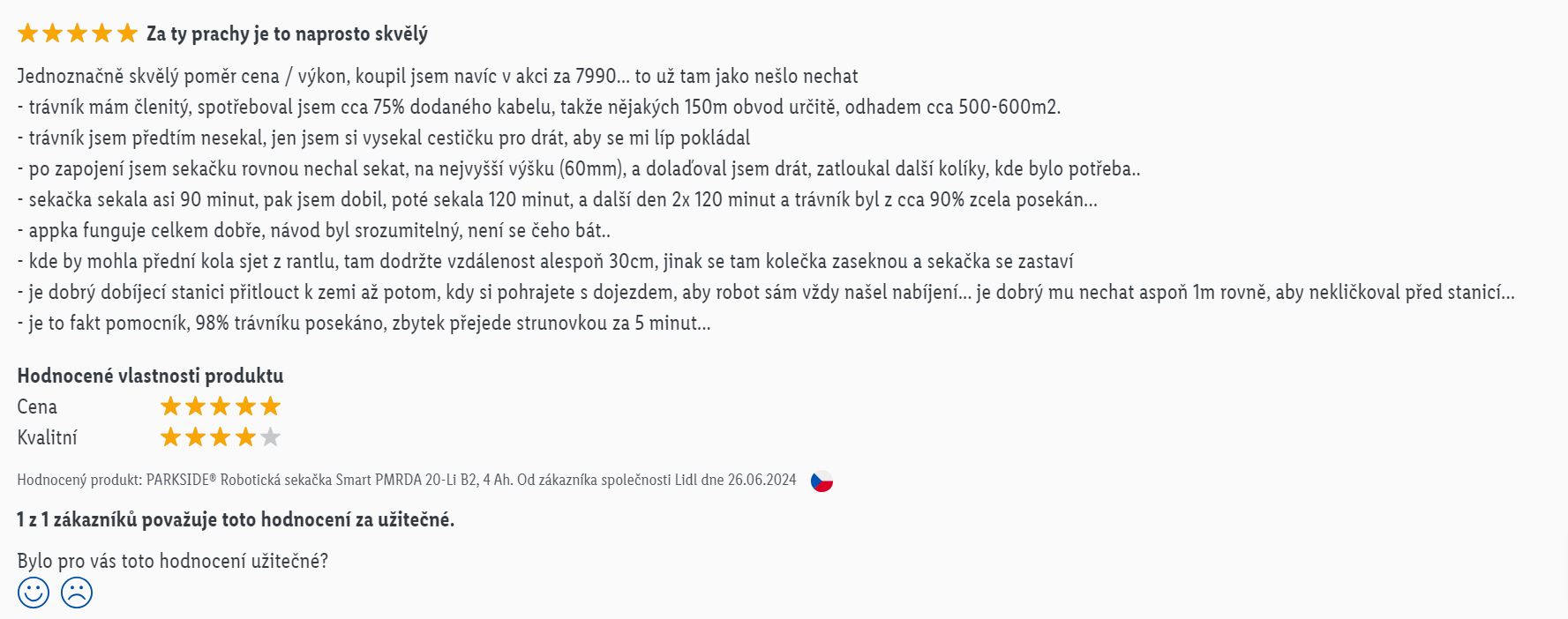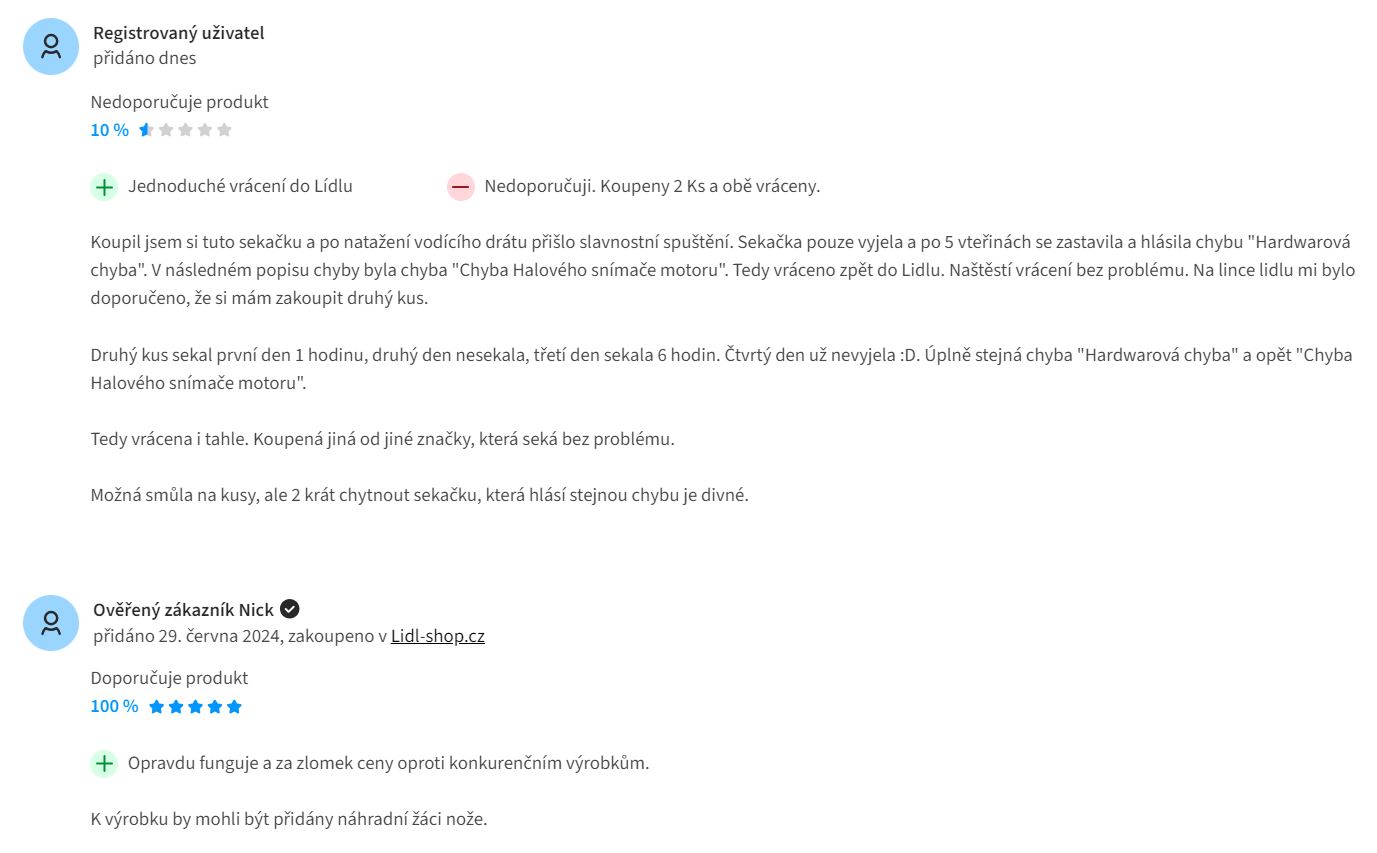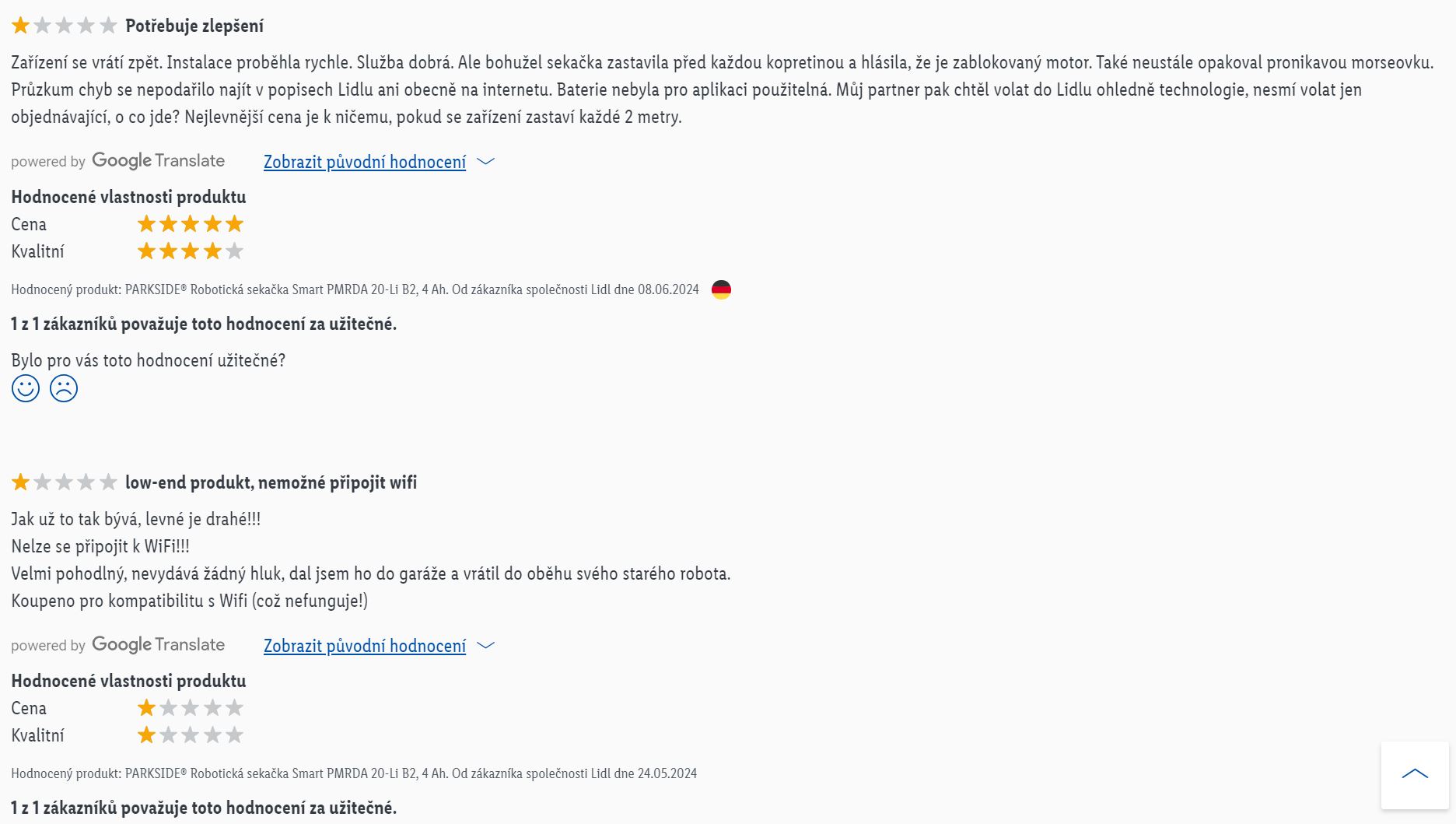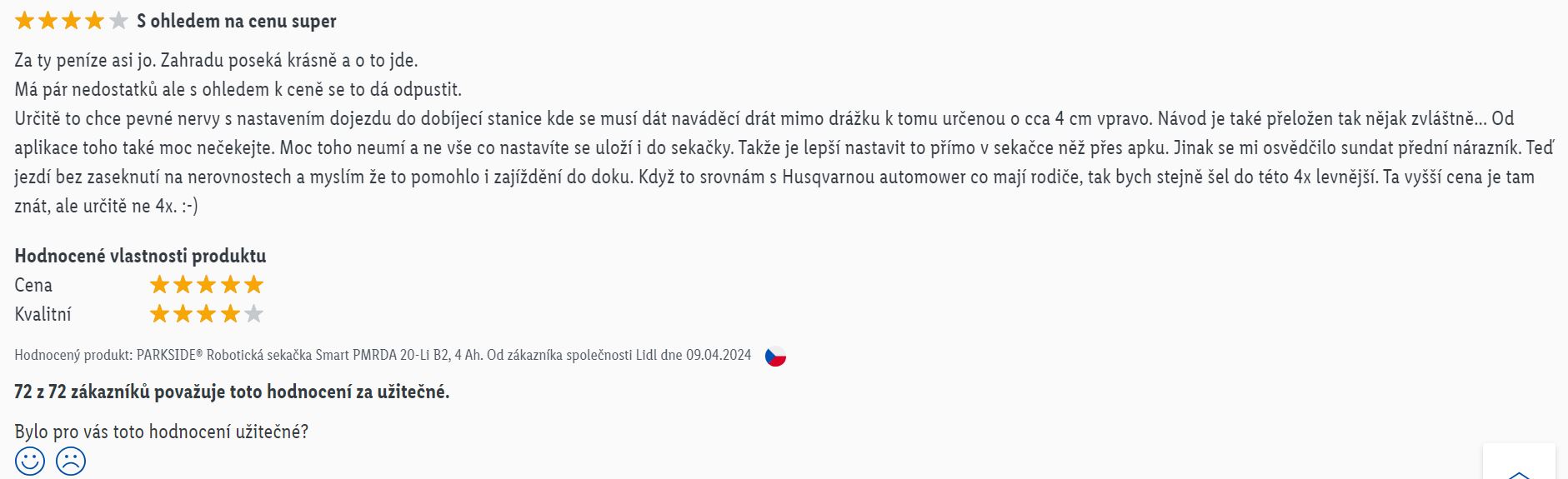 Najdou se ale také negativní recenze a není jich zrovna málo. Uživatelé mají nejčastěji problémy s připojením k Wi-Fi, zasekáváním se sekačky o překážky, výskytem poruchových kusů či s plánováním. Komplikace se zdoláváním nerovností a vyšších trsů trávy někdy úspěšně řeší demontáží nárazníku. Jinak se zpravidla schylují k vrácení či reklamaci, které jev Lidlu naštěstí zpravidla rychlé a bezproblémové.