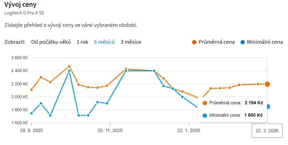 Foto: Oficiální materiály distributoraNaposledy se Logitech G Pro X SE prodávala za průměrnou cenu 2 194 Kč