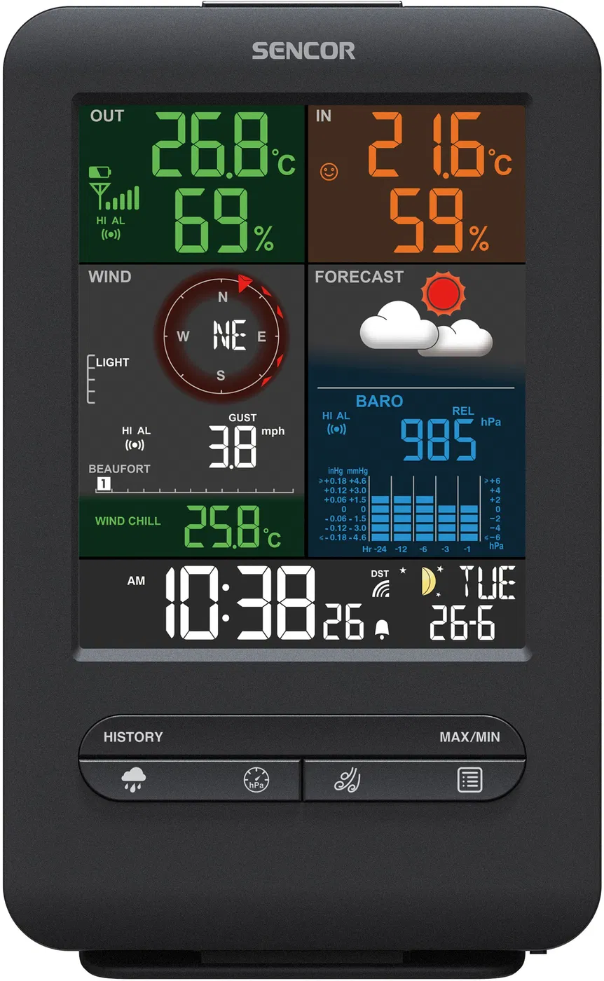 • Budík a paměť – K dispozici jsou rádiem řízené hodiny (DCF77) či budík s možností opakovaného buzení. Meteostanice Sencor vás také upozorní před náledím či nízkou teplotou a díky paměti a historii měření lze zobrazit přehledný trend změny počasí či minimální a maximální hodnoty.
