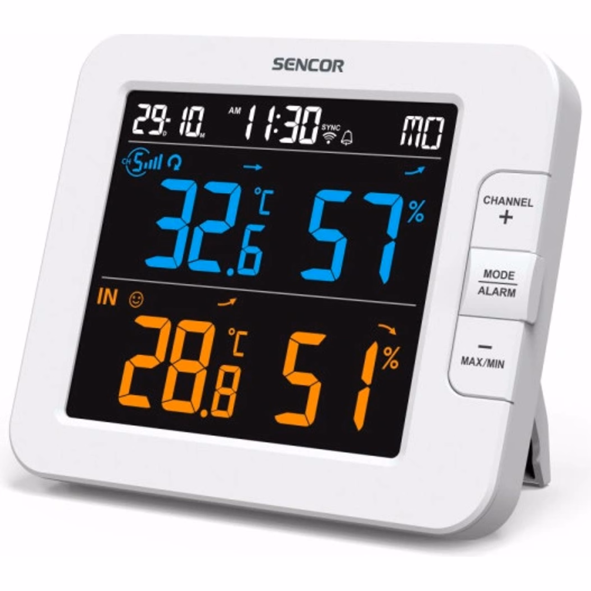 - Bezdrátová čidla a instalace – Meteostanice Sencor je dodávána s bezdrátovým venkovním čidlem o dosahu až 150 m. Samotné zařízení je pak možno propojit s až 7 takovýmito bezdrátovými čidly. Meteostanici pak jednoduše postavíte na stůl, nebo pověsíte na zeď.